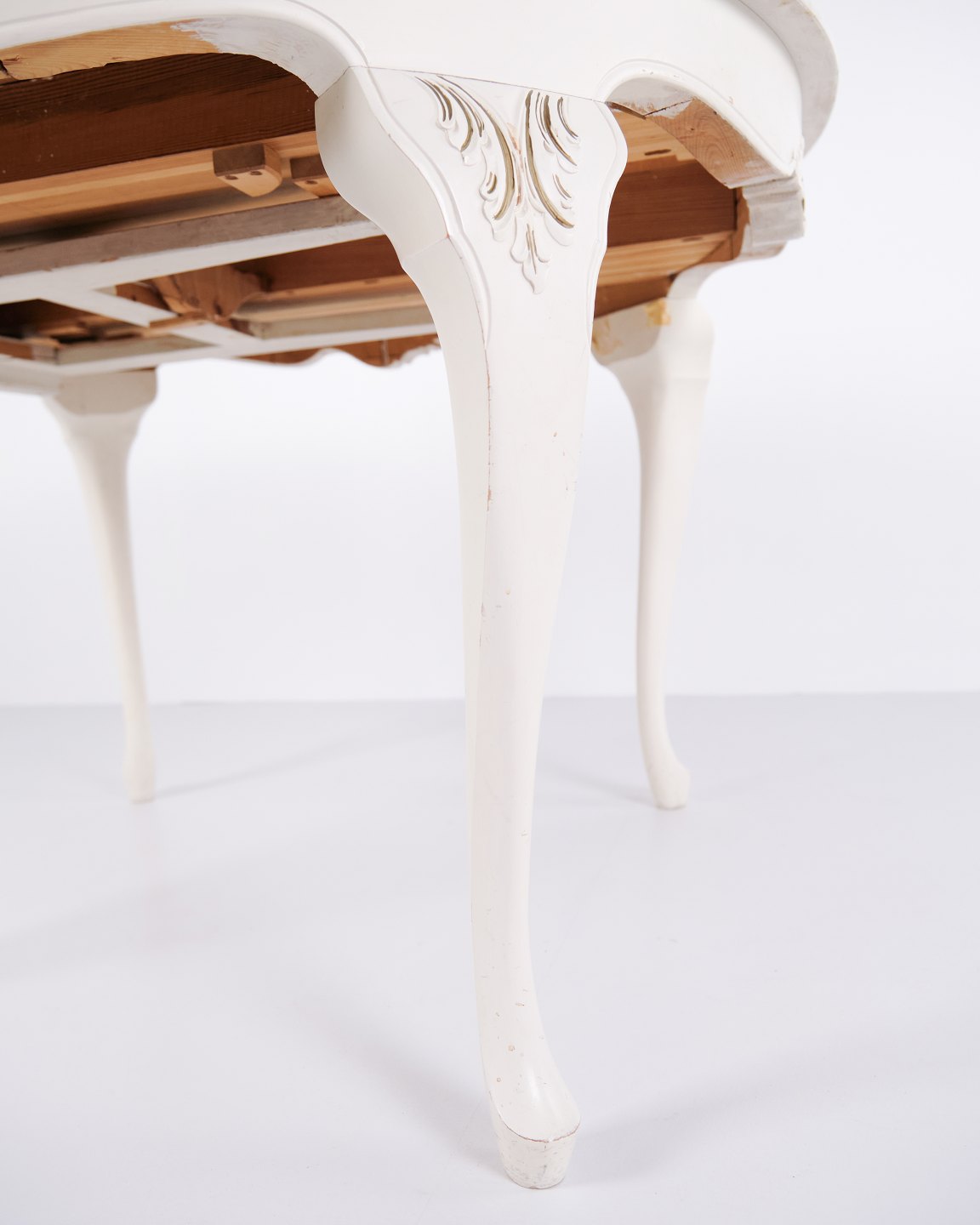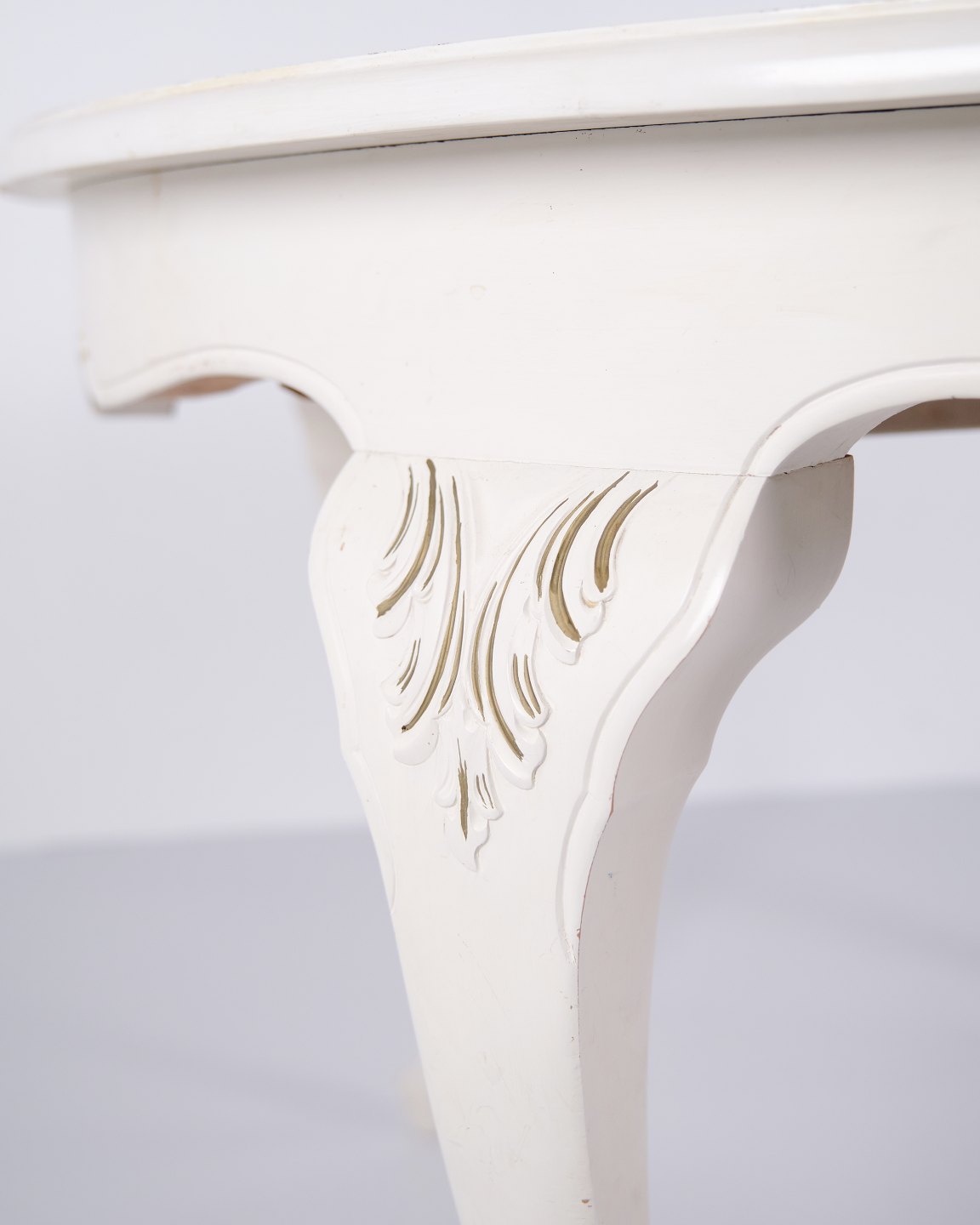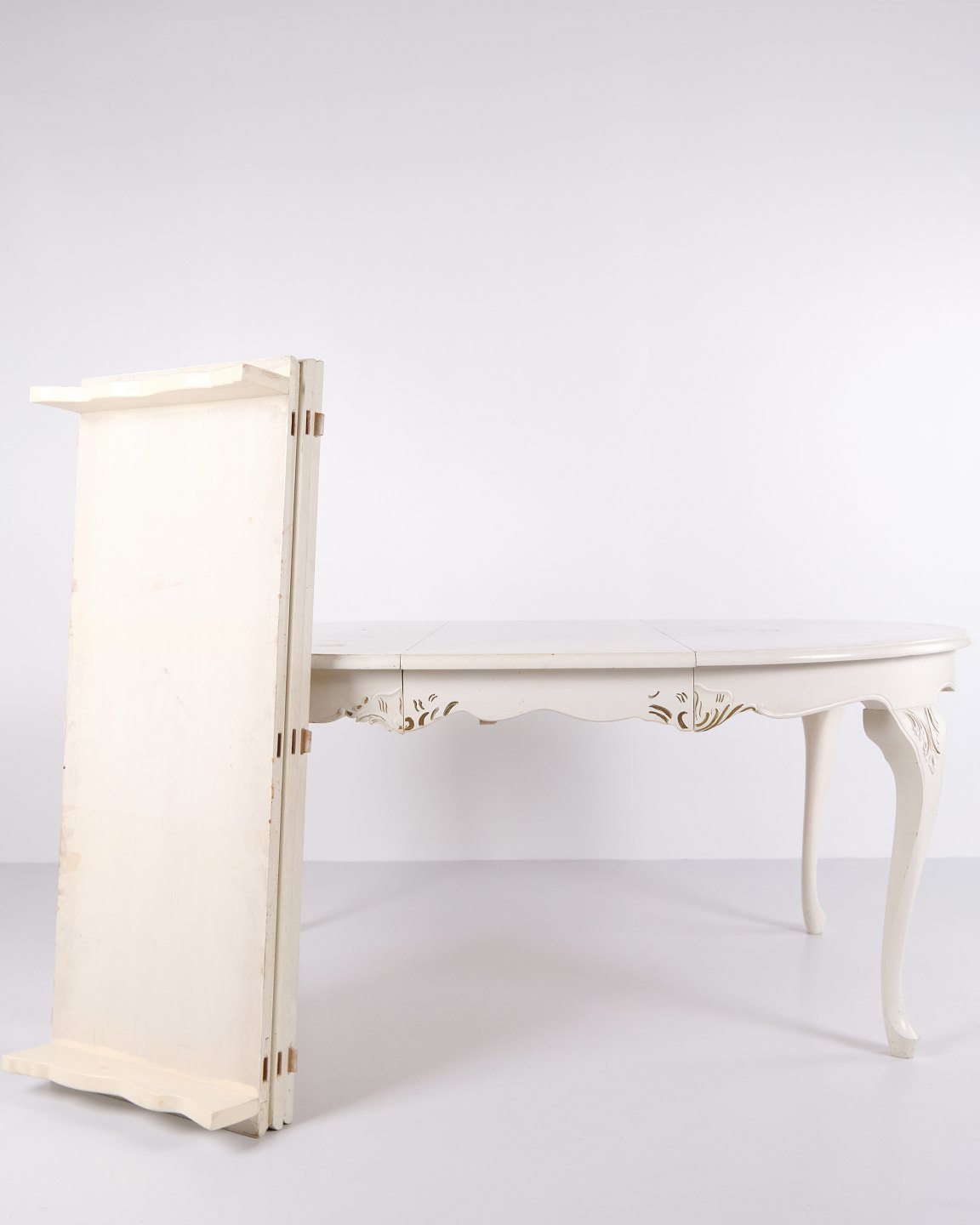 Antiker runder Esstisch im Neu-Rokoko Stil aus den 1920er Jahren. Weiß lackiert mit dekorativen Details und 4 Einlegeplatten.— Stil: Neu-Rokoko