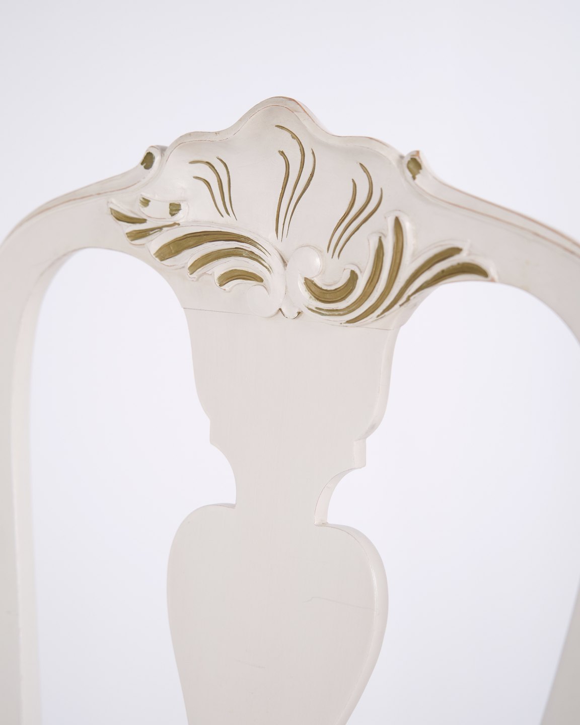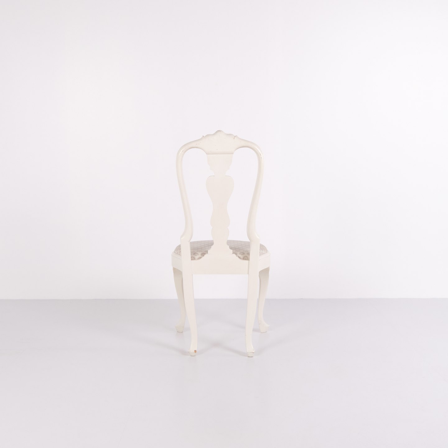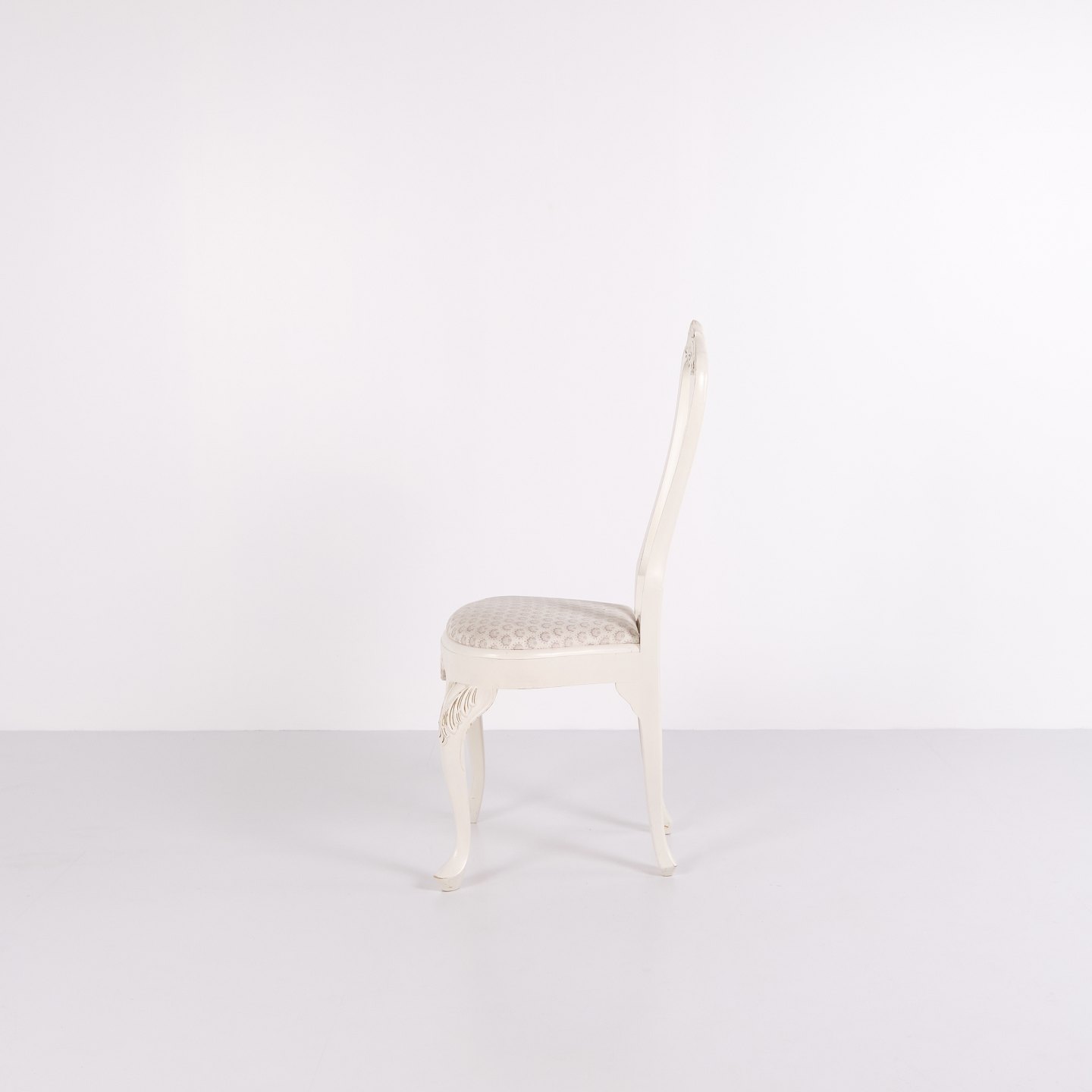 Antike Esszimmerstühle im Neu-Rokoko Stil aus den 1920er Jahren. Satz von 6 weiß lackierten Stühlen mit dekorativen Details.— Stil: Neu-Rokoko