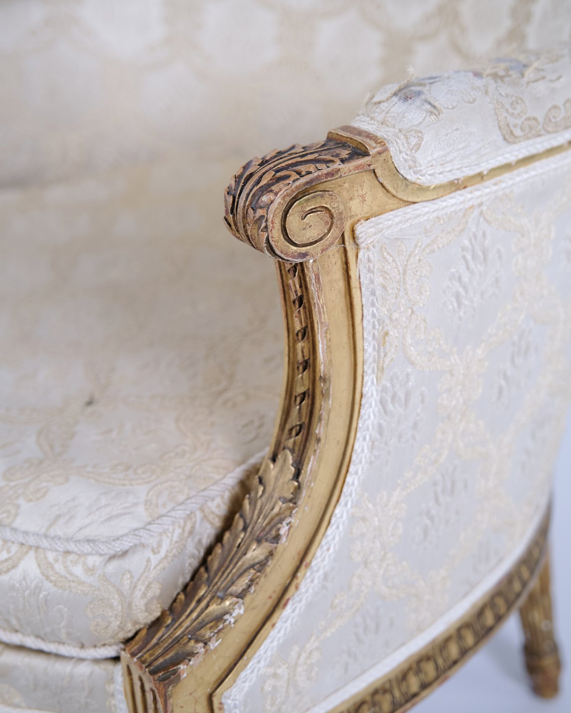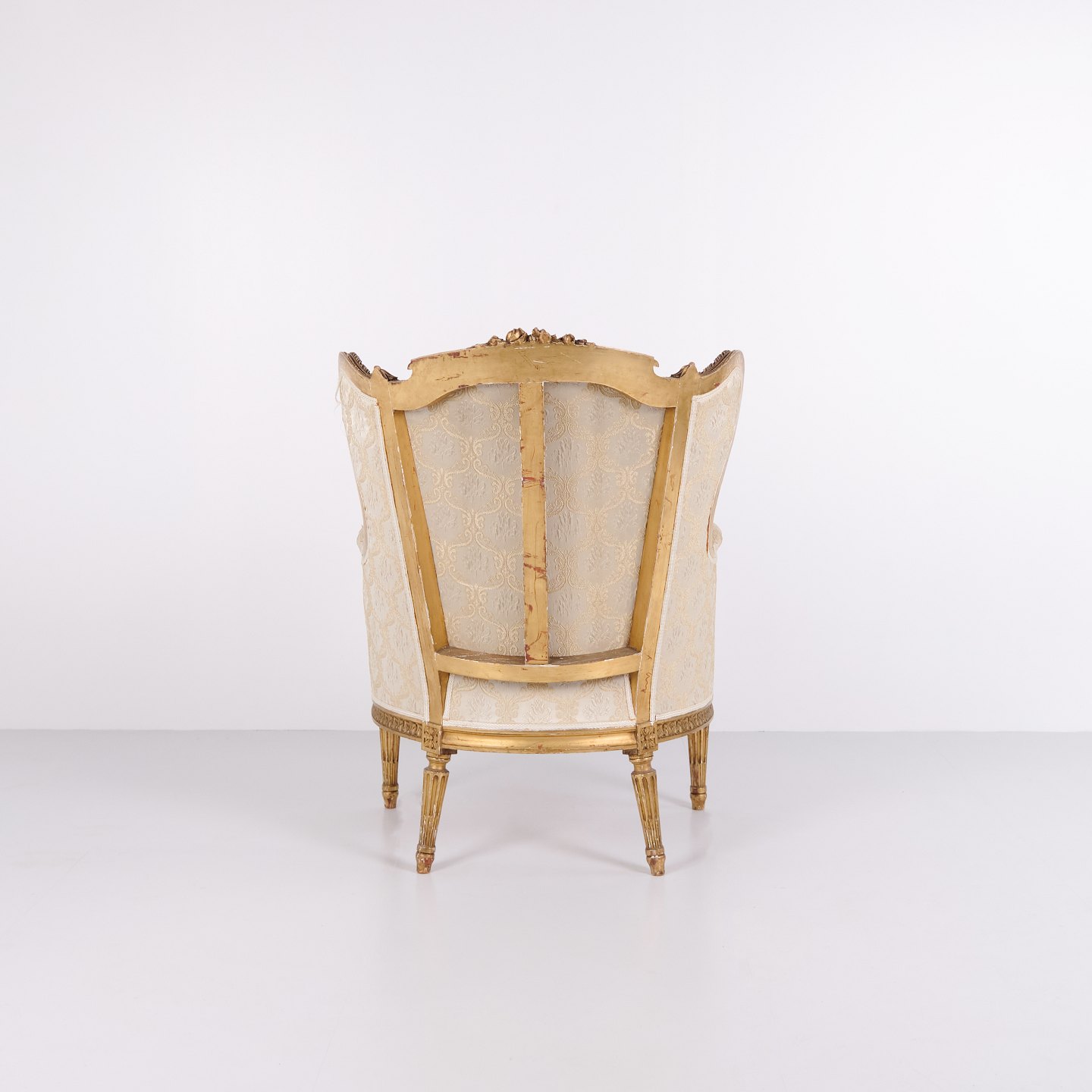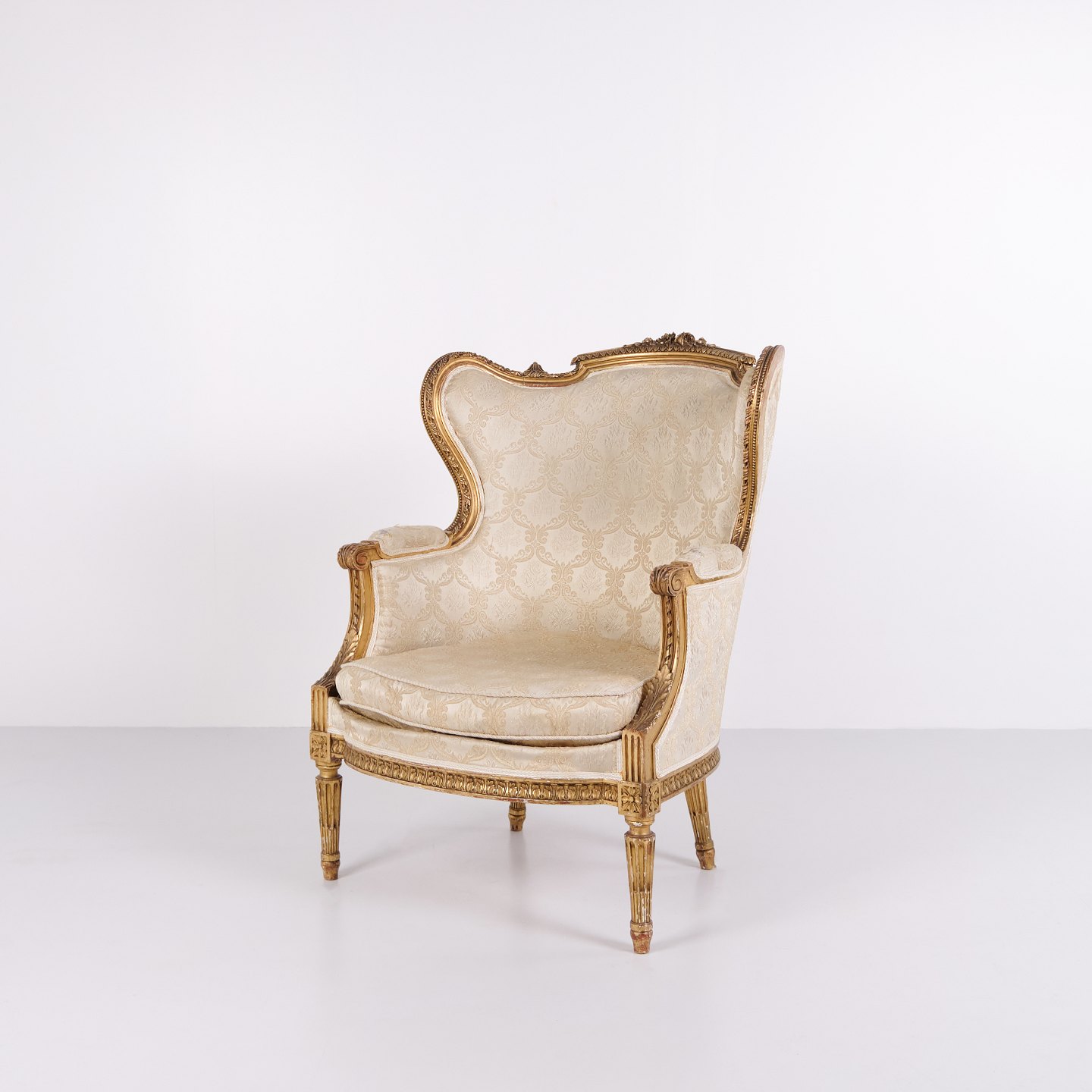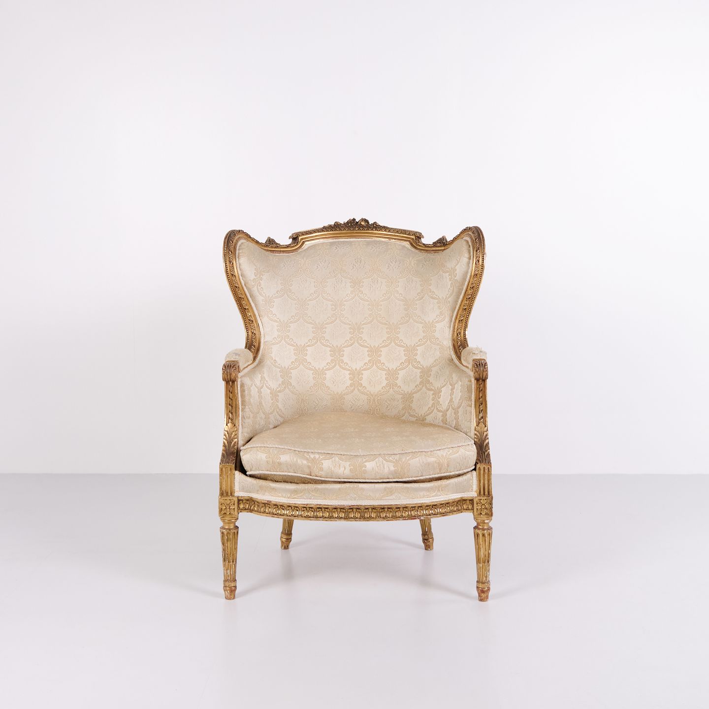 Antiker Bergère Sessel aus den 1860er Jahren im Louis XVI Stil. Vergoldetes Holz und heller Polsterstoff.— Stil: Louis XVI