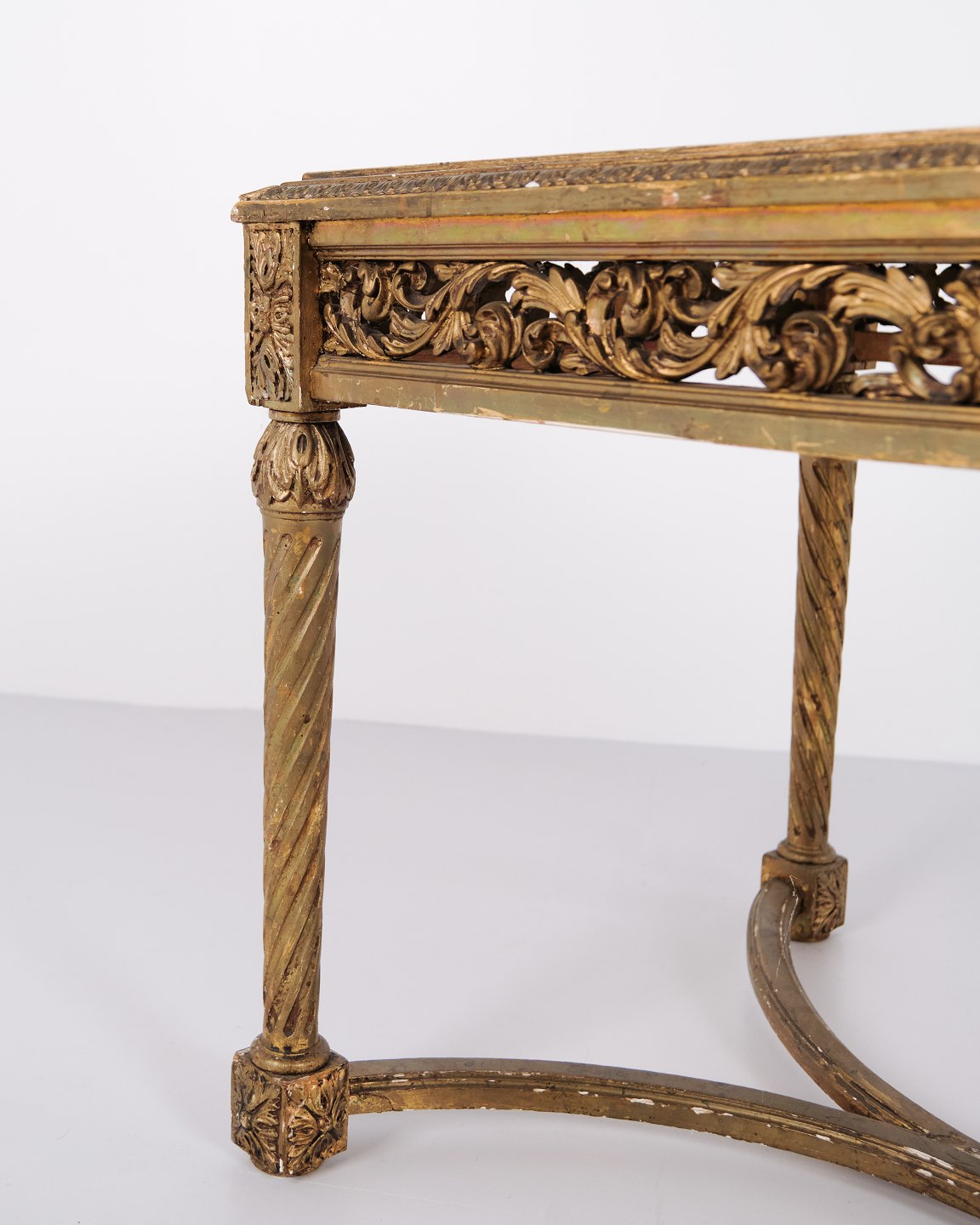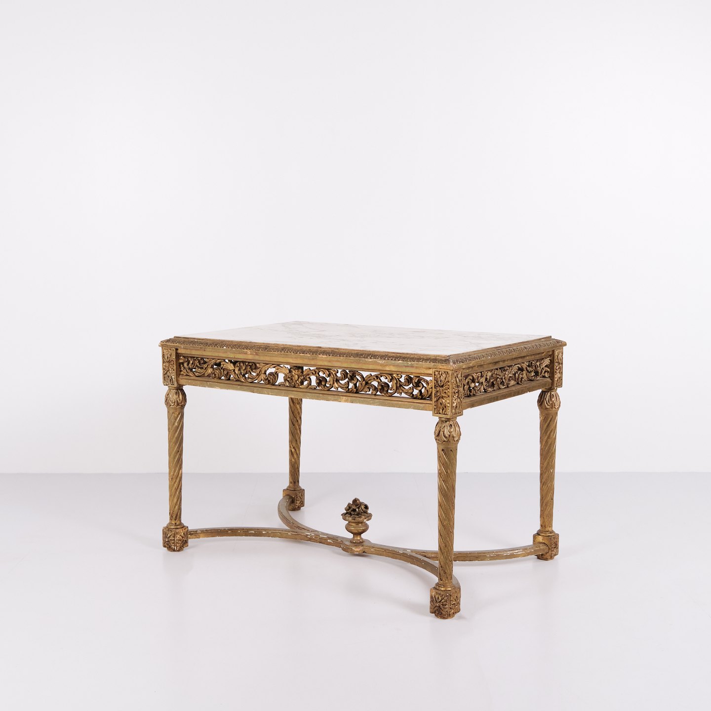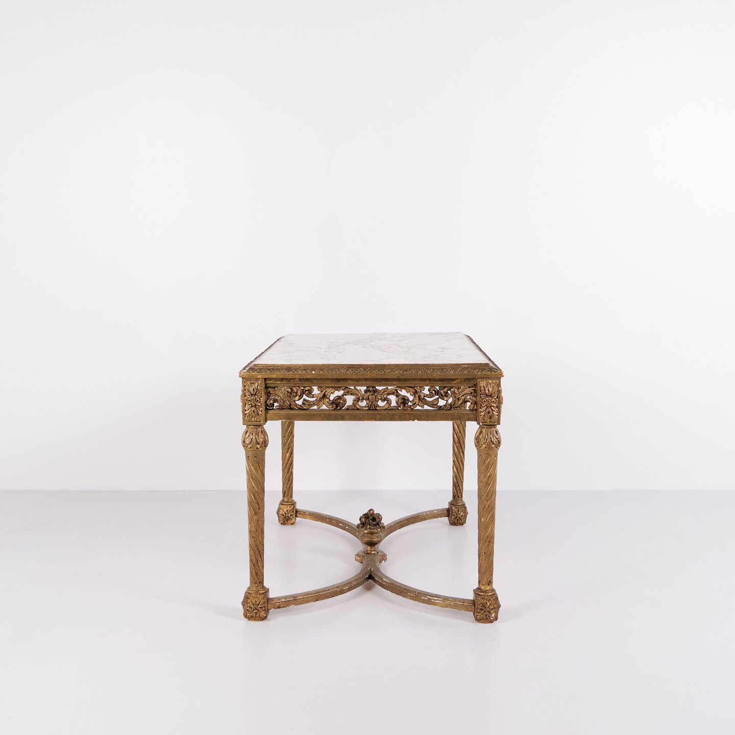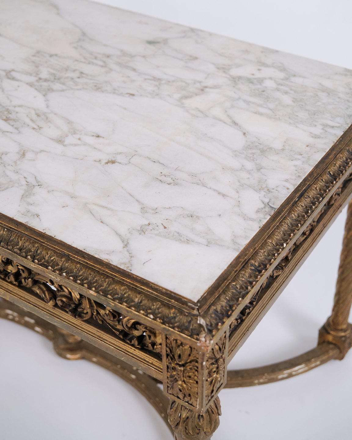 Antiker Louis XVI Salontisch aus den 1850er Jahren mit Marmorplatte, vergoldetem Holz und detaillierten Schnitzereien. Louis XVI Möbelstil des 19. Jahrhunderts.— Stil: Louis XVI