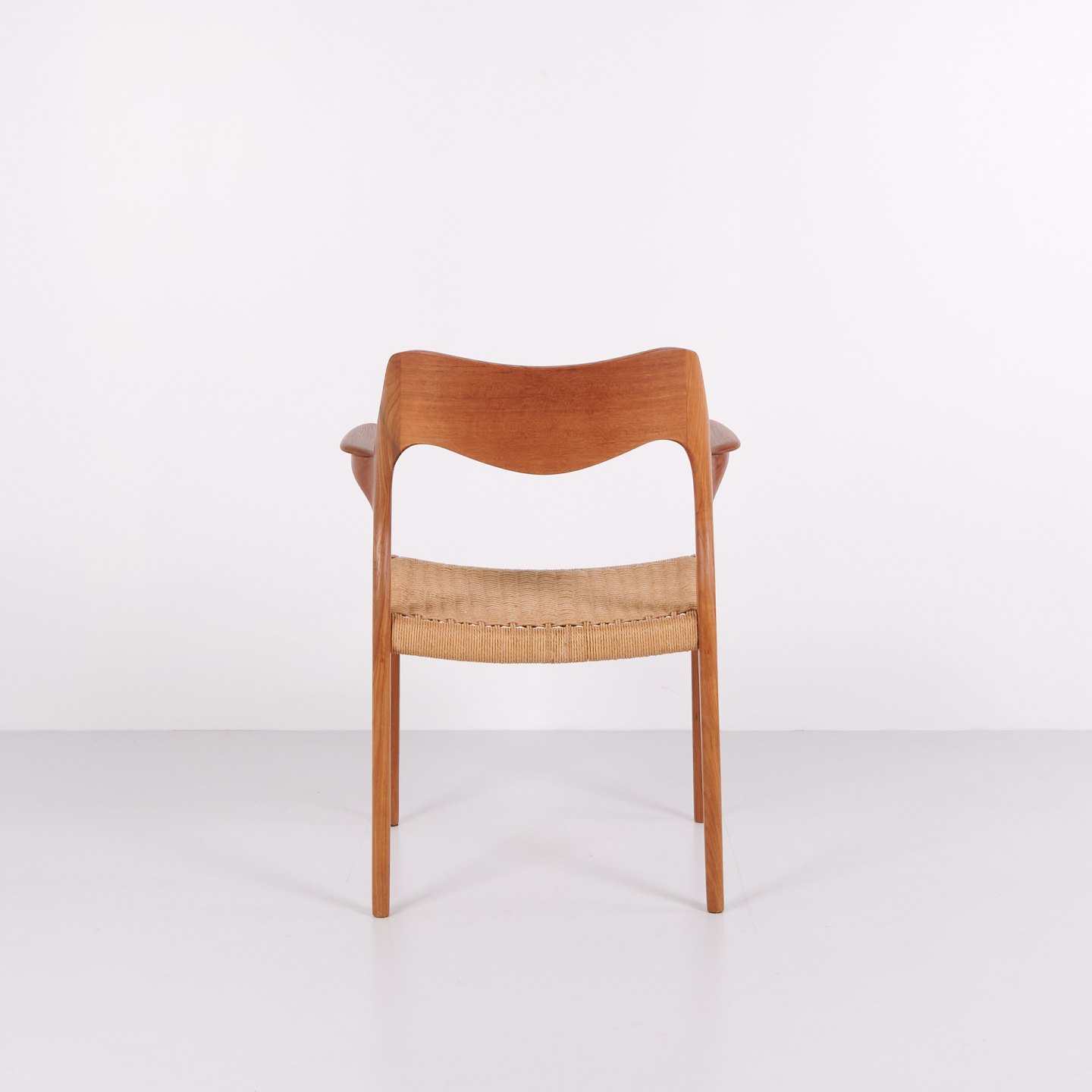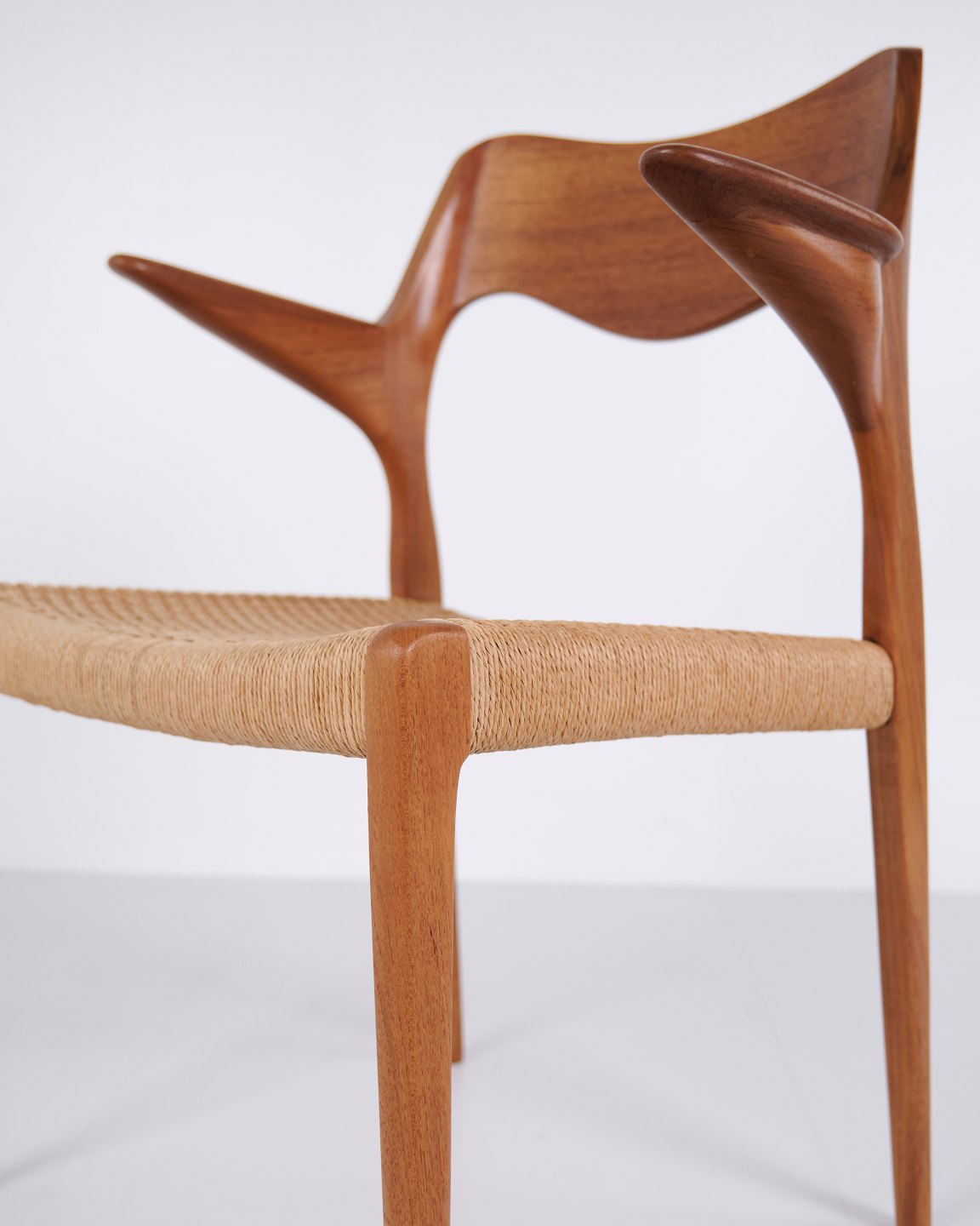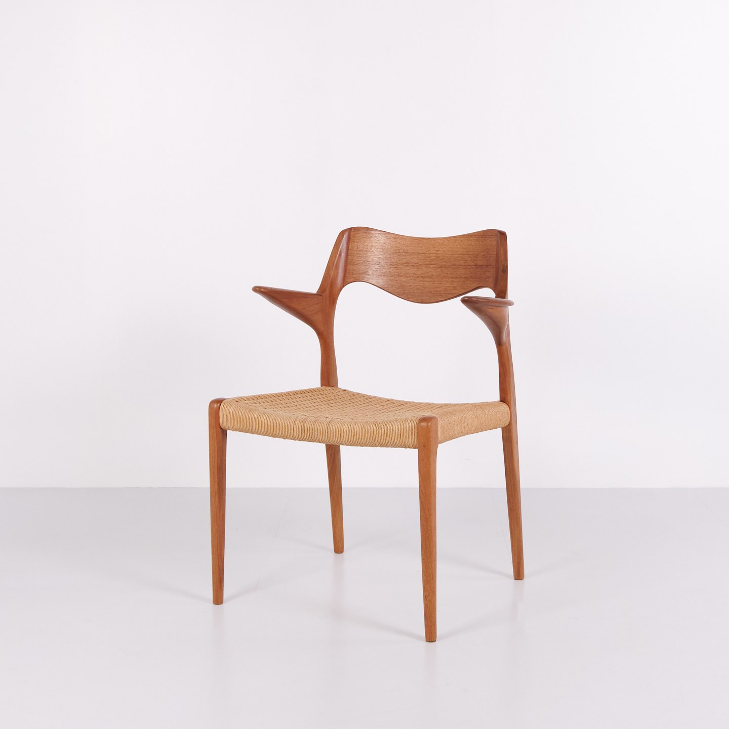 Modell 55 Esszimmerstuhl von N.O. Møller für J.L. Møllers Møbelfabrik in Teak und Geflecht aus den 1960er Jahren. Dänischer Designklassiker.— Designer: N.O. Møller