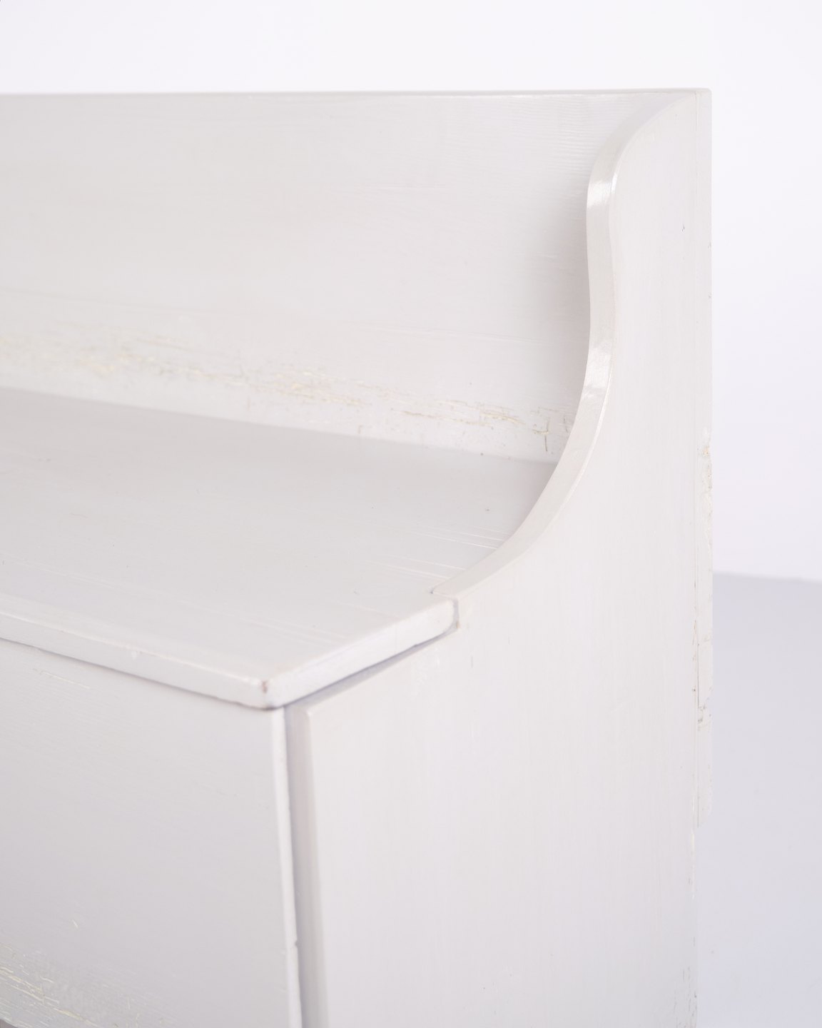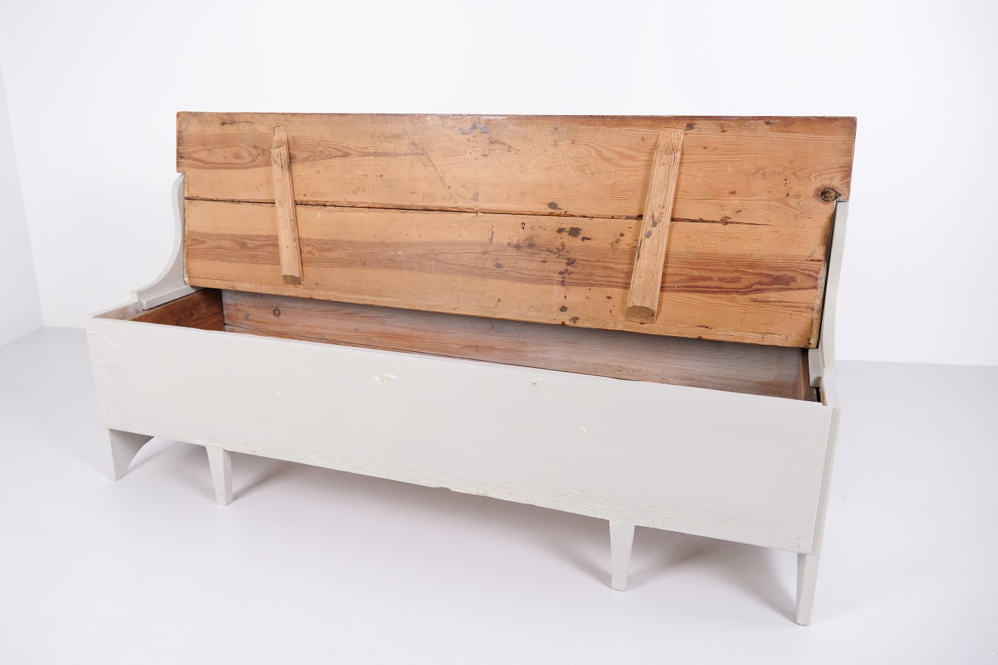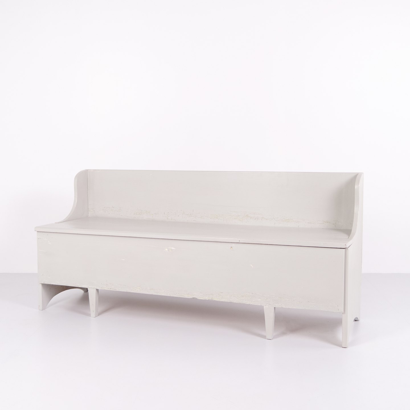 Antike Truhenbank aus den 1890er Jahren aus grau lackiertem Kiefernholz. Antike Aufbewahrungsbank aus dem 19. Jahrhundert.— Typ: Truhenbank mit Aufbewahrung