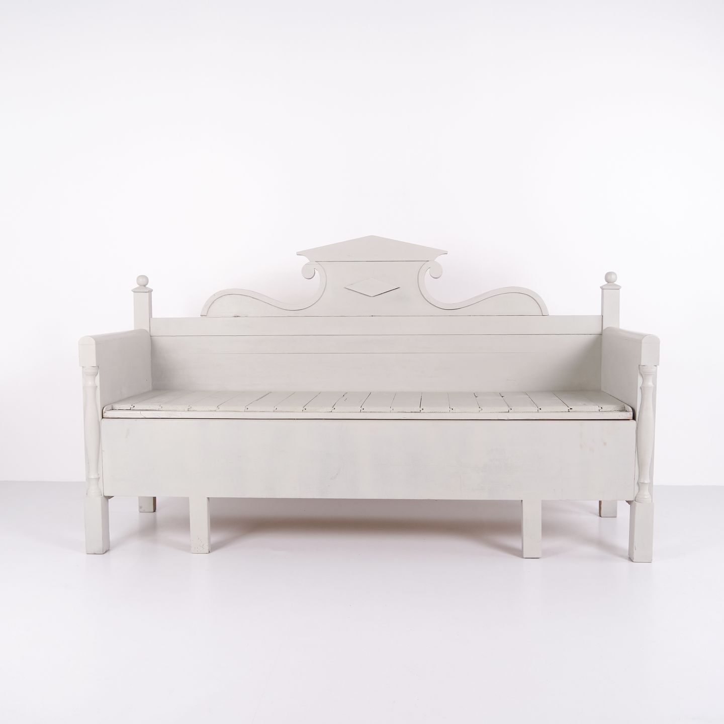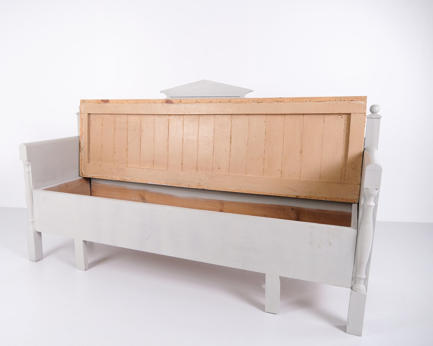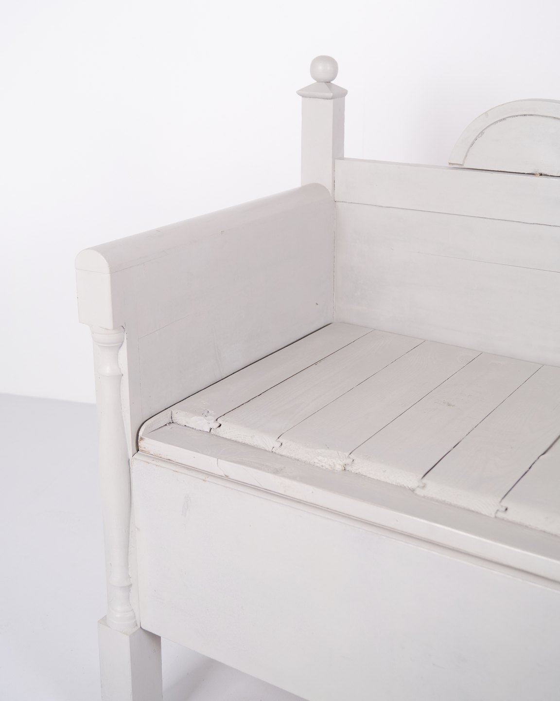 Antike Truhenbank aus den 1860er Jahren aus grau lackiertem Kiefernholz mit geschnitzten Details und Aufbewahrung. Antike Aufbewahrungsbank aus dem 19. Jahrhundert.— Typ: Truhenbank mit Aufbewahrung