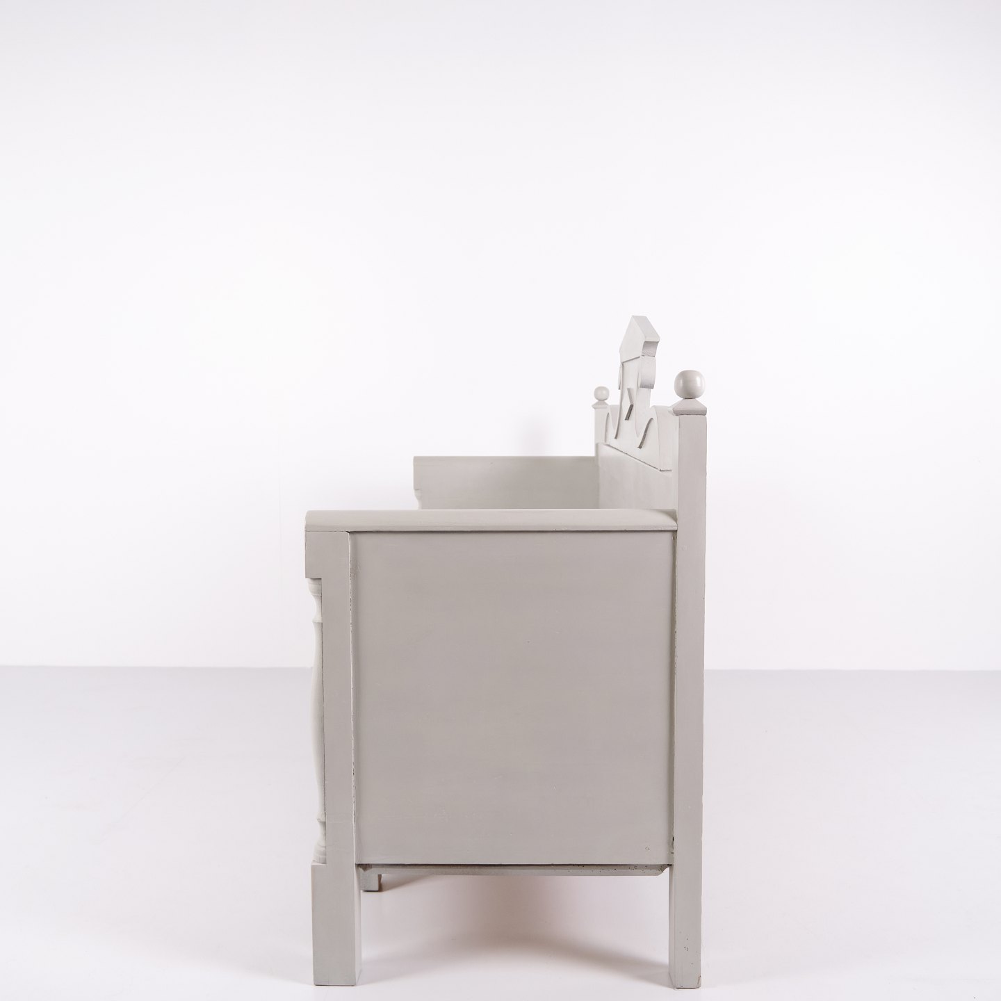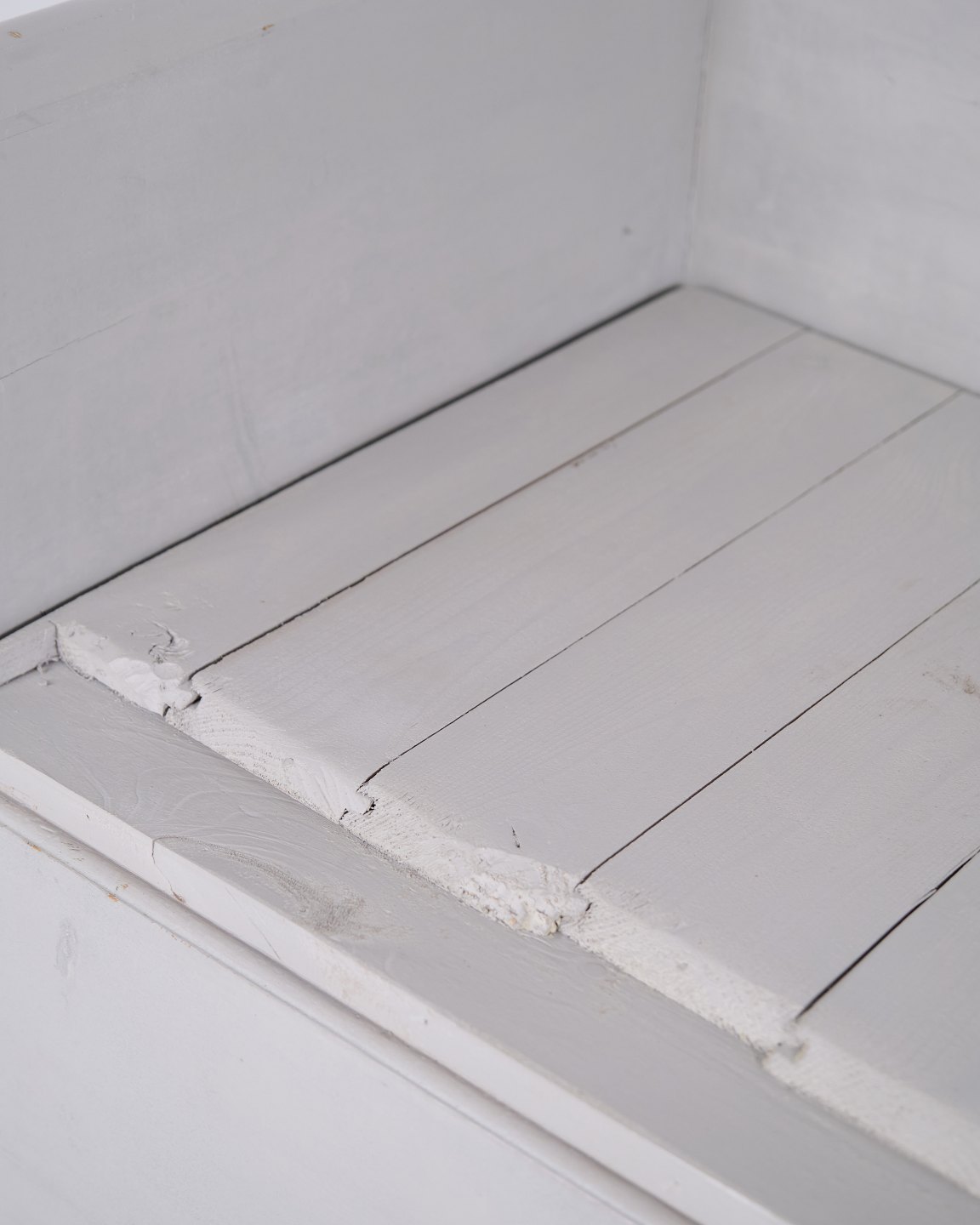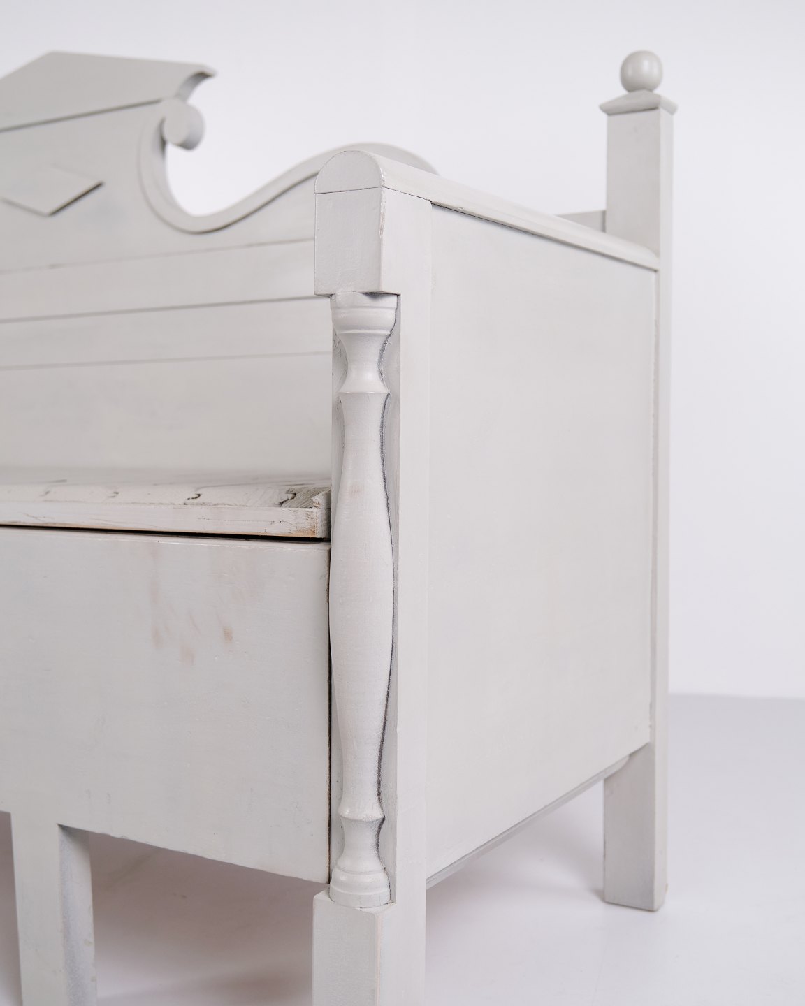 Antike Truhenbank aus den 1860er Jahren aus grau lackiertem Kiefernholz mit geschnitzten Details und Aufbewahrung. Antike Aufbewahrungsbank aus dem 19. Jahrhundert.— Typ: Truhenbank mit Aufbewahrung