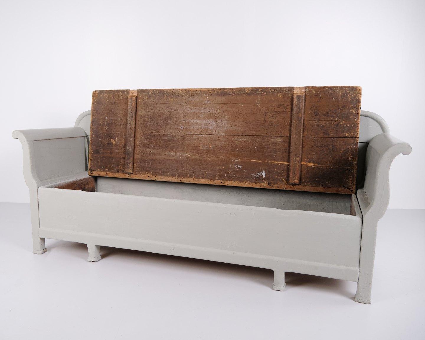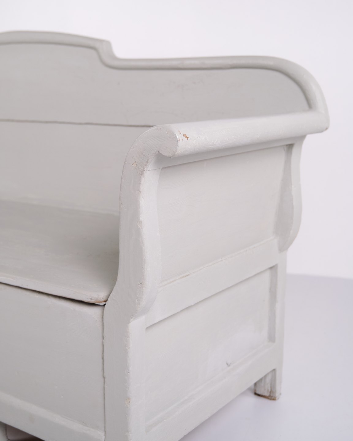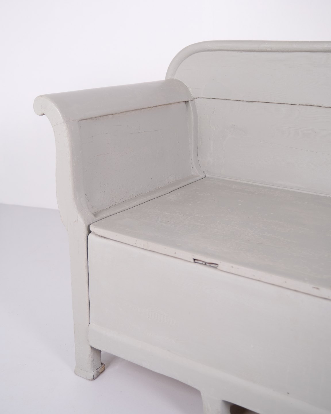 Antike Truhenbank aus den 1890er Jahren aus grau lackiertem Kiefernholz. Antike Aufbewahrungsbank aus dem 19. Jahrhundert.— Typ: Truhenbank mit Aufbewahrung