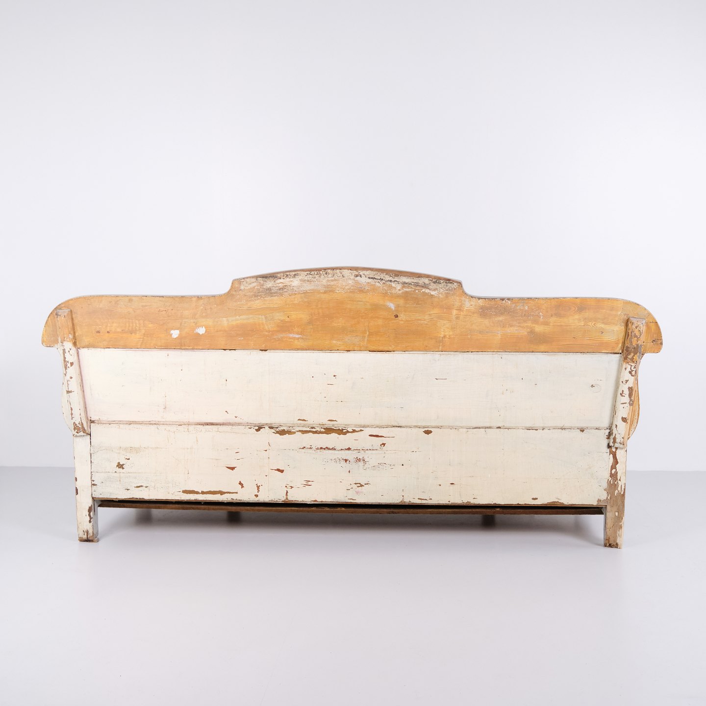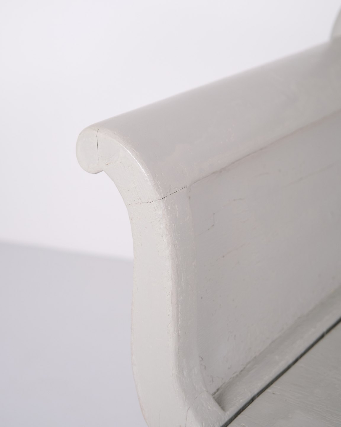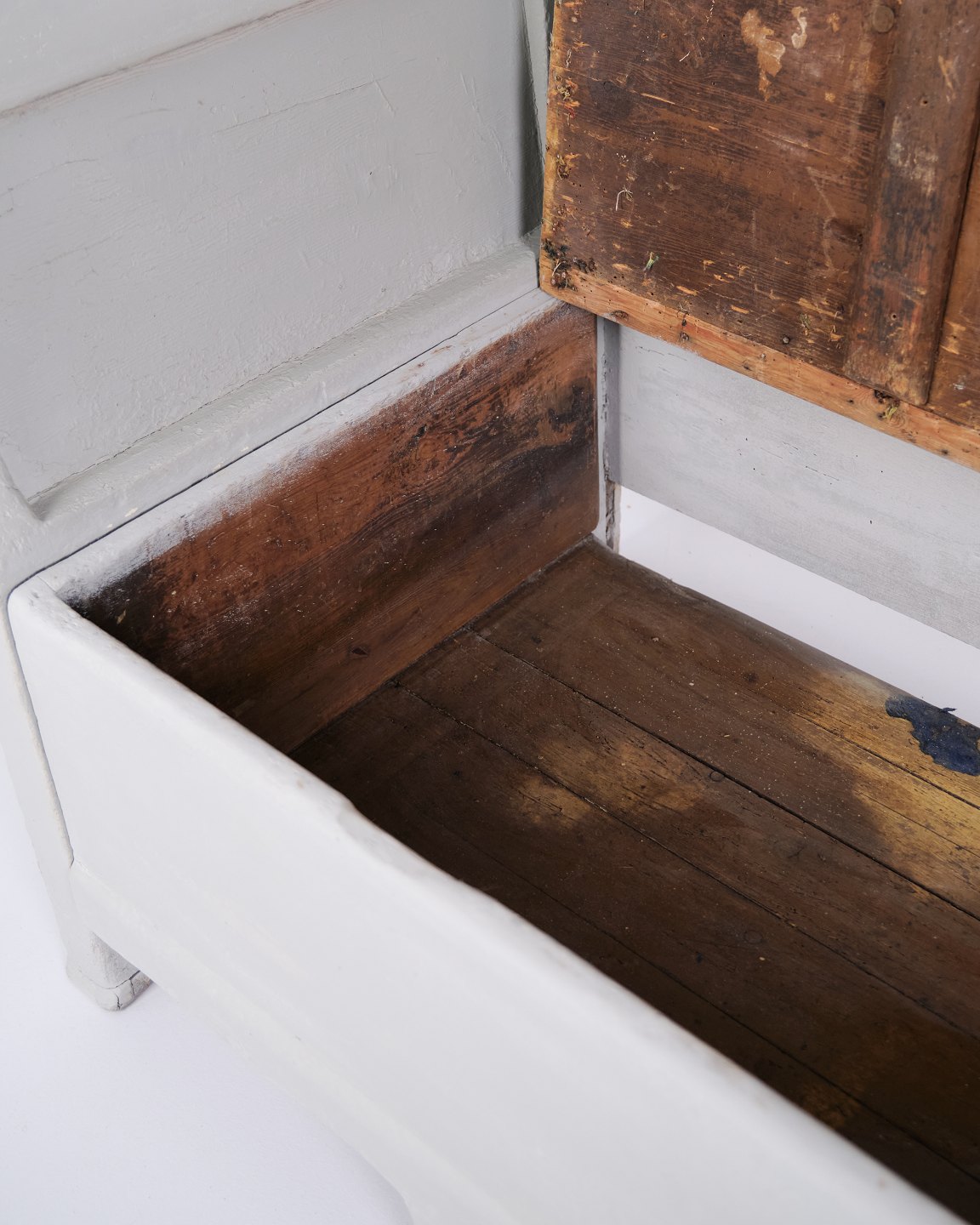 Antike Truhenbank aus den 1890er Jahren aus grau lackiertem Kiefernholz. Antike Aufbewahrungsbank aus dem 19. Jahrhundert.— Typ: Truhenbank mit Aufbewahrung