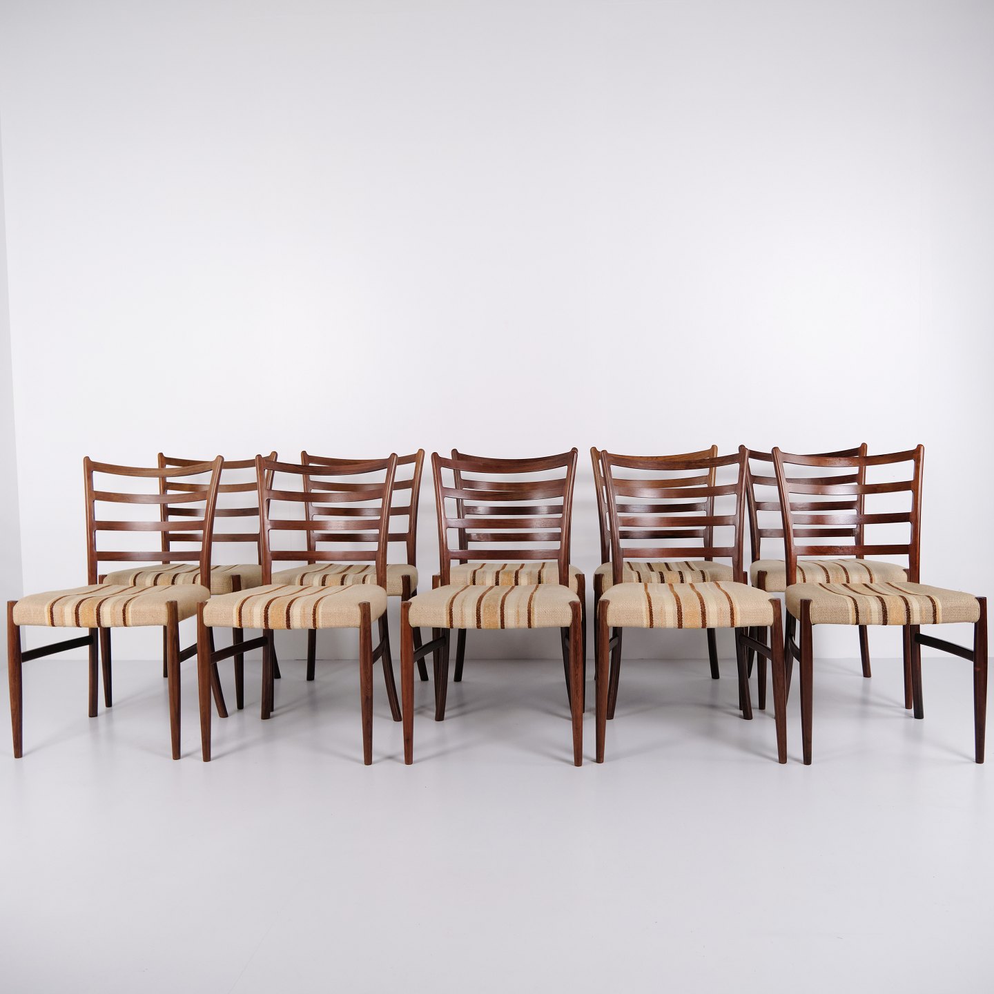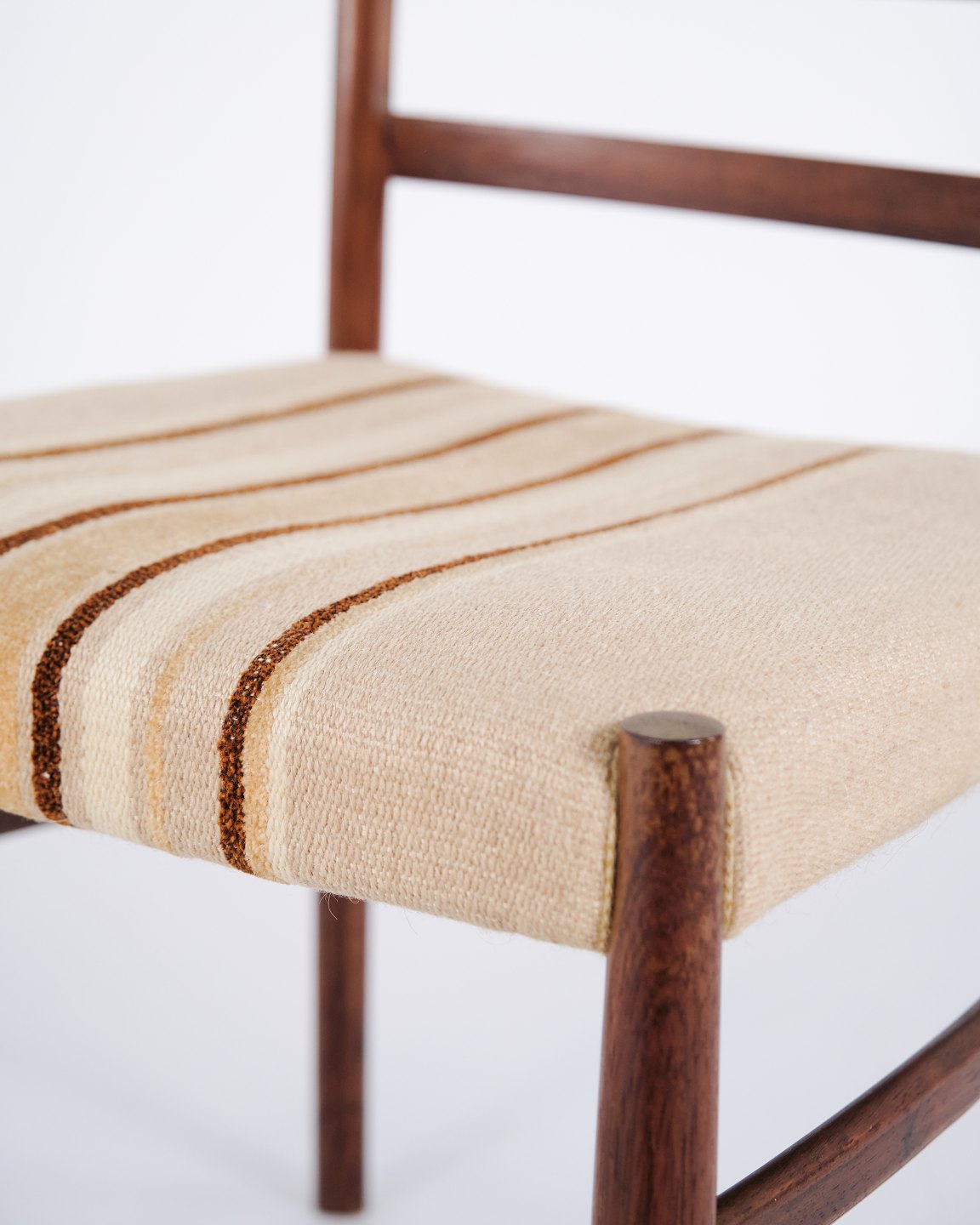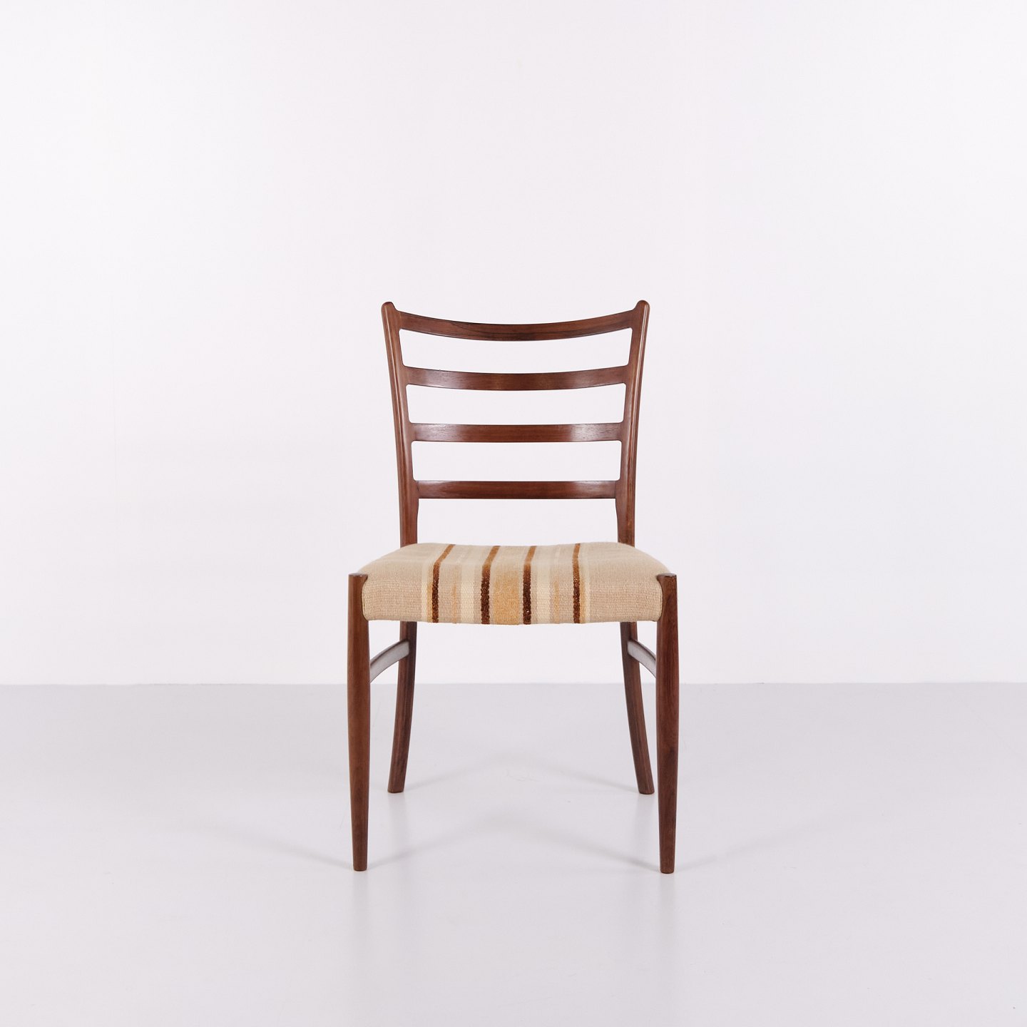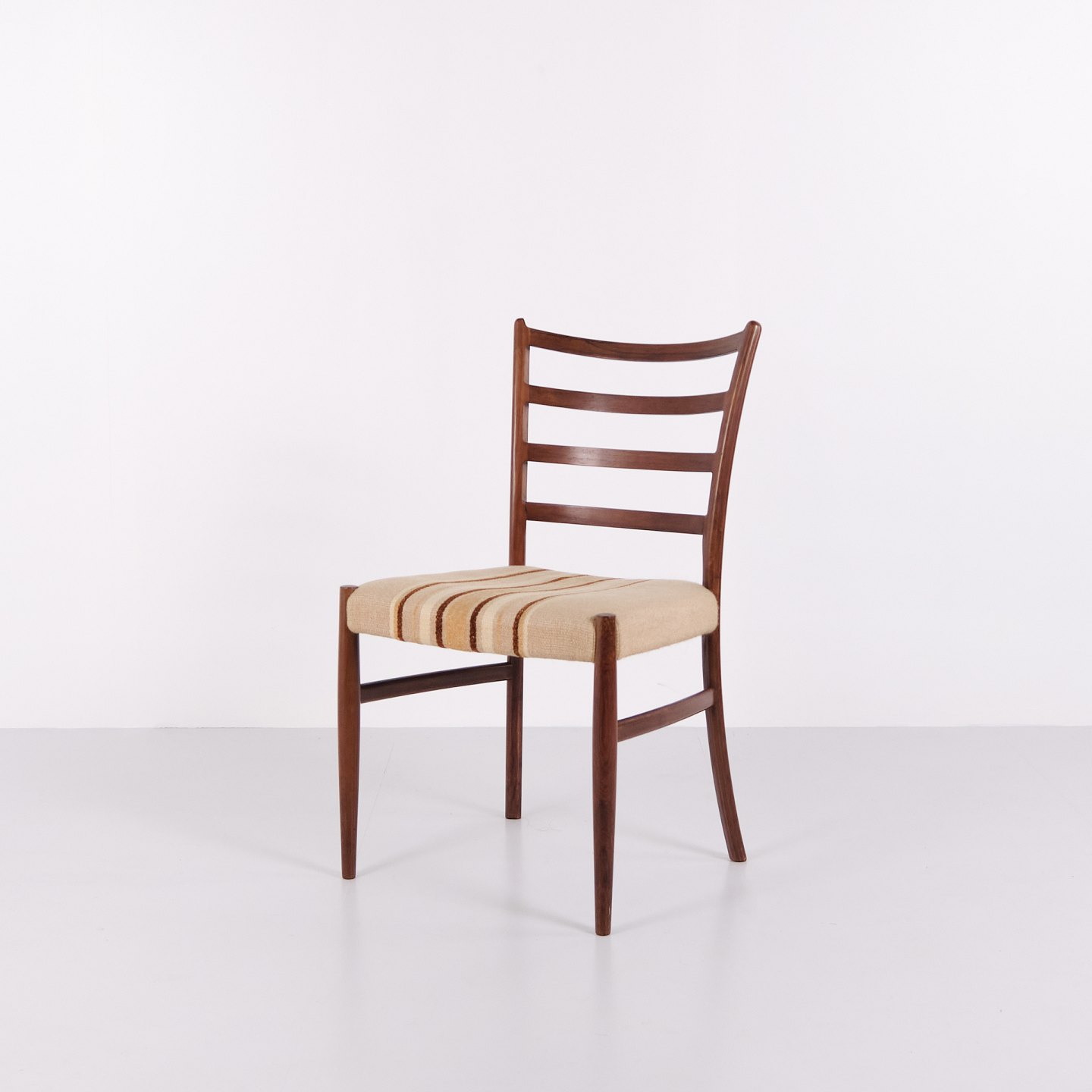 Esszimmerstühle von N.O. Møller aus Palisander mit gestreifter Polsterung aus den 1960er Jahren. Entwurf von J.L. Møllers Møbelfabrik.— Designer: N.O. Møller