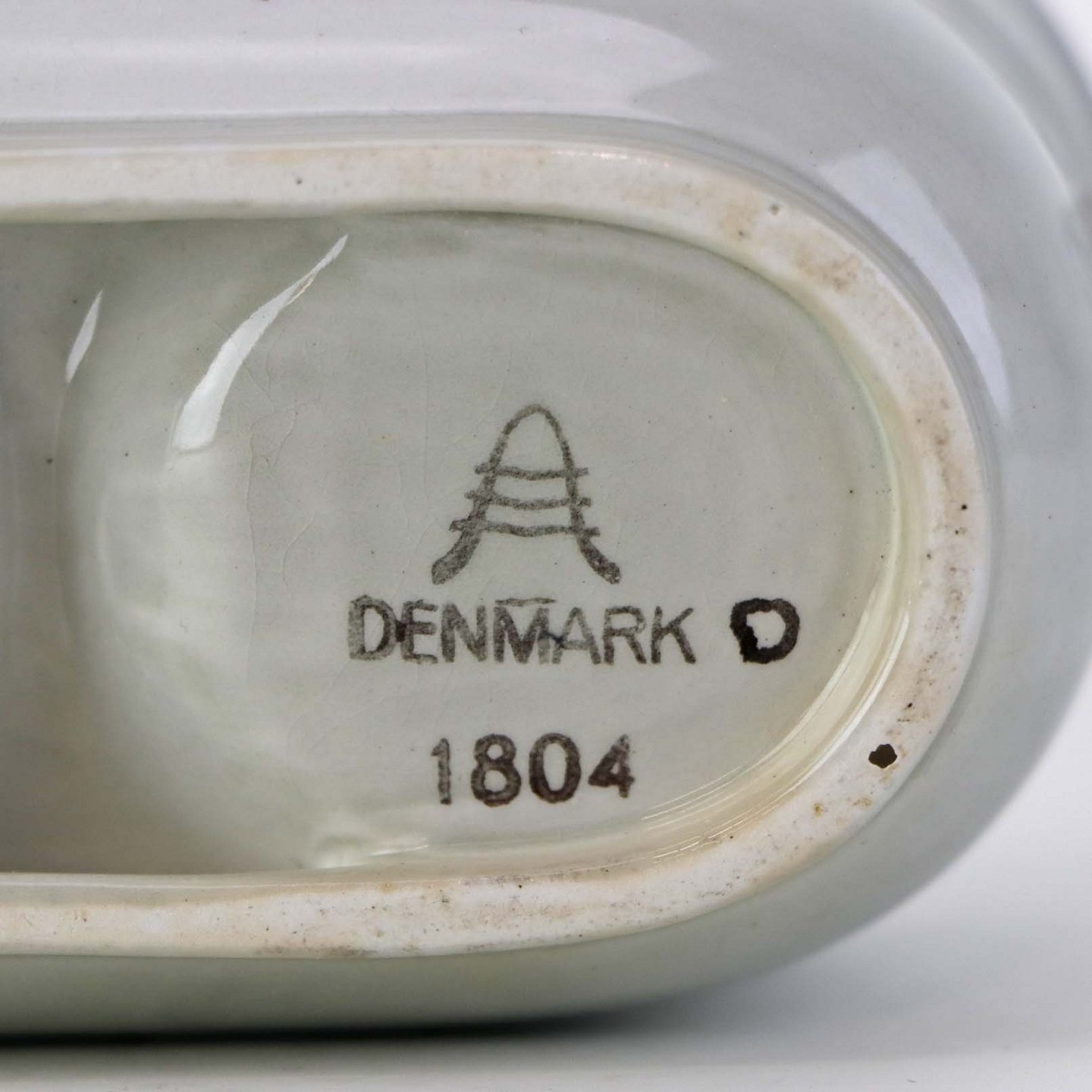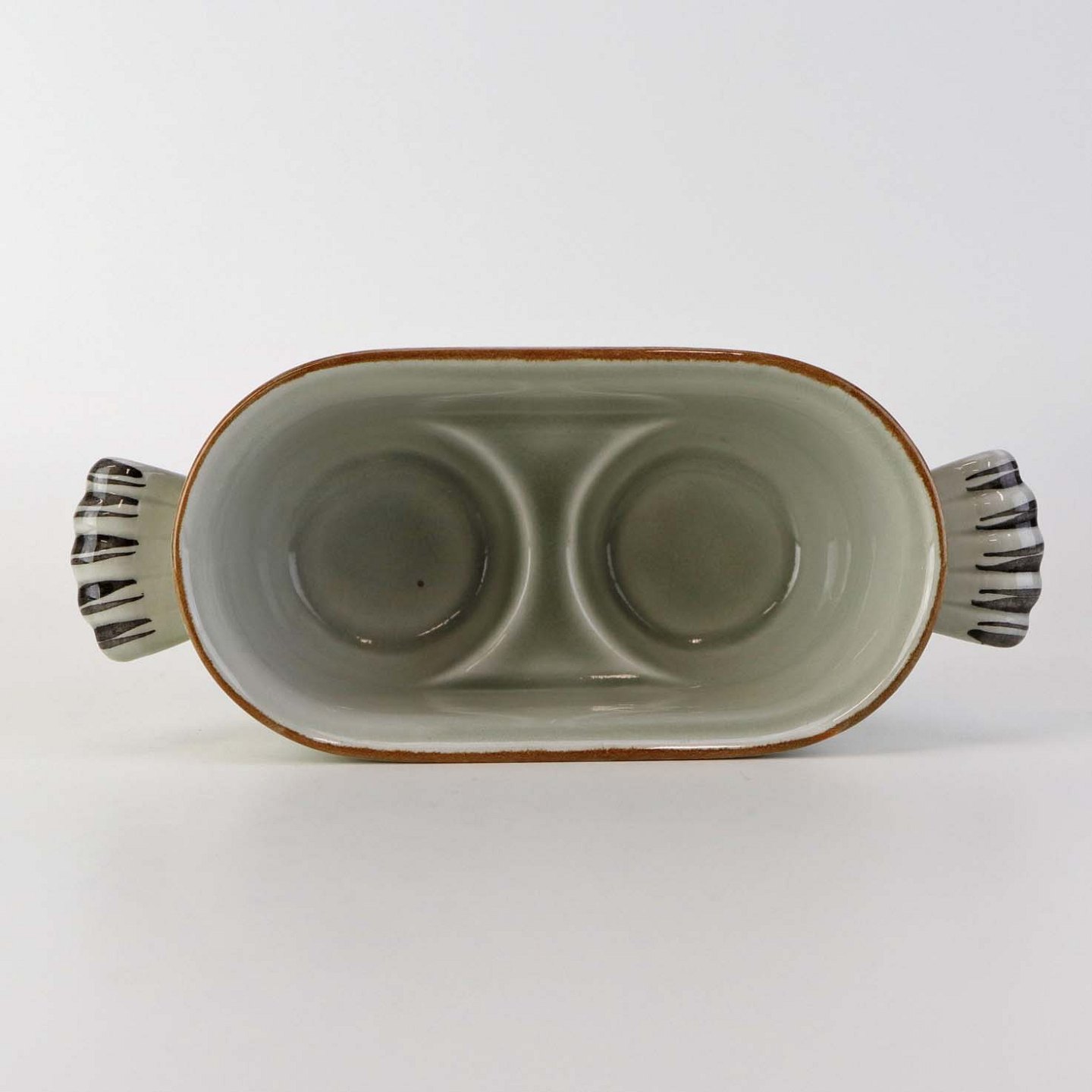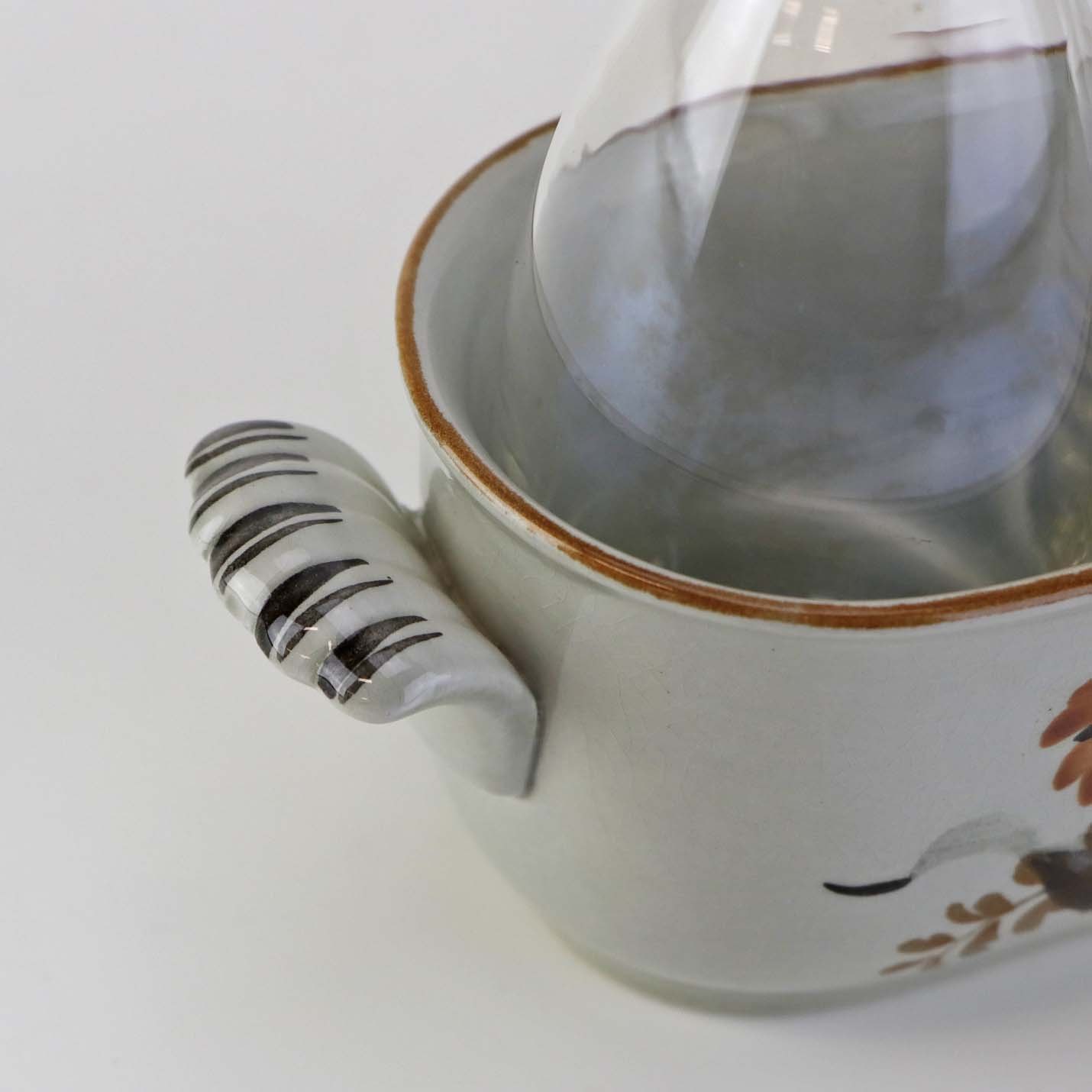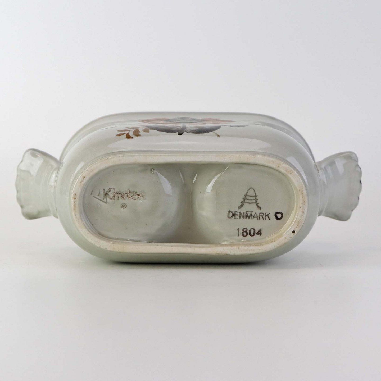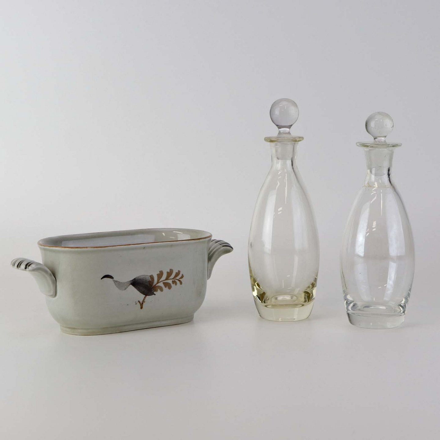 Sæt med to glasflasker til olie og eddike med prop i kar med hanke af fajance fra stellet Kirsten, som blev fremstillet i perioden 1934-1957. Fomgiver Nils Thorsson