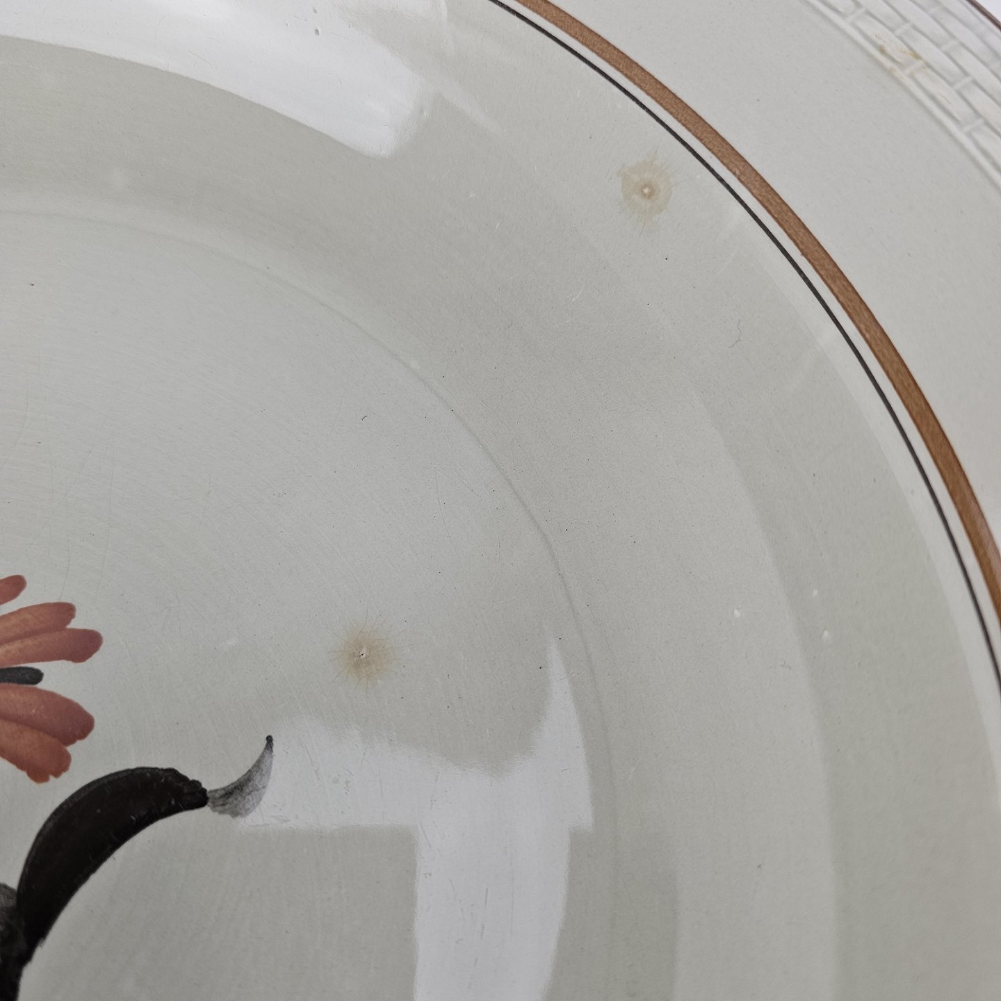 Kirsten er stel i grå fajance med brun kant og blomstermotiv