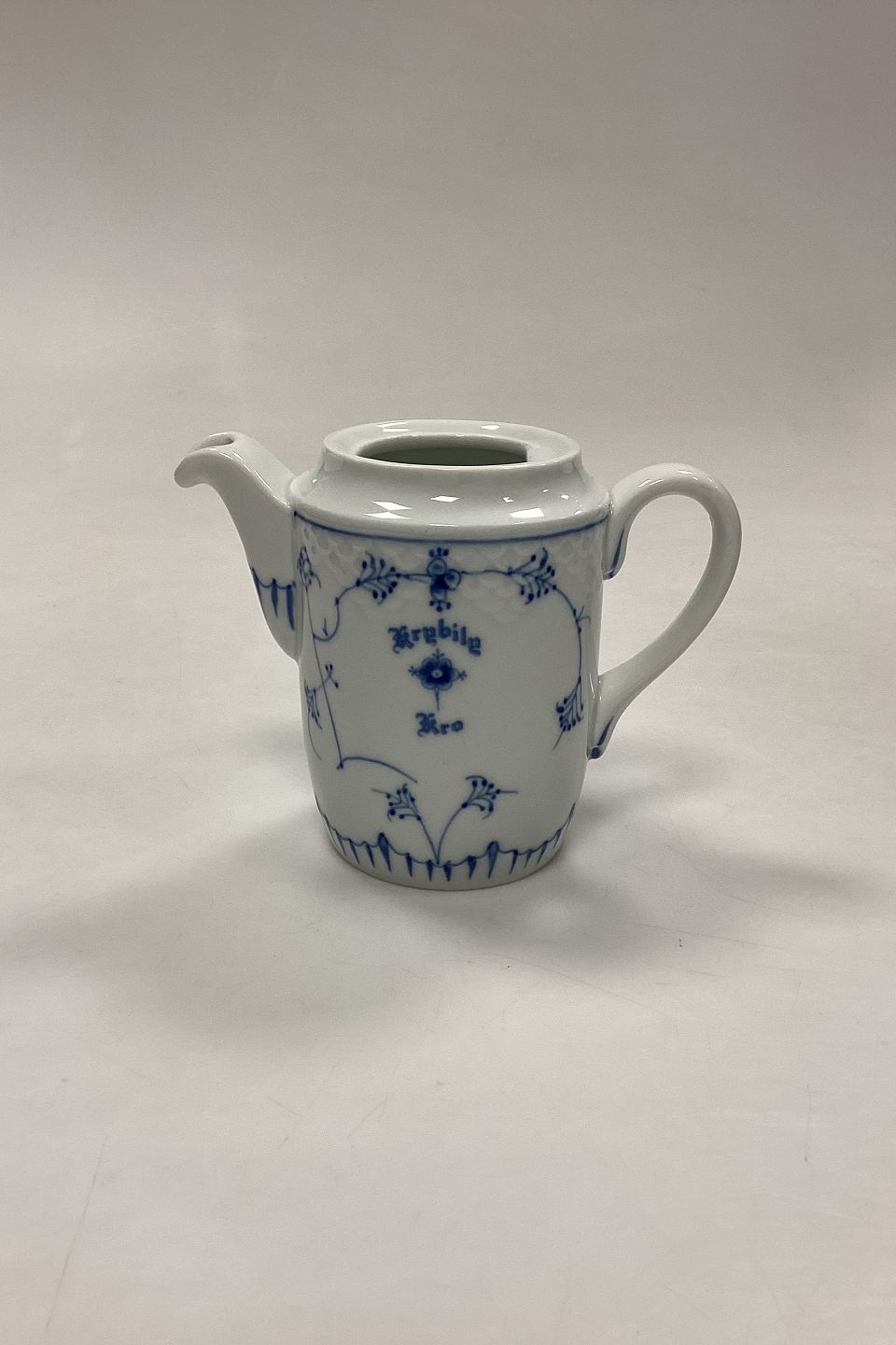 Bing og Grøndahl Blåmalet Musselmalet Hotel med Logo Kaffekande No. 820. Logo fra Krybily (Kryb i Ly) Kro. Måler 11 cm / 4,33 in. Mangler låg.