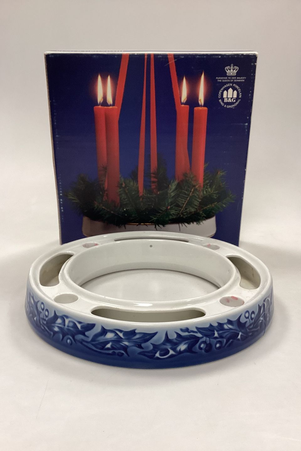 Bing og Grøndahl Adventskrans / Lysestage No. 9217. Dekoreret med Kristtjørn i hvidt og blåt.Måler 4 cm x 25 cm / 1,57 in. x 9,84 in.