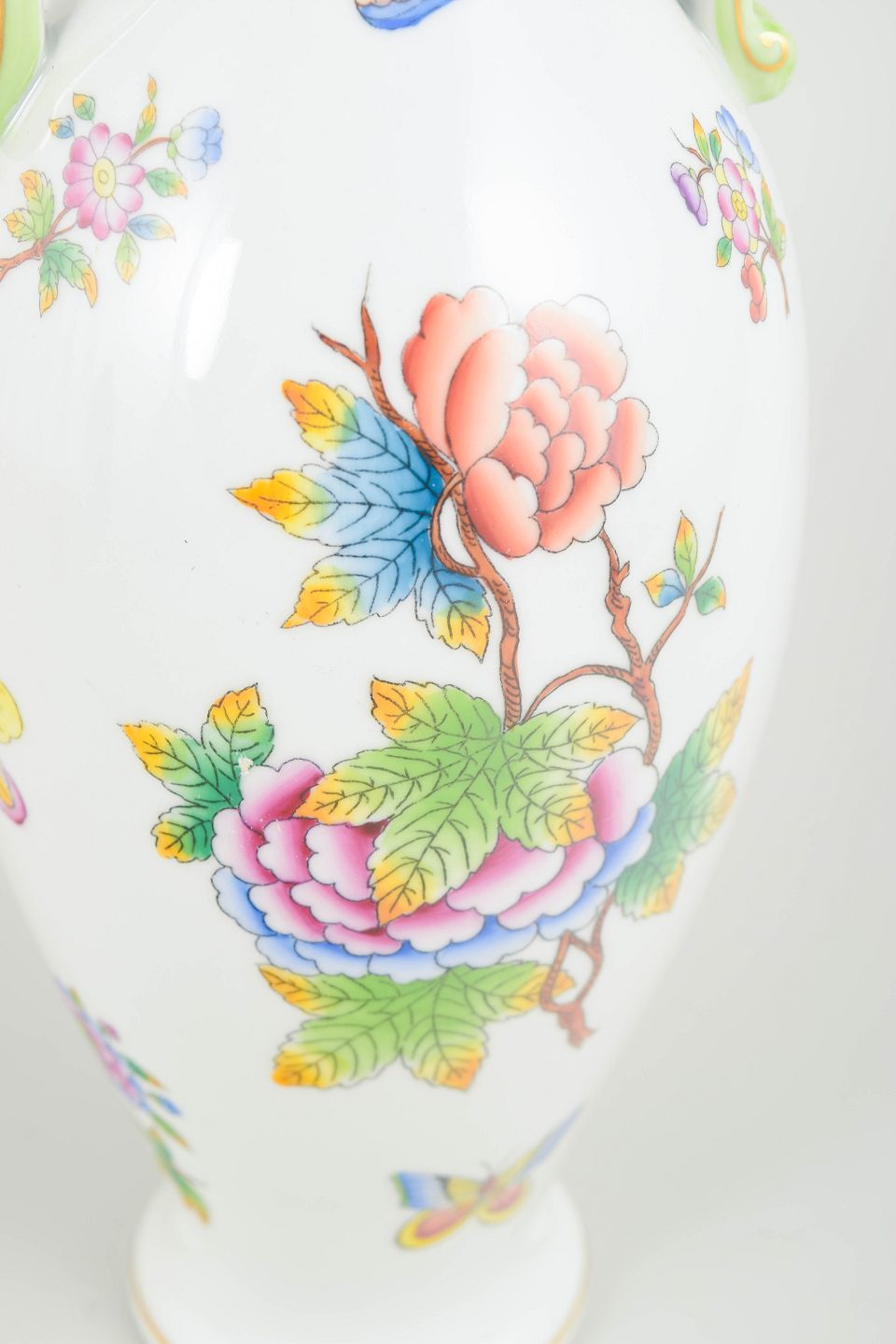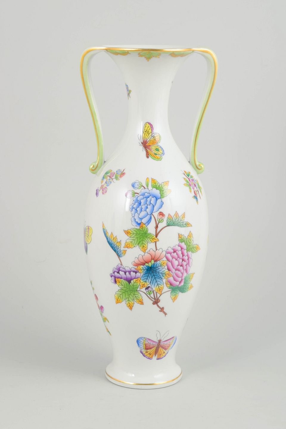 Herend, stor vase.Stor balustervase i hvidt porcelæn med håndmalet dekoration i mønsteret Queen Victoria, udført med farverige blomster og sommerfugle samt guldkant.