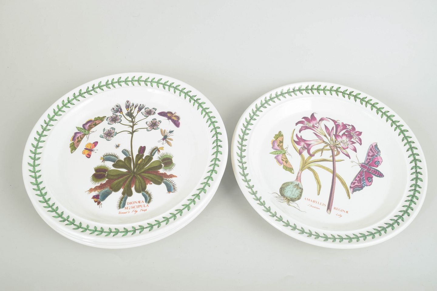 Portmeirion England, sæt med 4 middagstallerkener.Sæt med 4 store middagstallerkener i fajance fra Portmeirion, dekoreret i “The Botanic Garden” serien med botanisk motiv og karakteristisk grøn bladbort.