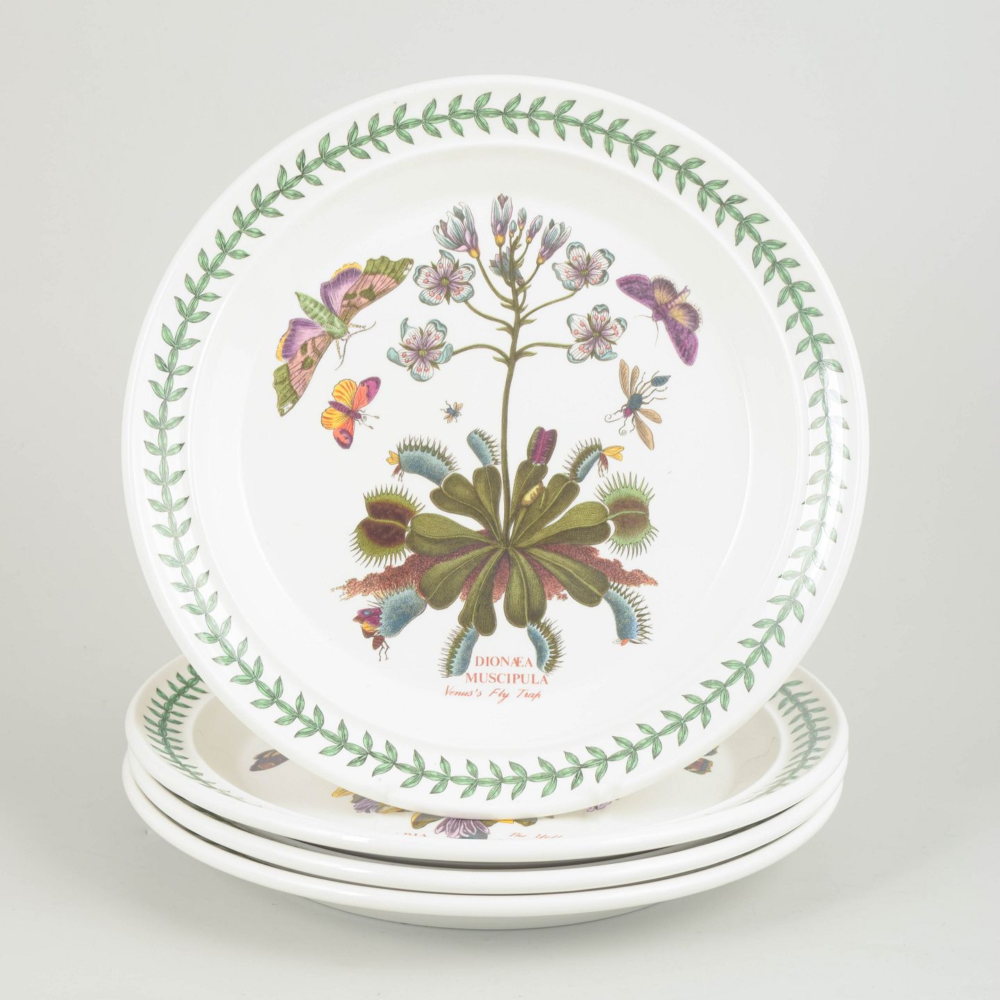 Portmeirion England, sæt med 4 middagstallerkener.Sæt med 4 store middagstallerkener i fajance fra Portmeirion, dekoreret i “The Botanic Garden” serien med botanisk motiv og karakteristisk grøn bladbort.