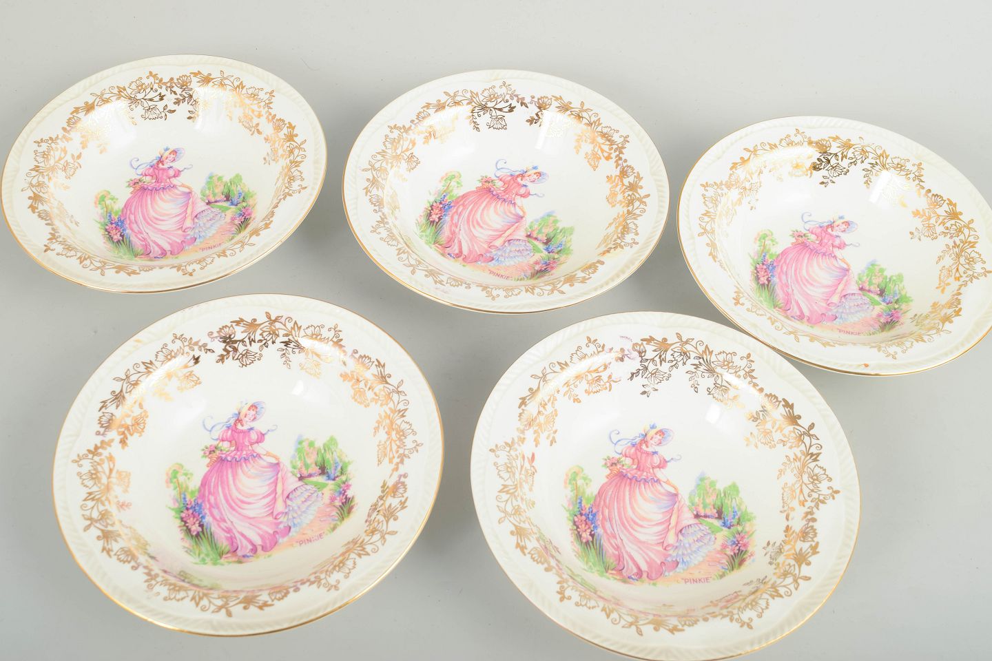 Royal Alma, England, sæt med 5 skåle, ca. 1930’erne.Sæt med fem fajanceskåle med trykt dekoration i pastelfarver med figurmotiv i midten samt rigt udformet, gylden bladranke-bort langs kanten.