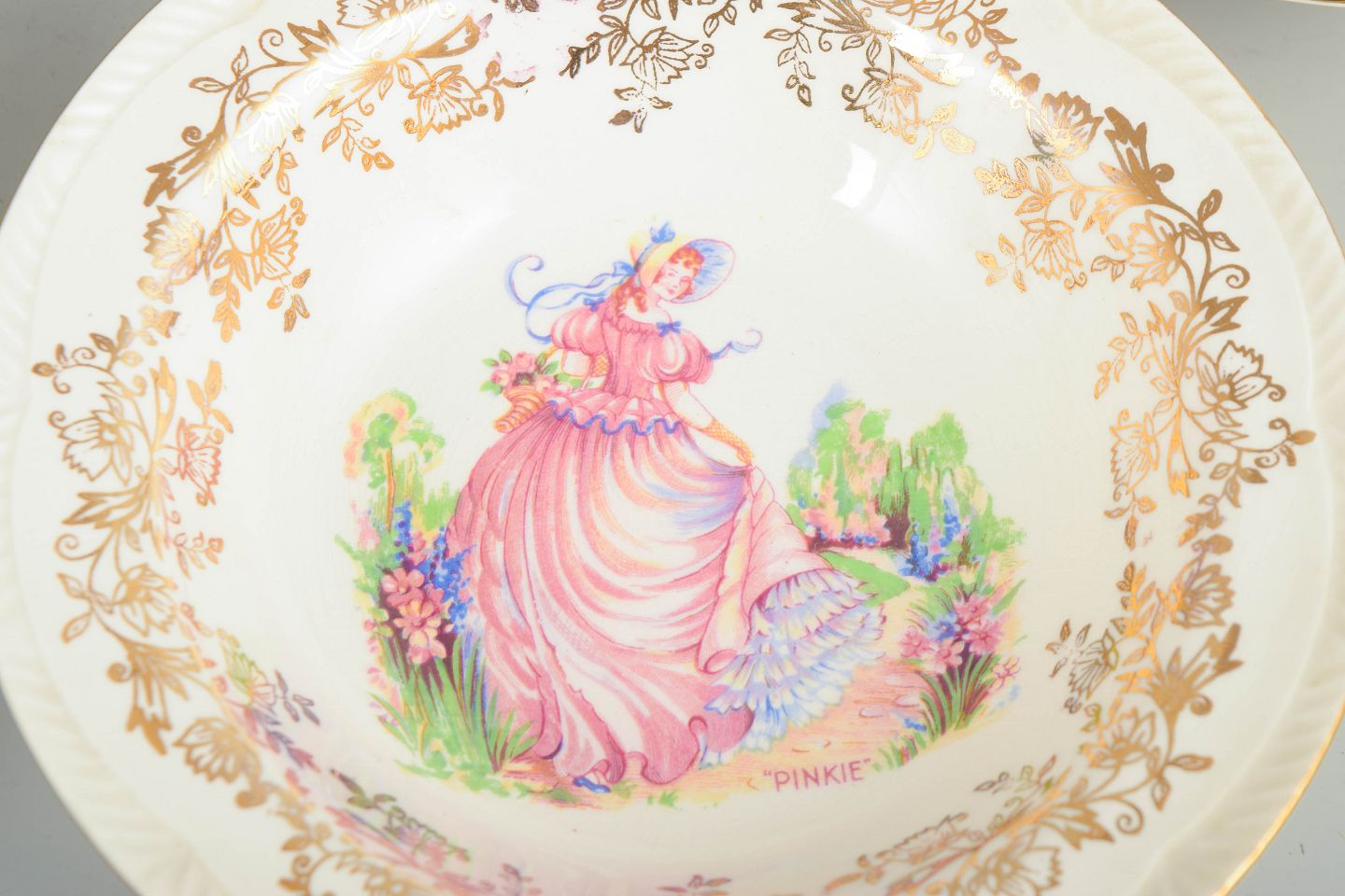 Engelsk fajance fra mellemkrigstiden blev ofte produceret som dekorativt og prisvenligt bordtøj, hvor trykte motiver og ornamenterede borter gav et elegant udtryk. I 1930’erne var romantiske figurscener og gyldne detaljer populære elementer, der skulle tilføre hverdagsservicer et mere festligt præg.
