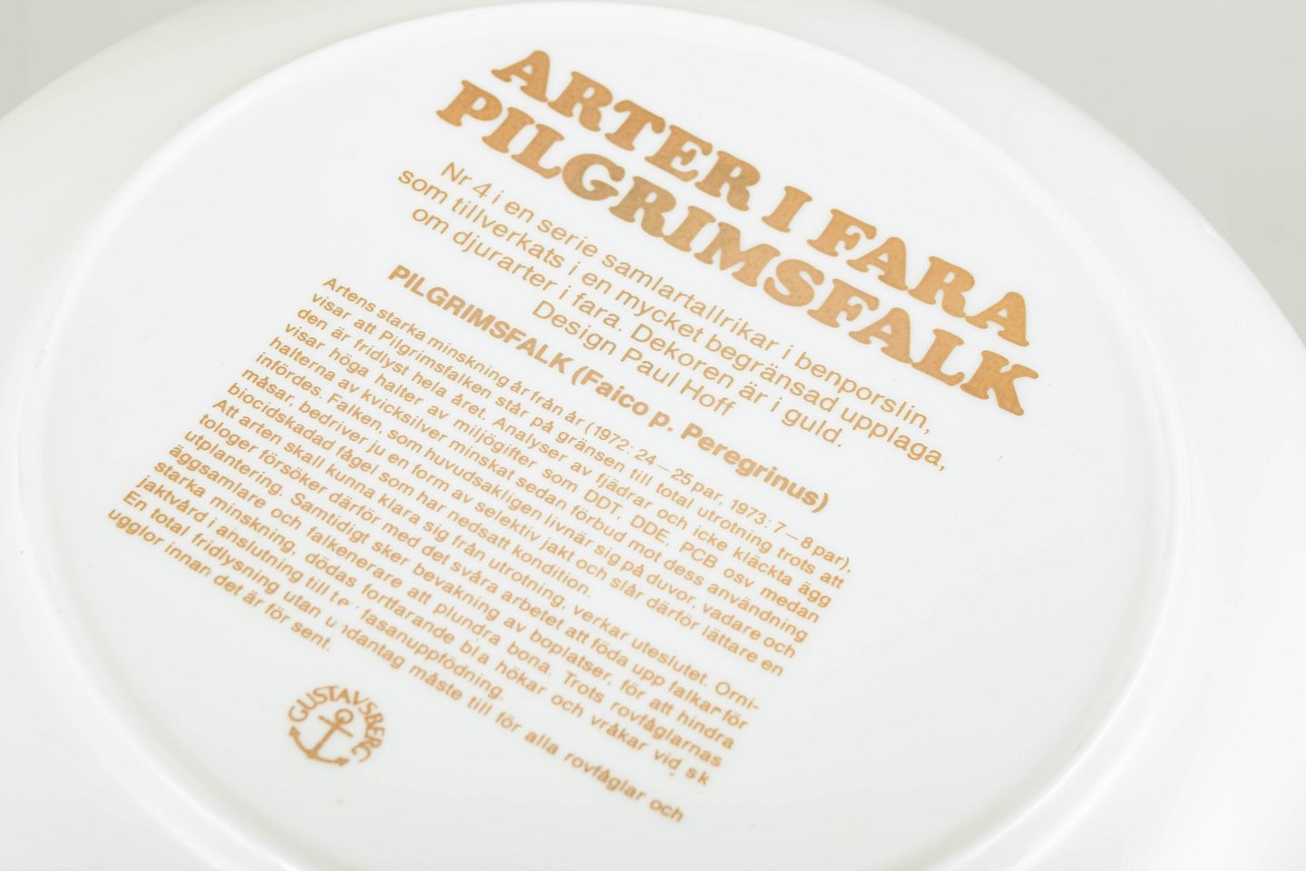 Paul Hoff for Gustavsberg, “Arter i fara”, sæt med to tallerkener.Sæt bestående af to samlertallerkener i porcelæn med motiv af havørn udført i gulddekoration. Tallerkenerne indgår i serien “Arter i fara”, model Havsörn, produceret i begrænset oplag i 1980’erne. Bagsiden er trykt med titel, serienummer og en kort naturhistorisk tekst om arten.