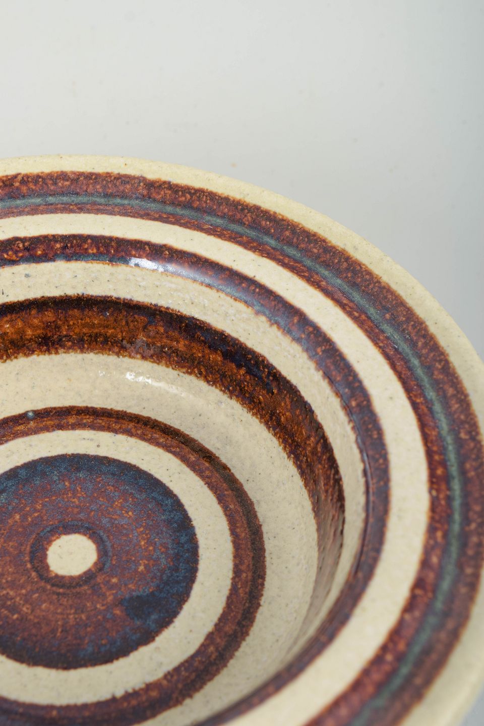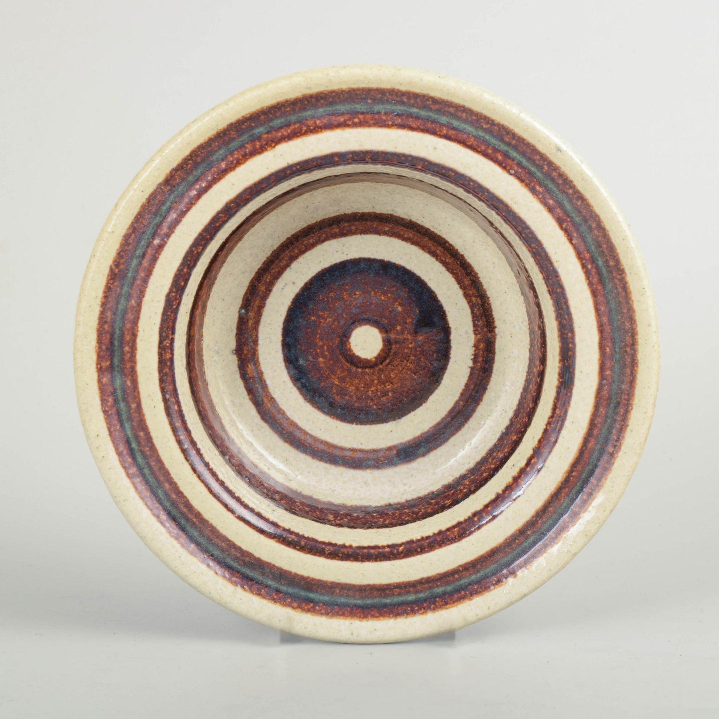Britt Louise Sundell for Gustavsberg, skål i stentøj.Lav, drejet skål i stentøj med dekor i koncentriske ringe i brune og blålige nuancer på lys bund. Formen og dekoren relaterer til “Hambo”-modellen.