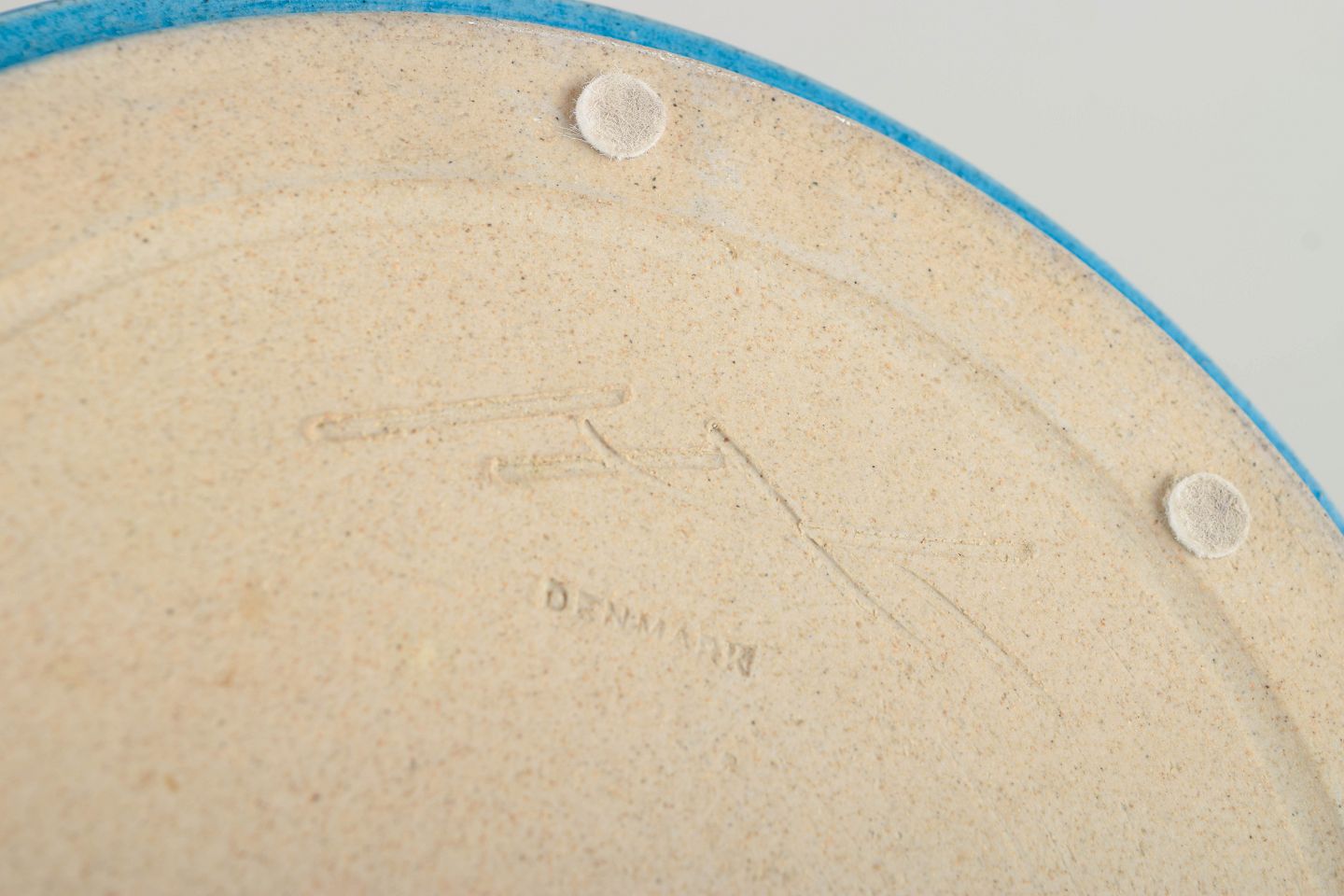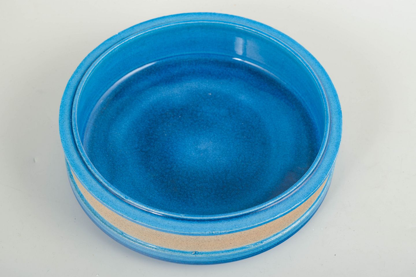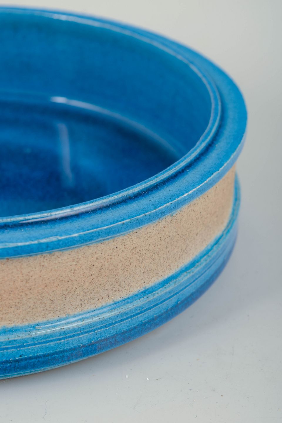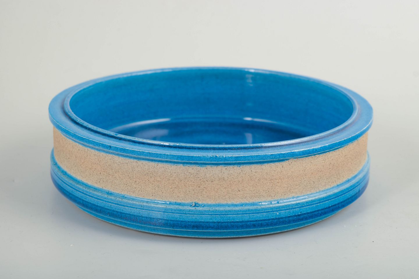 Nils Kähler, skål.Lav, rund skål i drejet stentøj med blank blå glasur og sandfarvet, uglaseret bælte. Enkel og funktionel formgivning, karakteristisk for dansk stentøj fra 1960’erne.
