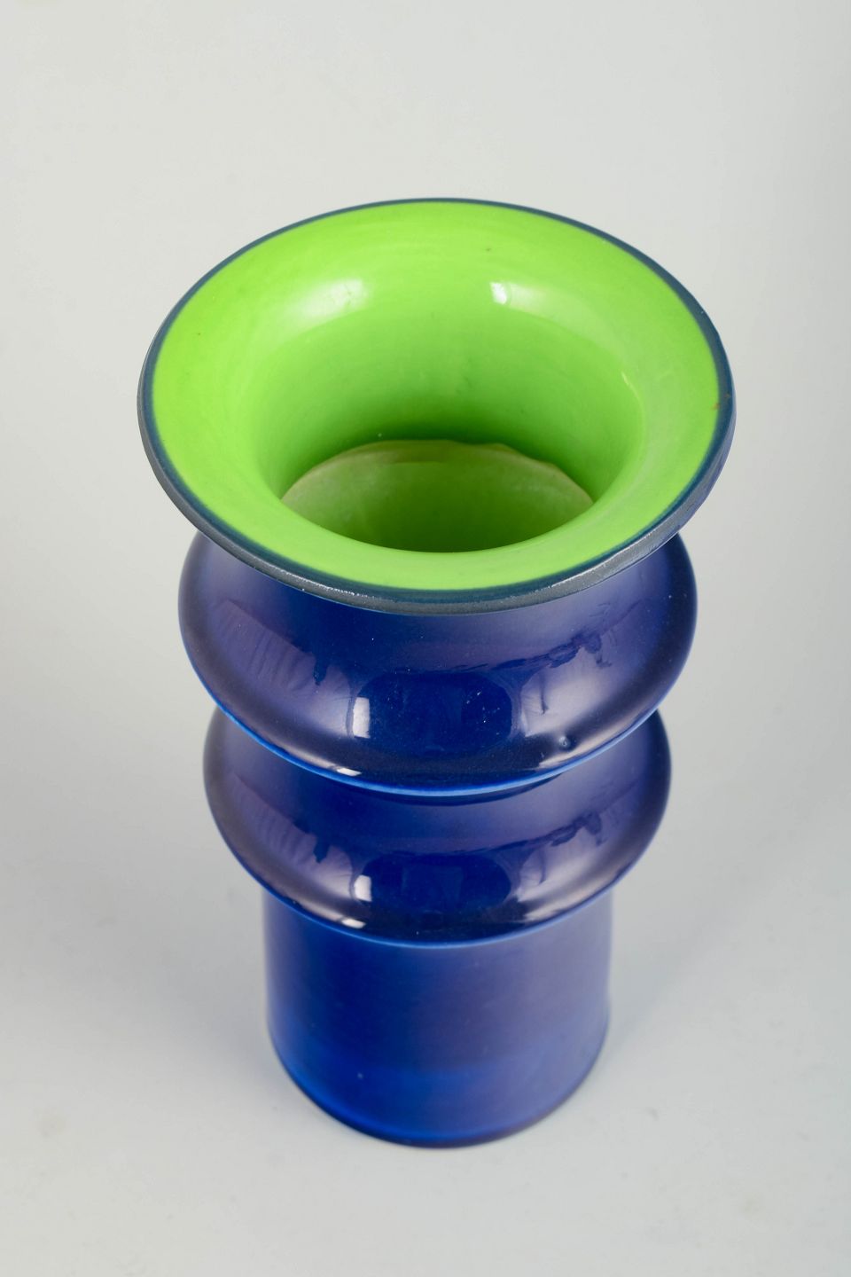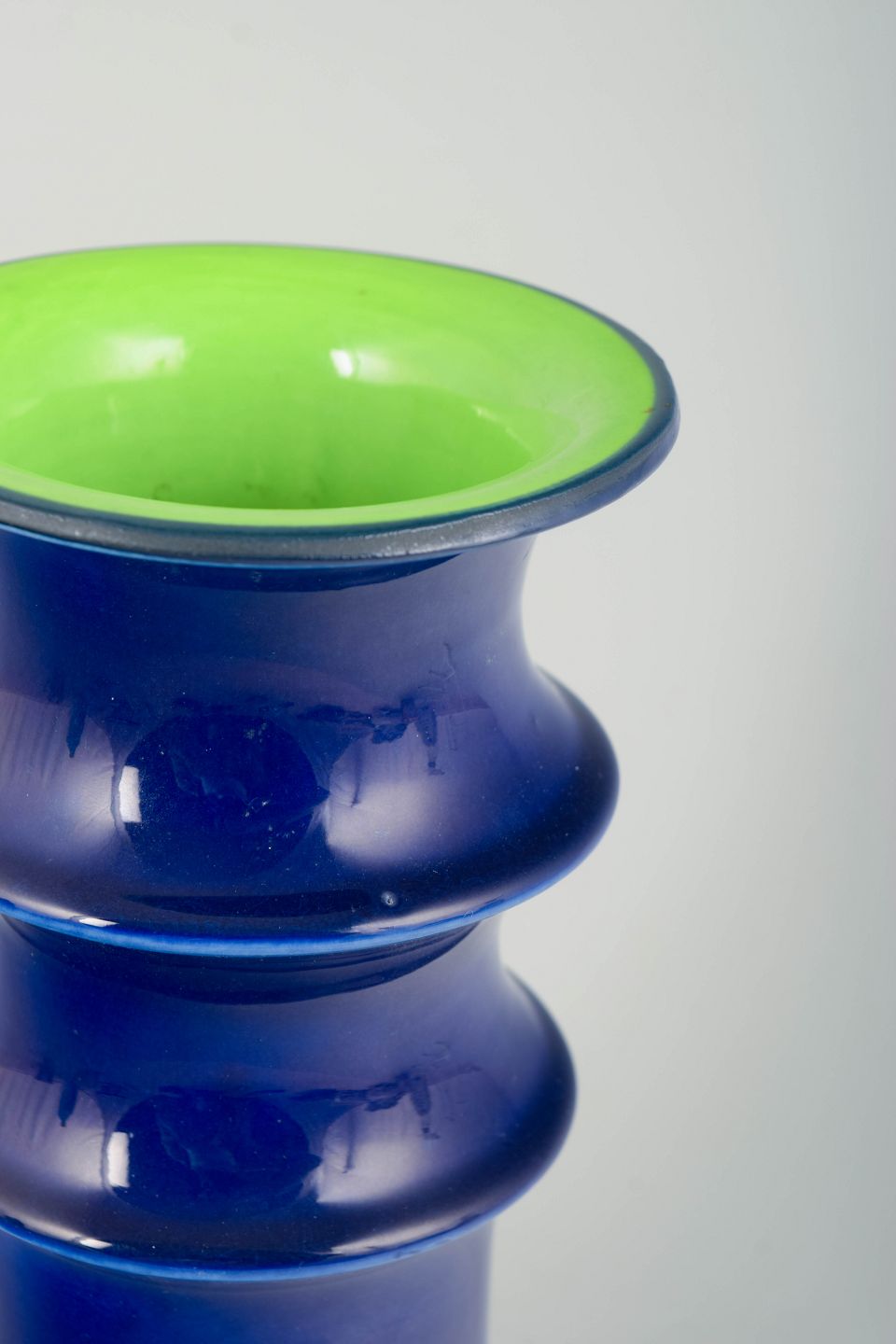 Inger Persson for Rörstrand, vase.Skulpturel, balusterformet vase i glaseret stentøj med dyb koboltblå glasur og kontrasterende limegrøn glasur indvendigt; typisk 1970’er-modernisme med tydelig profilering og en markant farvevirkning.