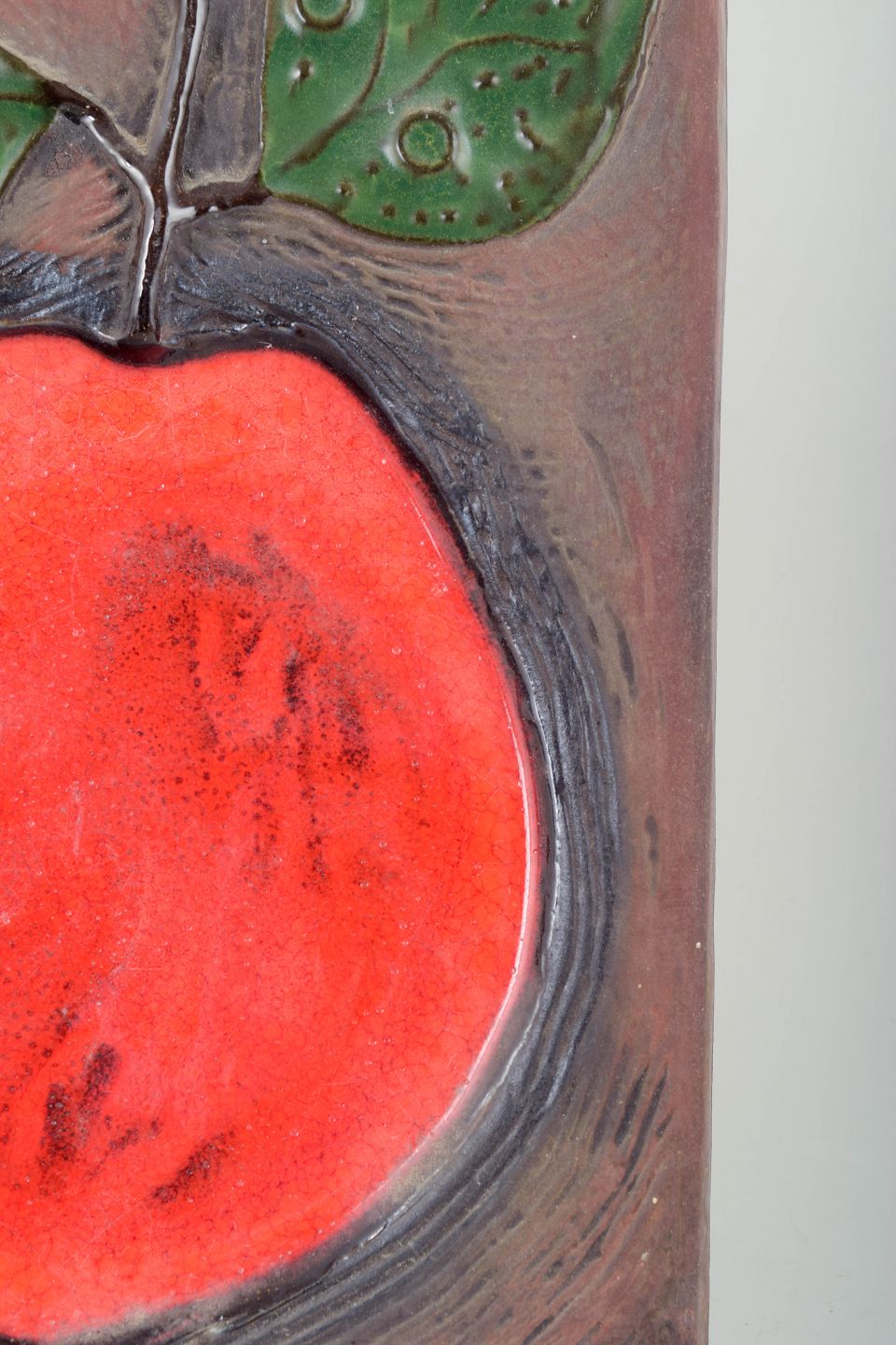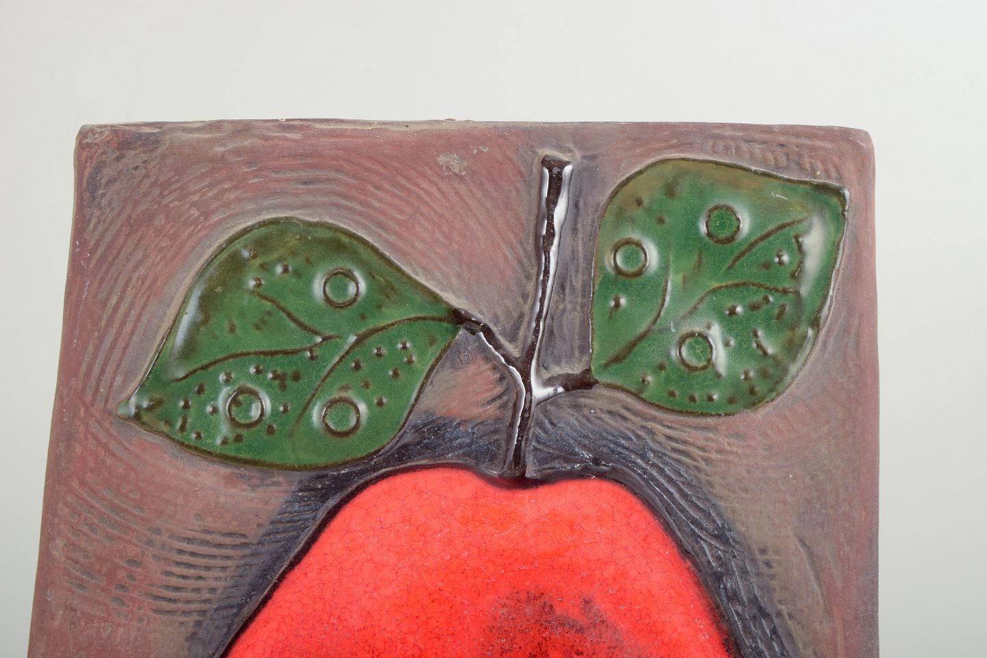 Ester Wallin for Upsala Ekeby, vægrelief.Stort, sjældent vægrelief i glaseret keramik med stiliseret frugtmotiv. Relieffet er domineret af et markant rødt frugtfelt med grønne blade mod en brunlig, struktureret baggrund, der understreger motivets plastiske virkning. Glasurerne er kraftfulde og levende og giver relieffet et tydeligt kunstnerisk og modernistisk udtryk. Modelnummer 1043E.