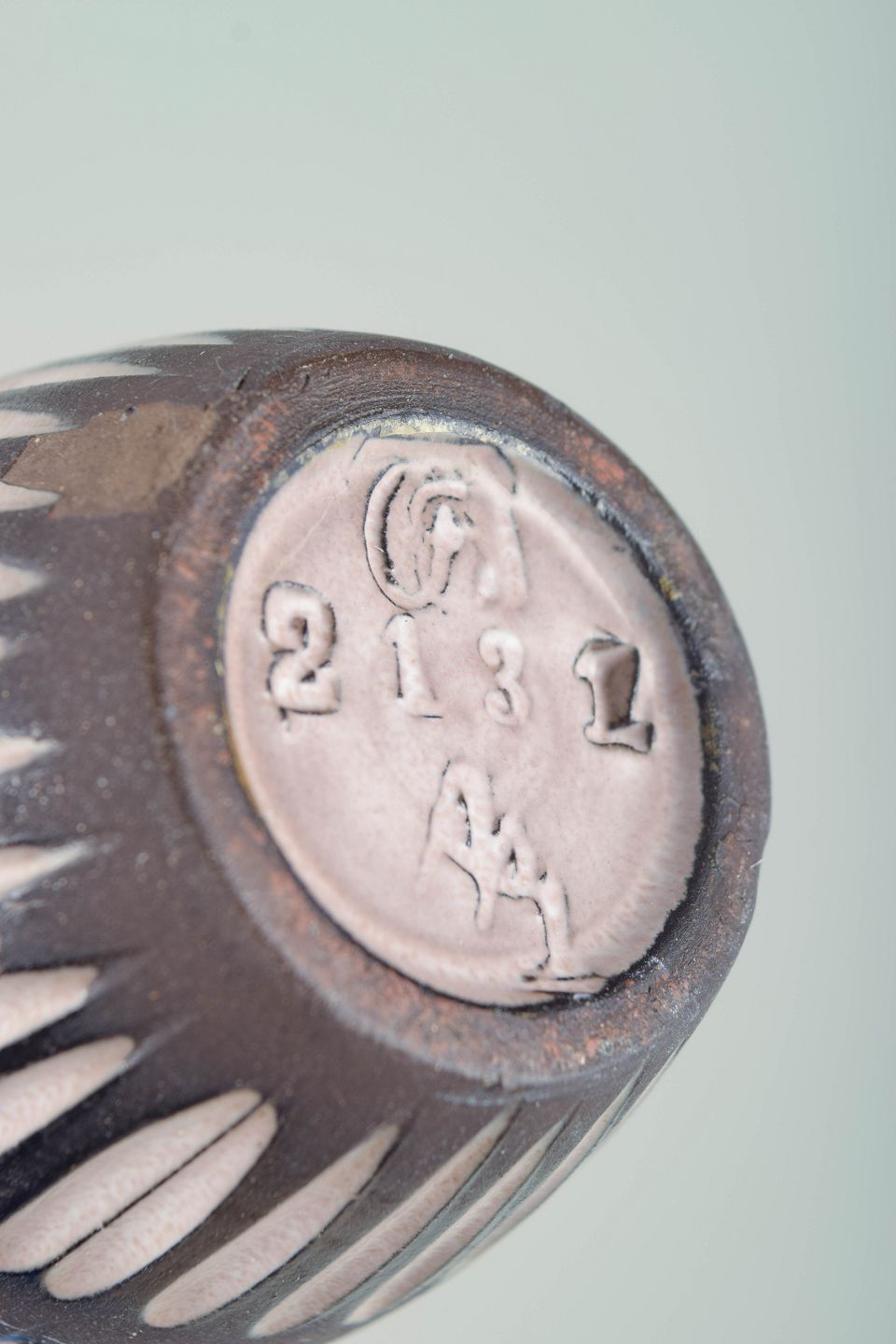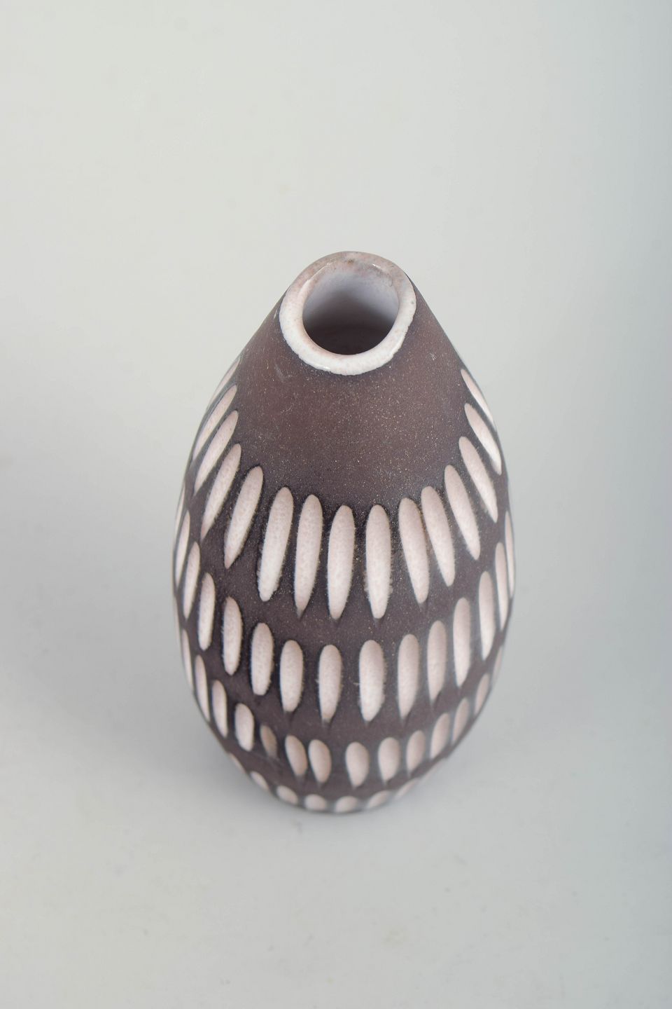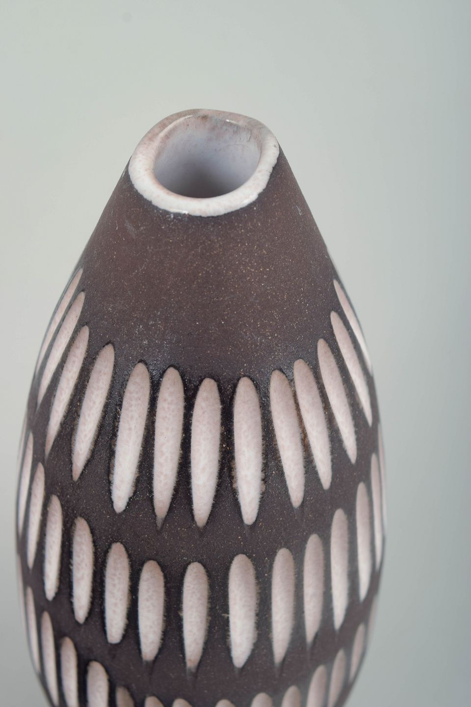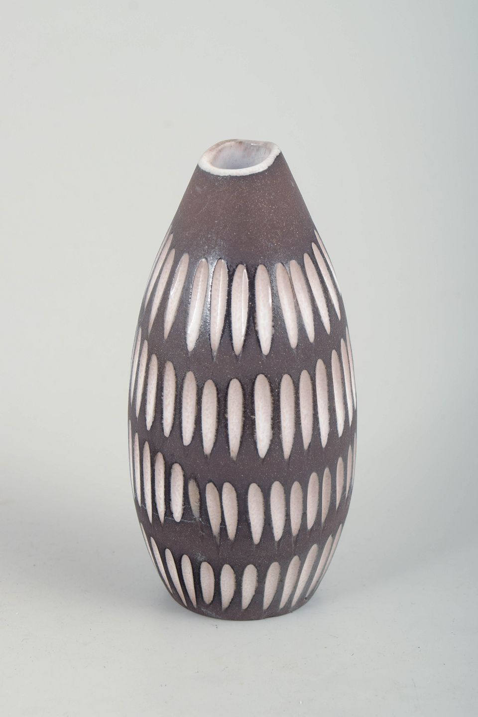 Ingrid Atterberg for Upsala Ekeby, vase.Slank, ovalt formet vase i glaseret keramik med smallende hals. Korpus er dekoreret med gentagne, lodrette ovale felter i hvid mod en mørk brun bundglasur, hvilket skaber et rytmisk og grafisk udtryk med tydelig skandinavisk modernisme. Modelnummer 2131.