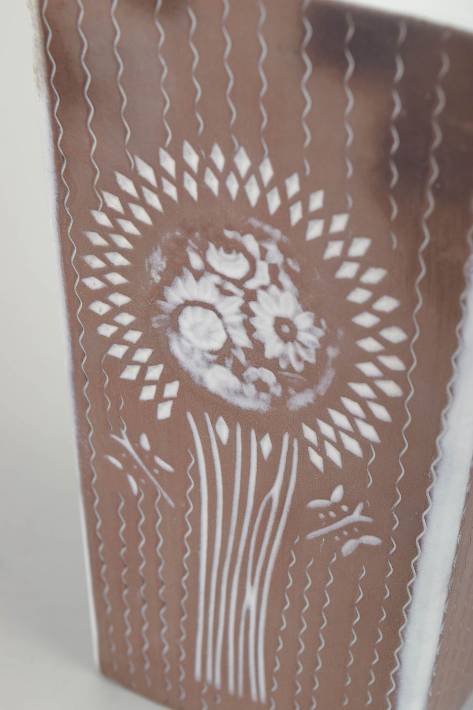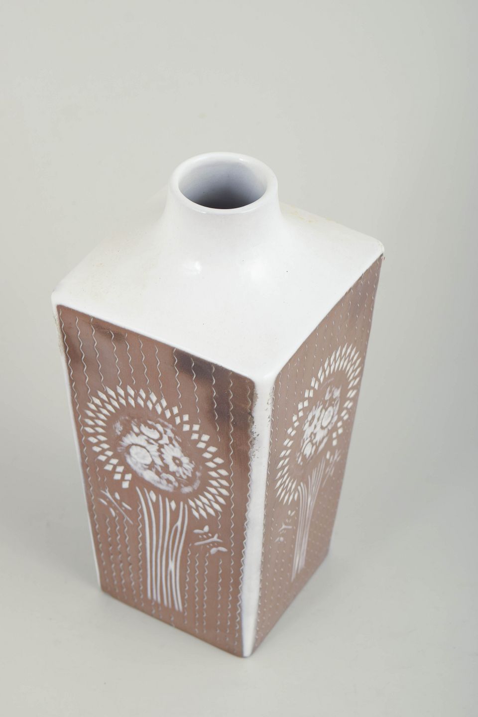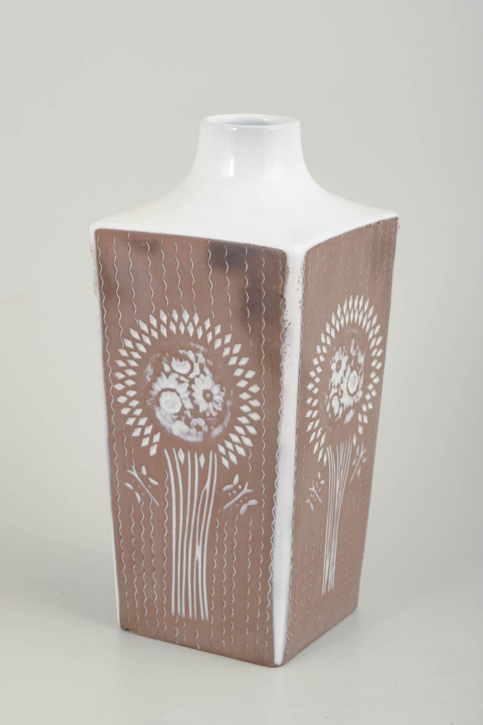 Mari Simmulson for Upsala Ekeby, vase.Kantet vase i glaseret keramik med firsidet korpus og kort hals. Dekoreret med stiliserede blomster- og strålemotiver i hvid mod brun bundglasur, udført i et grafisk og symmetrisk formsprog med tydelig modernistisk karakter. Modelnummer 43130/955.