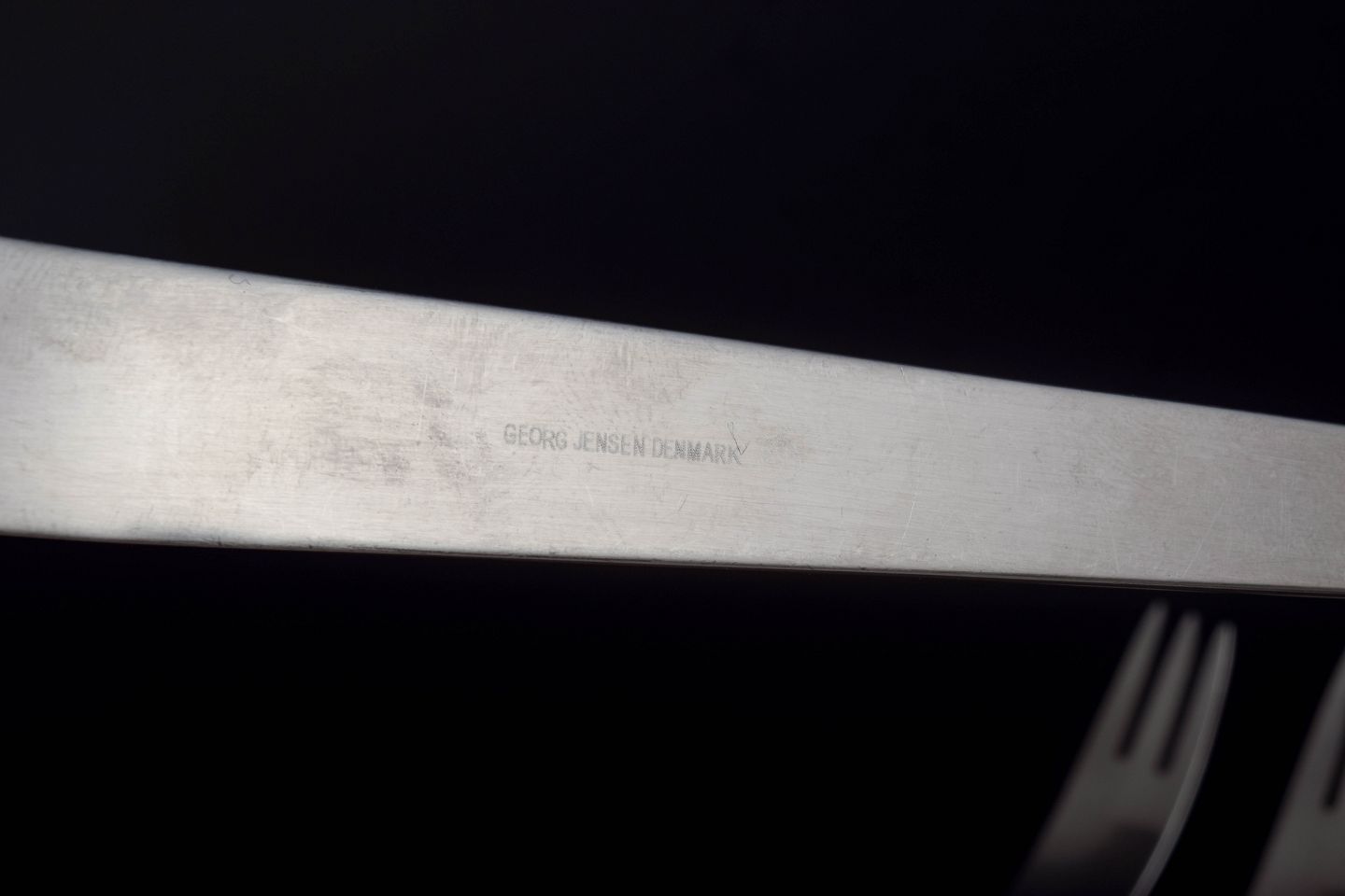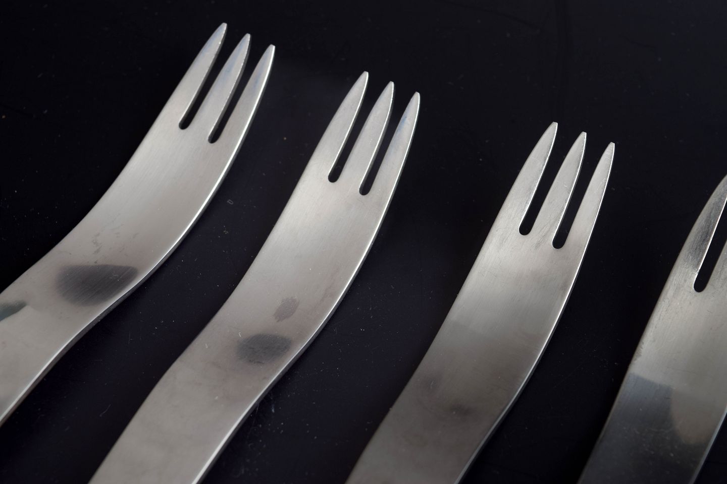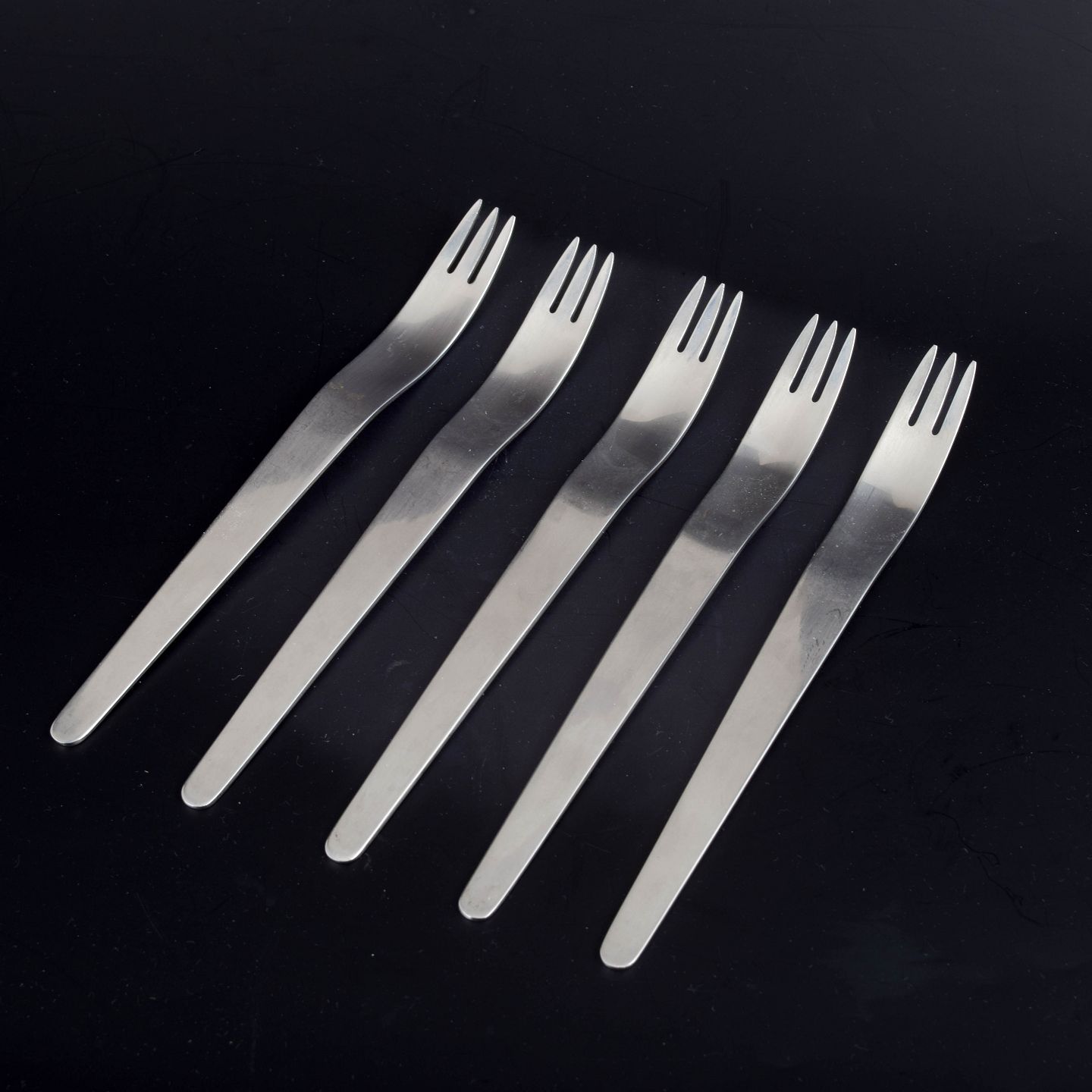 Arne Jacobsen for Georg Jensen. Modernistisk AJ bestik.Fem middagsgafler i rustfrit stål.