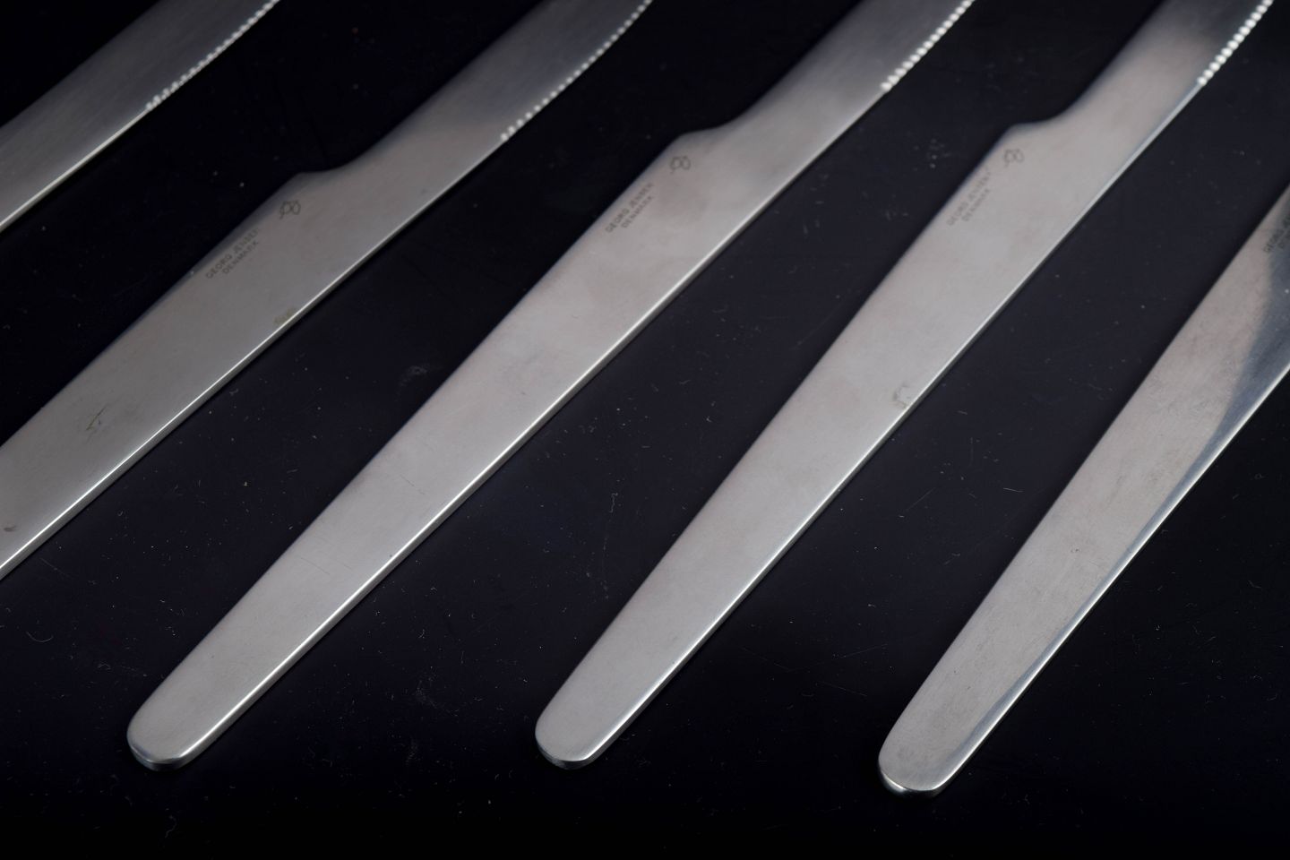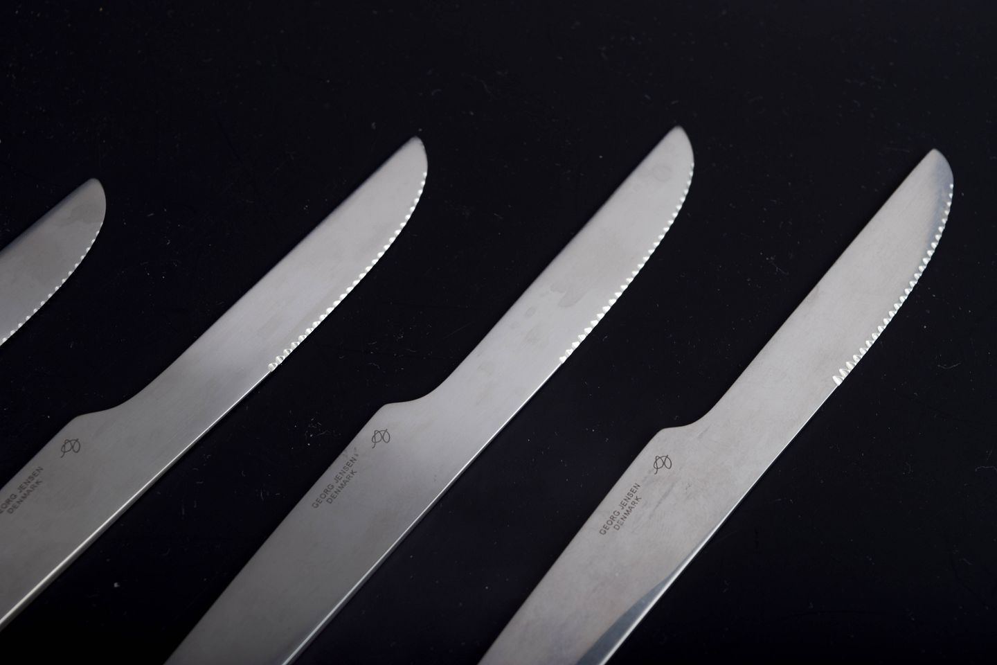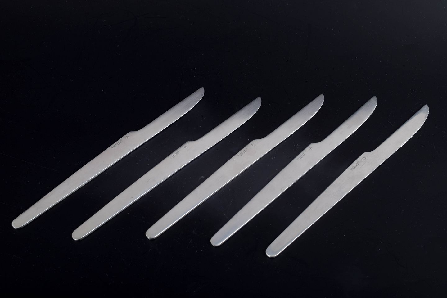Arne Jacobsen for Georg Jensen, middagsknive.Sæt bestående af fem middagsknive i rustfrit stål. Knivene er udført i et stramt og funktionelt formsprog karakteristisk for Arne Jacobsens bestikdesign og produceret af Georg Jensen. Modellen er fra 1980’erne.