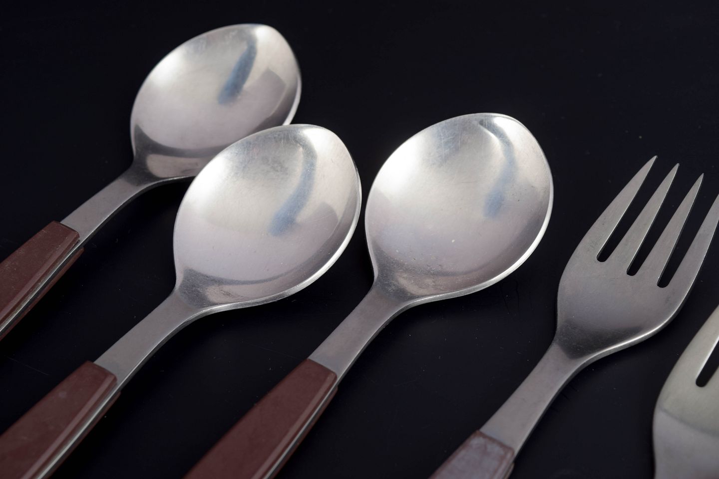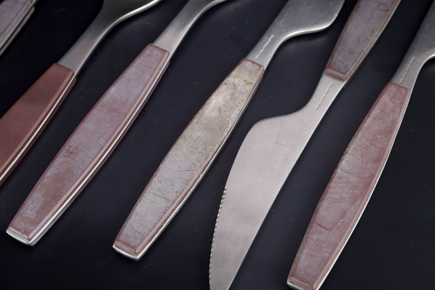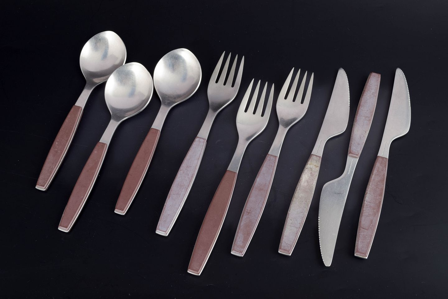 Henning Koppel for Georg Jensen, Strata bestiksæt til 3 personer.Sæt bestående af tre middagsknive, tre middagsgafler og tre spiseskeer i rustfrit stål med brune håndtag. Modellen er fra Strata-serien.