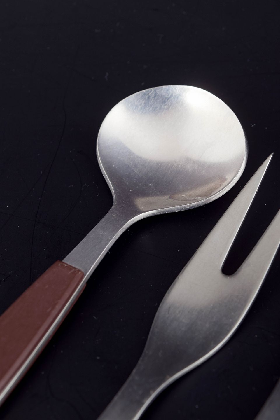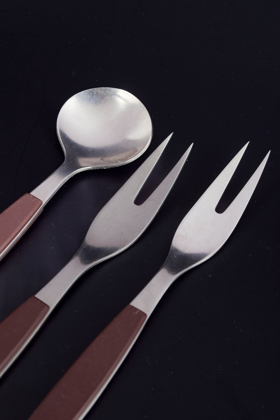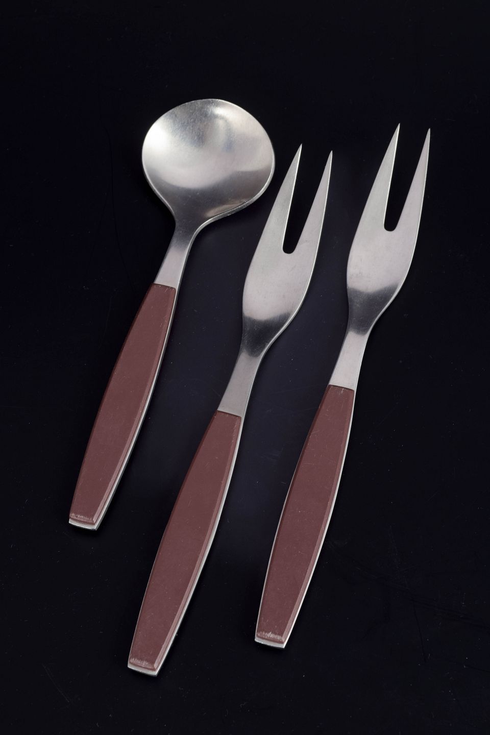 Henning Koppel for Georg Jensen, serveringsbestik.Sæt bestående af to pålægs-/serveringsgafler og en bouillonske i rustfrit stål med brune håndtag. Modellen er fra Strata-serien.