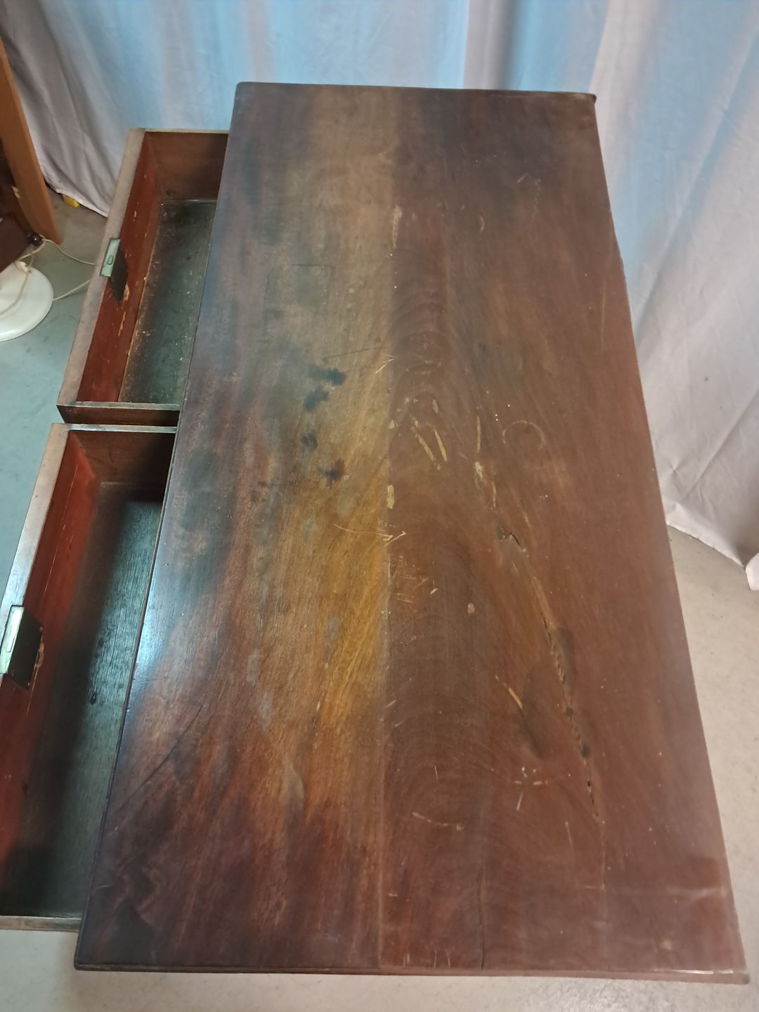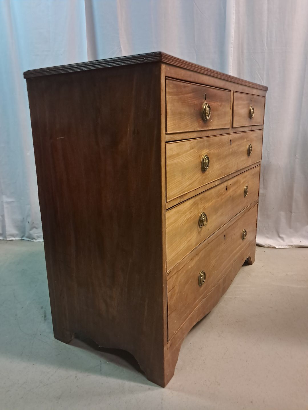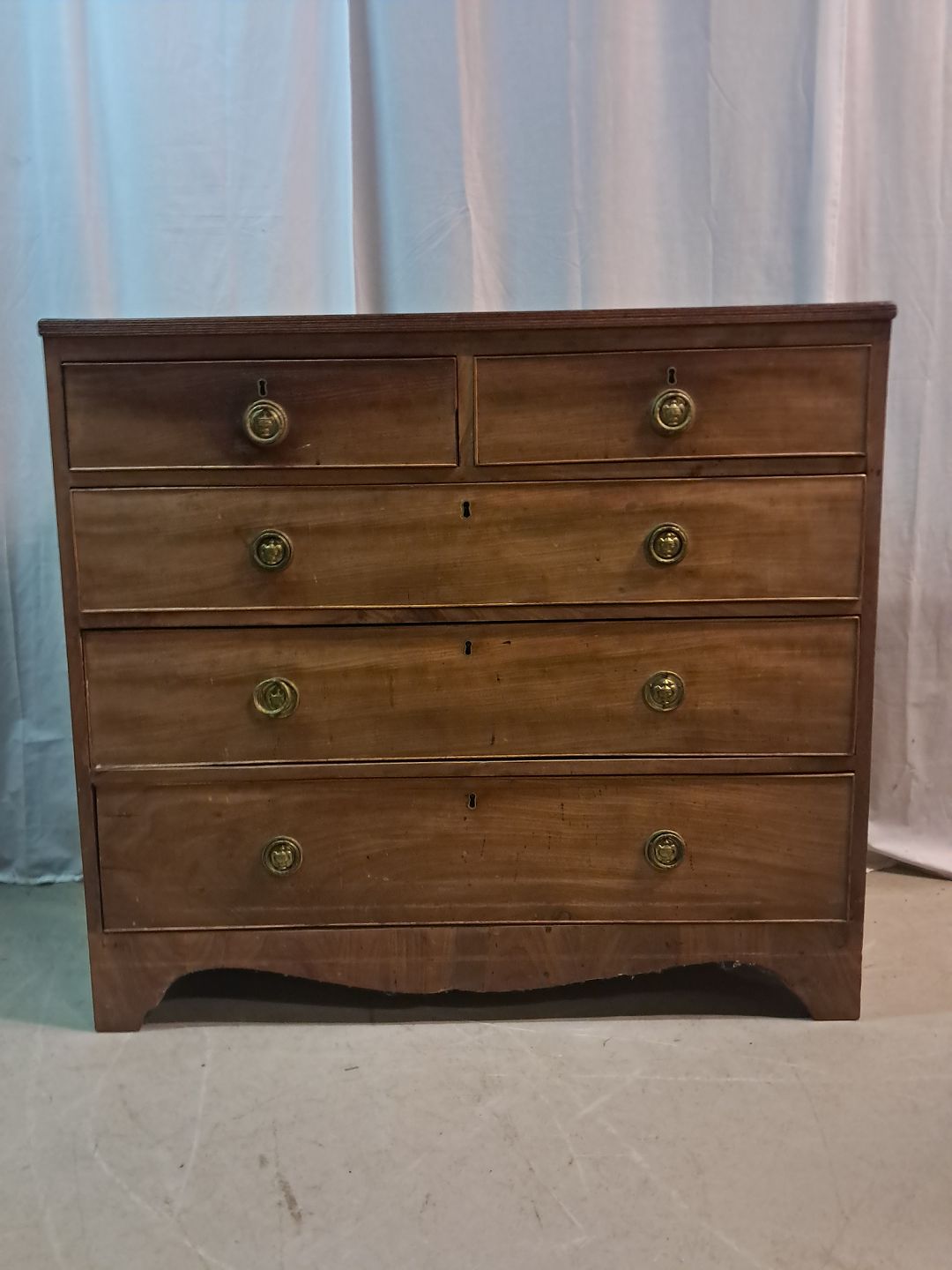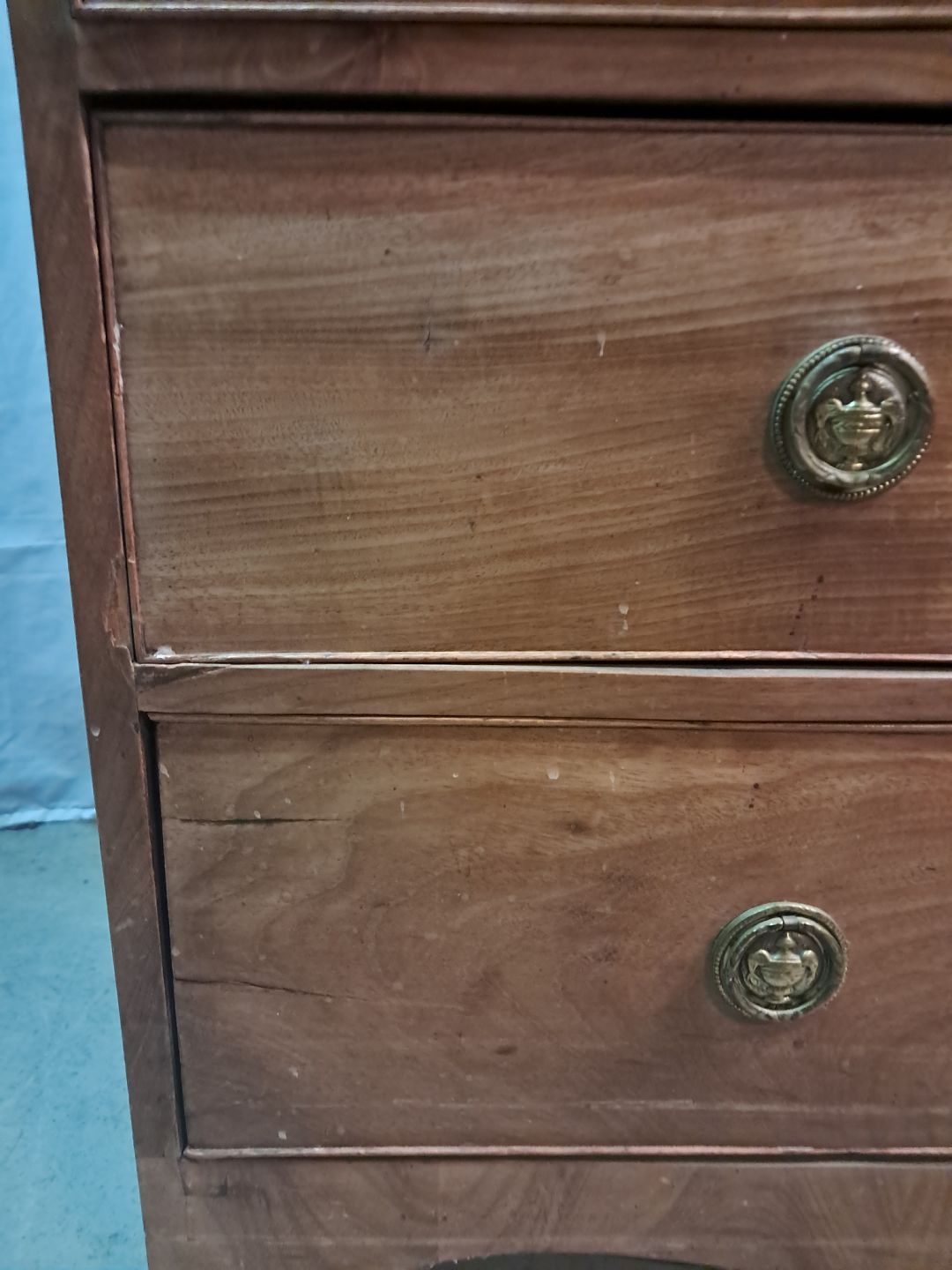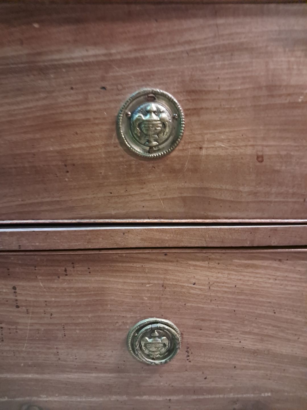 Kommode i fineret mahogni, fra 1920erne.Den har defekte lister, finer og brugsspor.