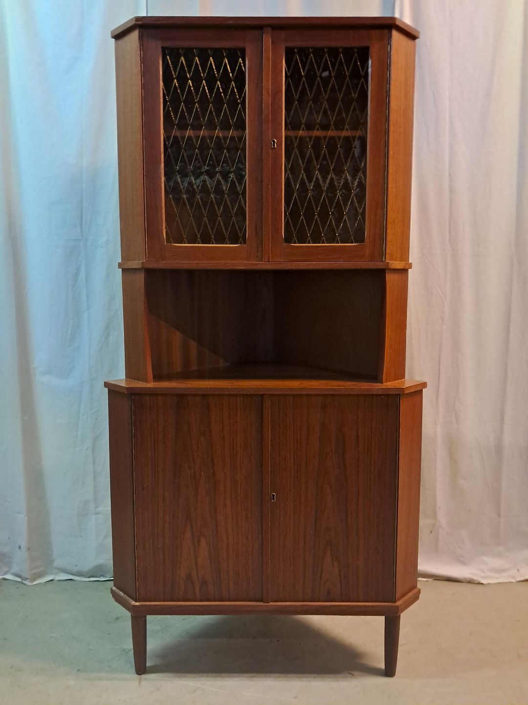 Hjørneskab i fineret teaktræ, fra 1960erne.Det har brugsspor.