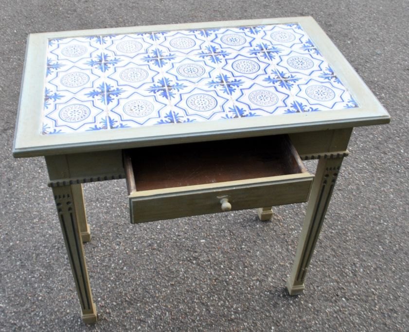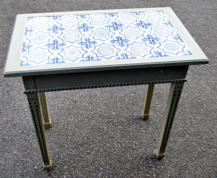 Fliesentisch, 19./20. Jahrhundert. Dänemark. Neuerer, bemalter Fliesentisch im Stil Ludwigs XVI. mit Schublade. Die Tischplatte ist mit 15 antiken niederländischen Fliesen mit Wang-Li-Ornament verziert. Höhe: 71,5 cm, Länge: 76,5 cm, Breite: 47,5 cm.