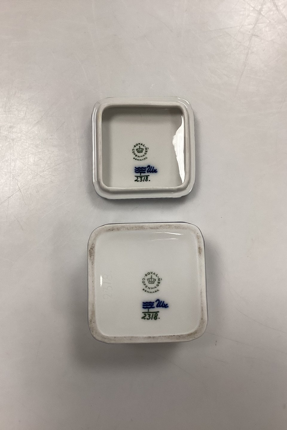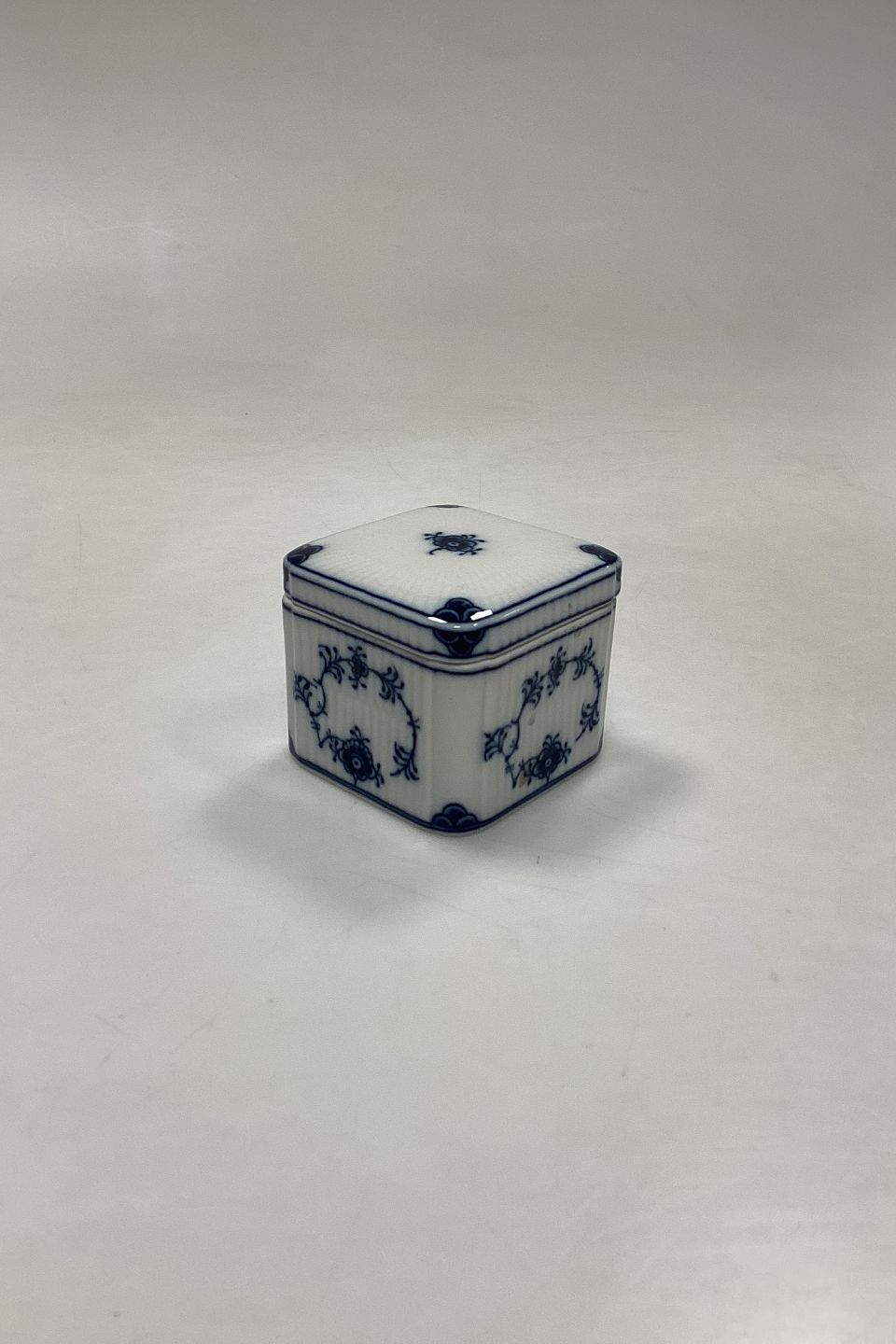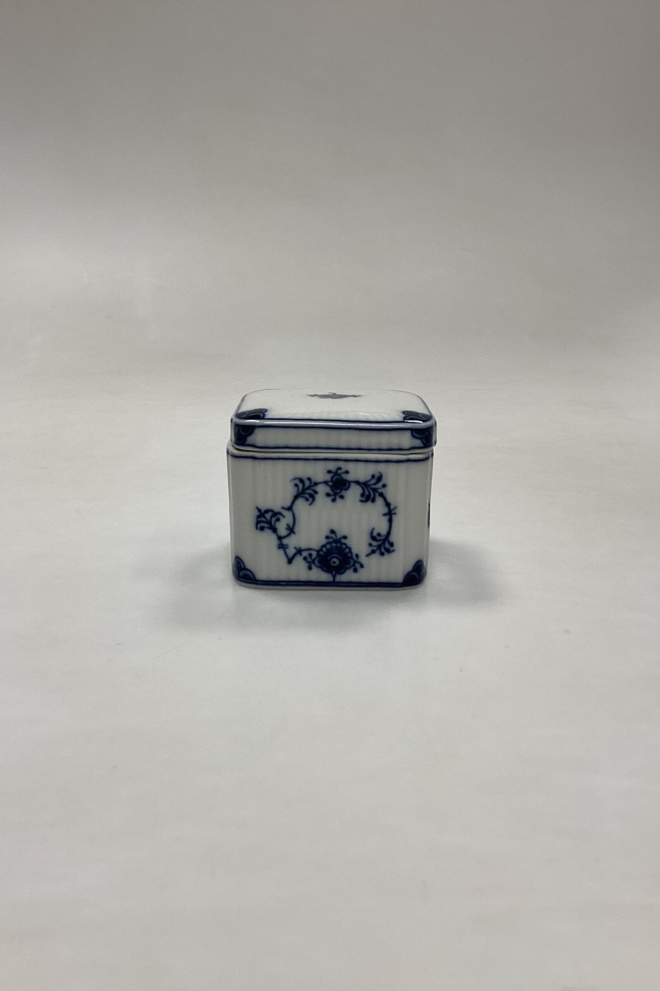 Royal Copenhagen Musselmalet Riflet Bonbonniere No. 2318. 1. Sortering. Måler 7 cm x 7 cm x 6 cm / 2,75 in. x 2,75 in. x 2,36 in.