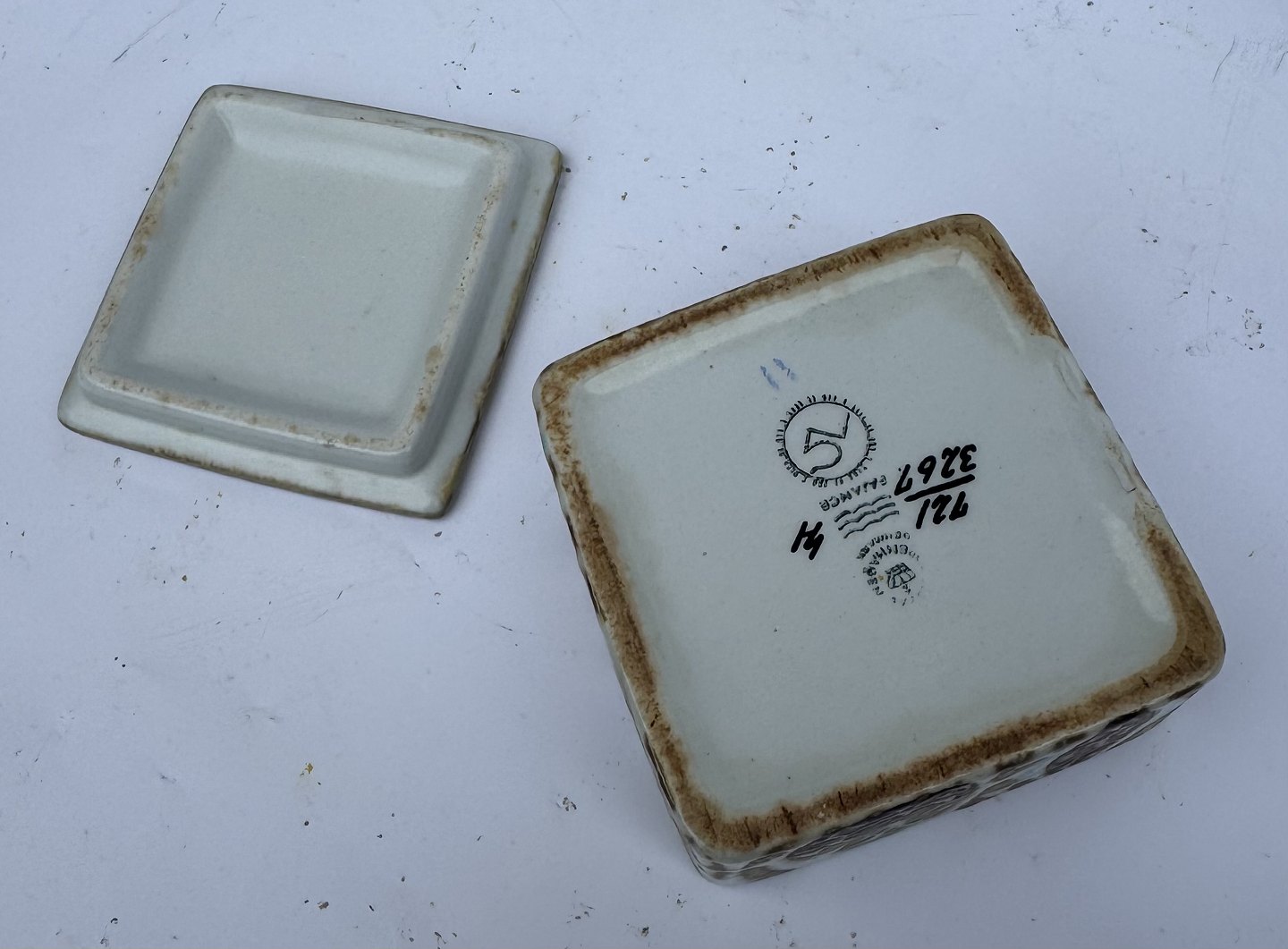 Nils Thorsson: Kvadratisk lågskål i fajance fra Royal Copenhagen designet af den svenske designer. Fremstår i perfekt stand. Mål: H. 4,2 cm samt 7,8 x 7,8 cm