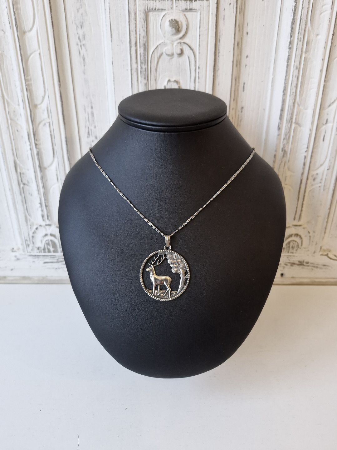 Halskæde og vedhæng i sølv, vedhænget er udformet som skovparti med krondyrStemplet: H.J - 830s