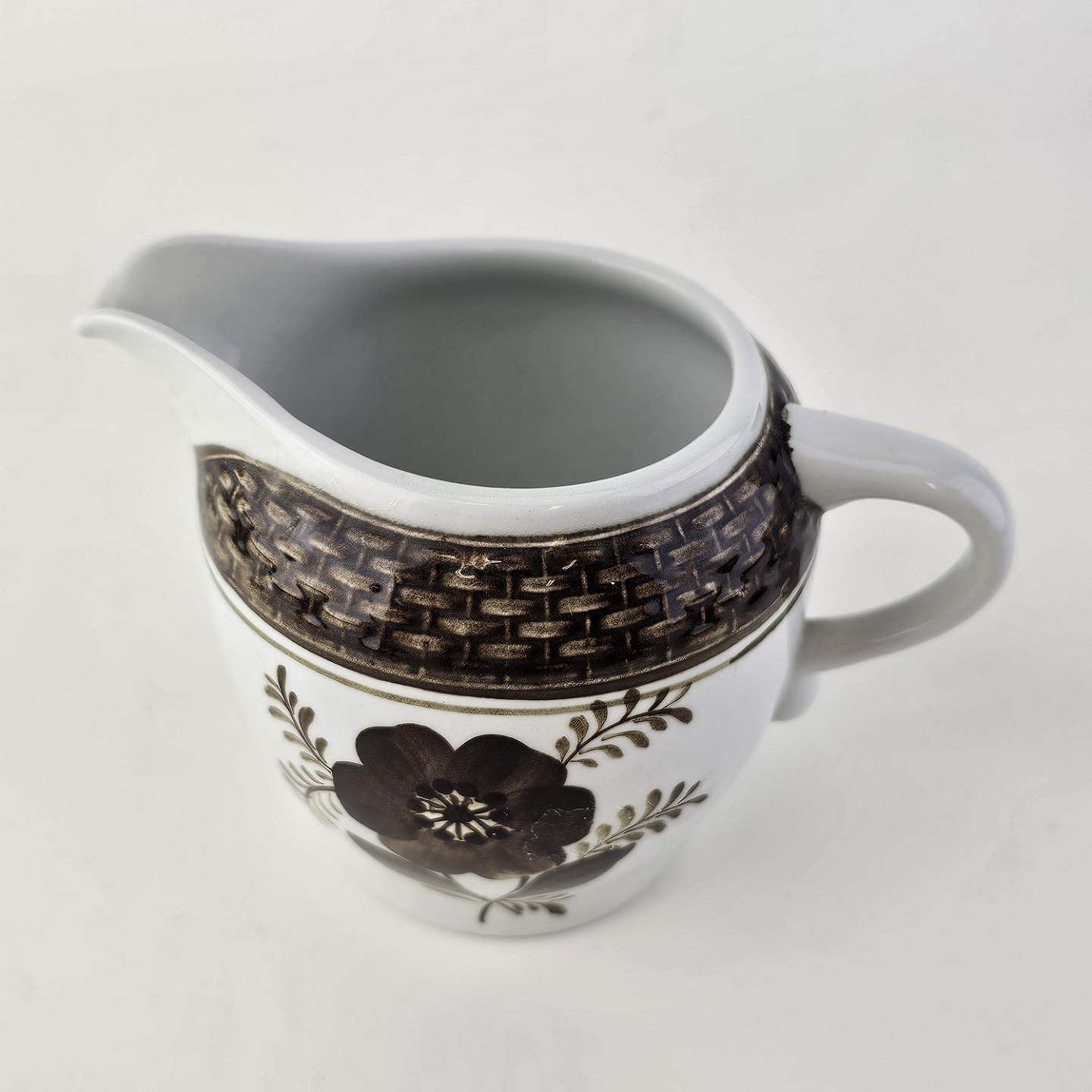 Fajancestellet med flettet kant og dekoration af brune blomster på lys baggrund med brun kant