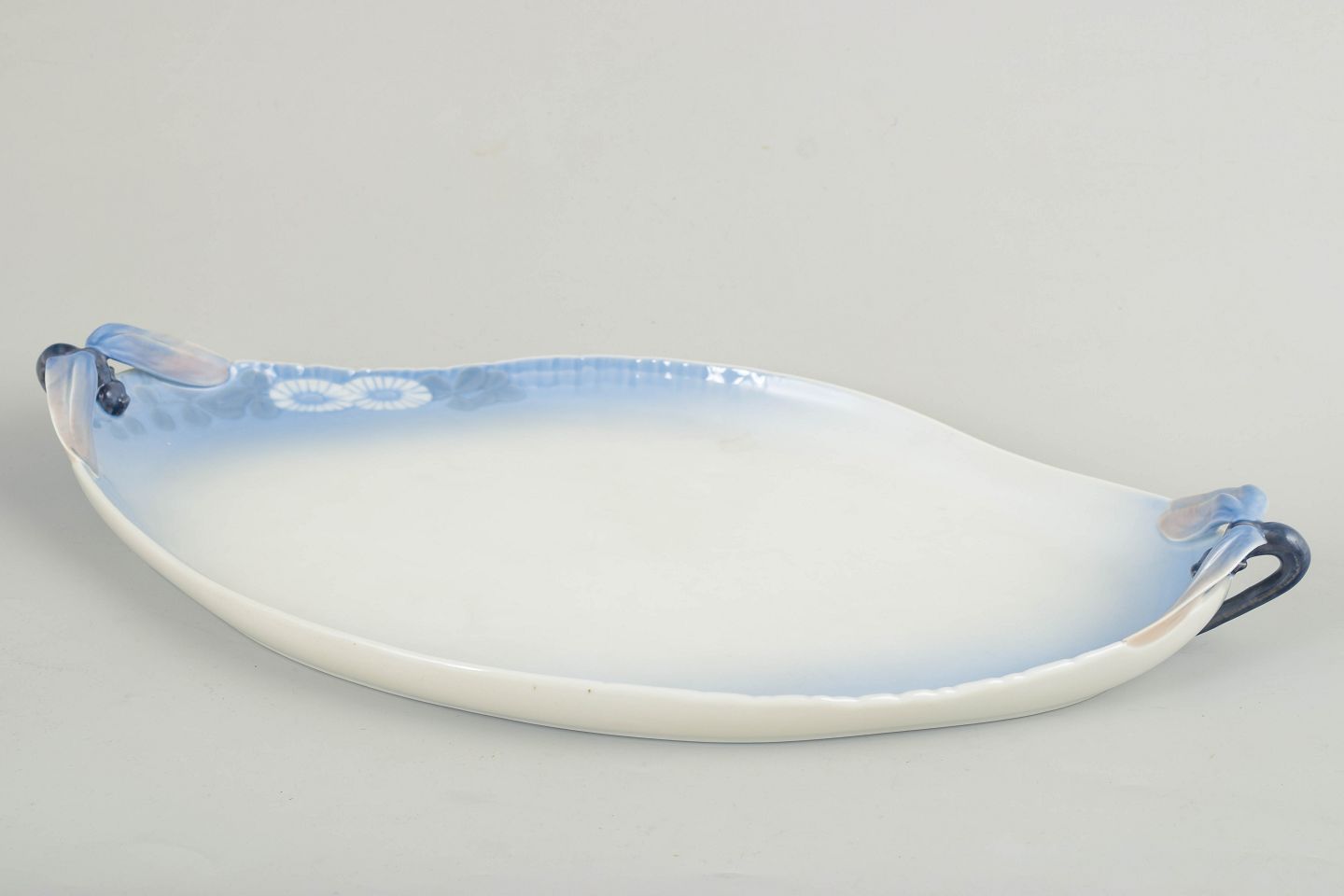 Royal Copenhagen, Skærsommernatsdrøm, stort fad.Stort dekorativt fad i porcelæn fra serien Skærsommernatsdrøm, model 73/10034. Fadet har en elegant oval form med integrerede greb og bløde farveovergange i dekorationen.