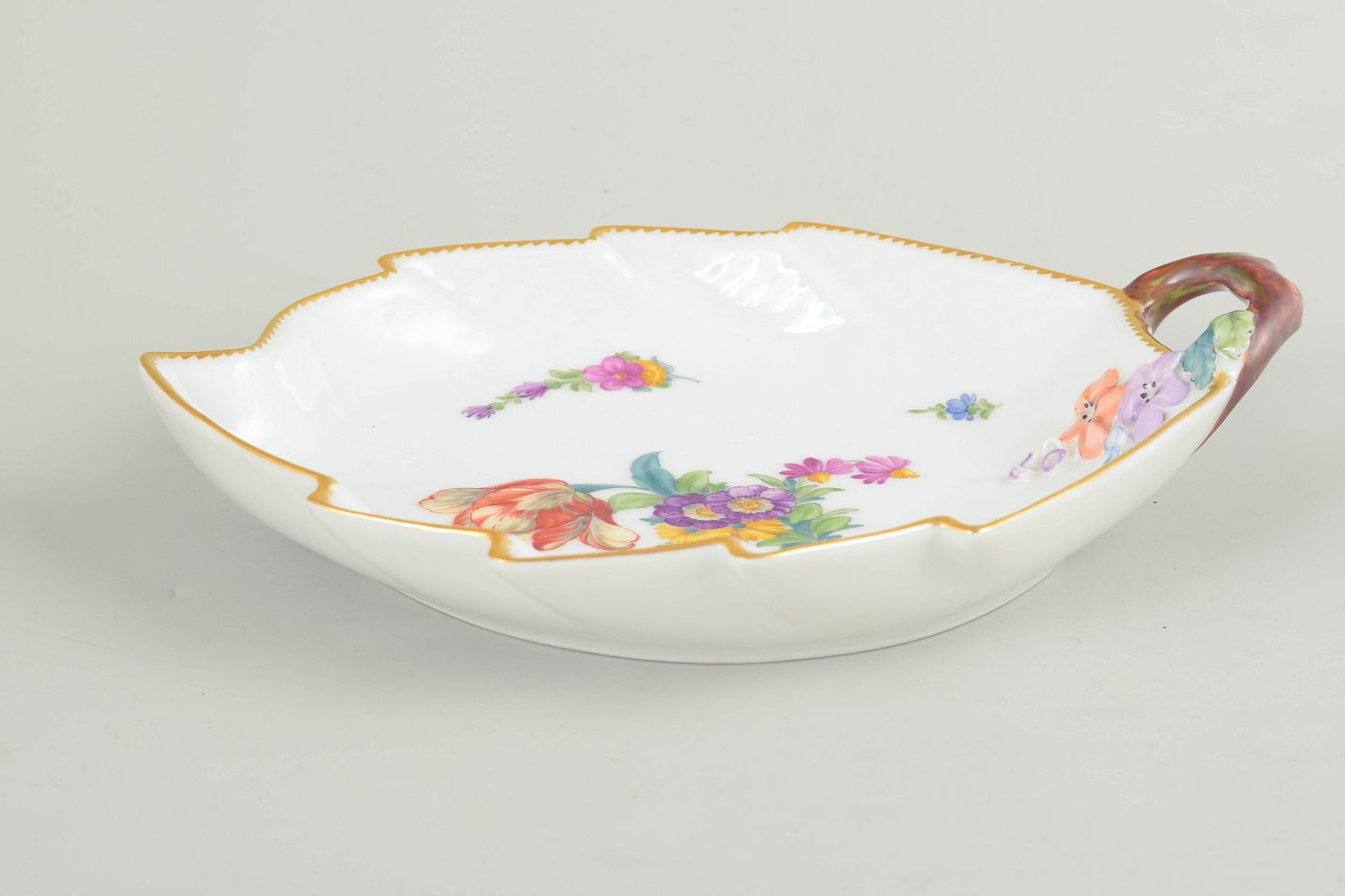 Royal Copenhagen, Saksisk blomst, bladformet serveringsfad med hank.Bladformet serveringsfad i hvidglaseret porcelæn med håndmalet blomsterdekoration i serien Saksisk blomst, forgyldt kant og integreret hank; model 4/1599.
