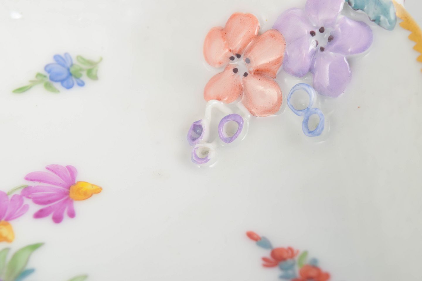 Saksisk blomst er en klassisk blomsterserie fra Royal Copenhagen, kendetegnet ved naturalistiske buketter, fine farvenuancer og forgyldte kanter. Serien var særligt udbredt i begyndelsen af 1900-tallet og blev produceret i et bredt udvalg af former, herunder dekorative serveringsfade med organiske konturer, hvor håndmalingen understregede det elegante og repræsentative udtryk.