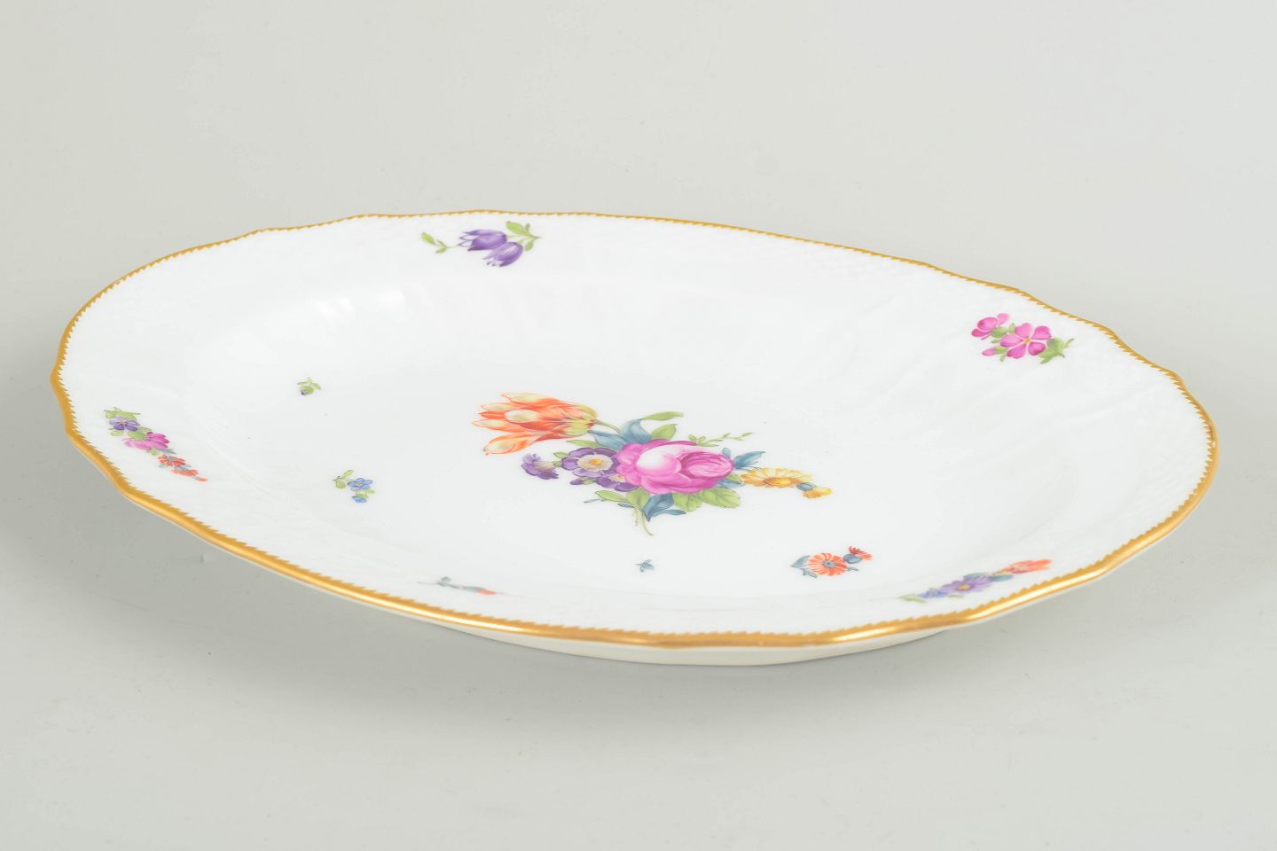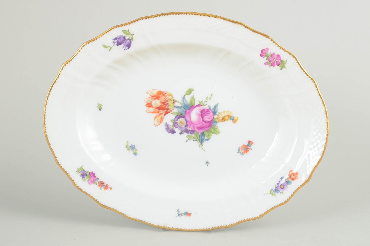Royal Copenhagen, Saksisk Blomst, ovalt serveringsfad.Stort ovalt serveringsfad i hvidglaseret porcelæn med håndmalet blomsterdekoration i serien Saksisk Blomst og forgyldt kant; model 4/1555.