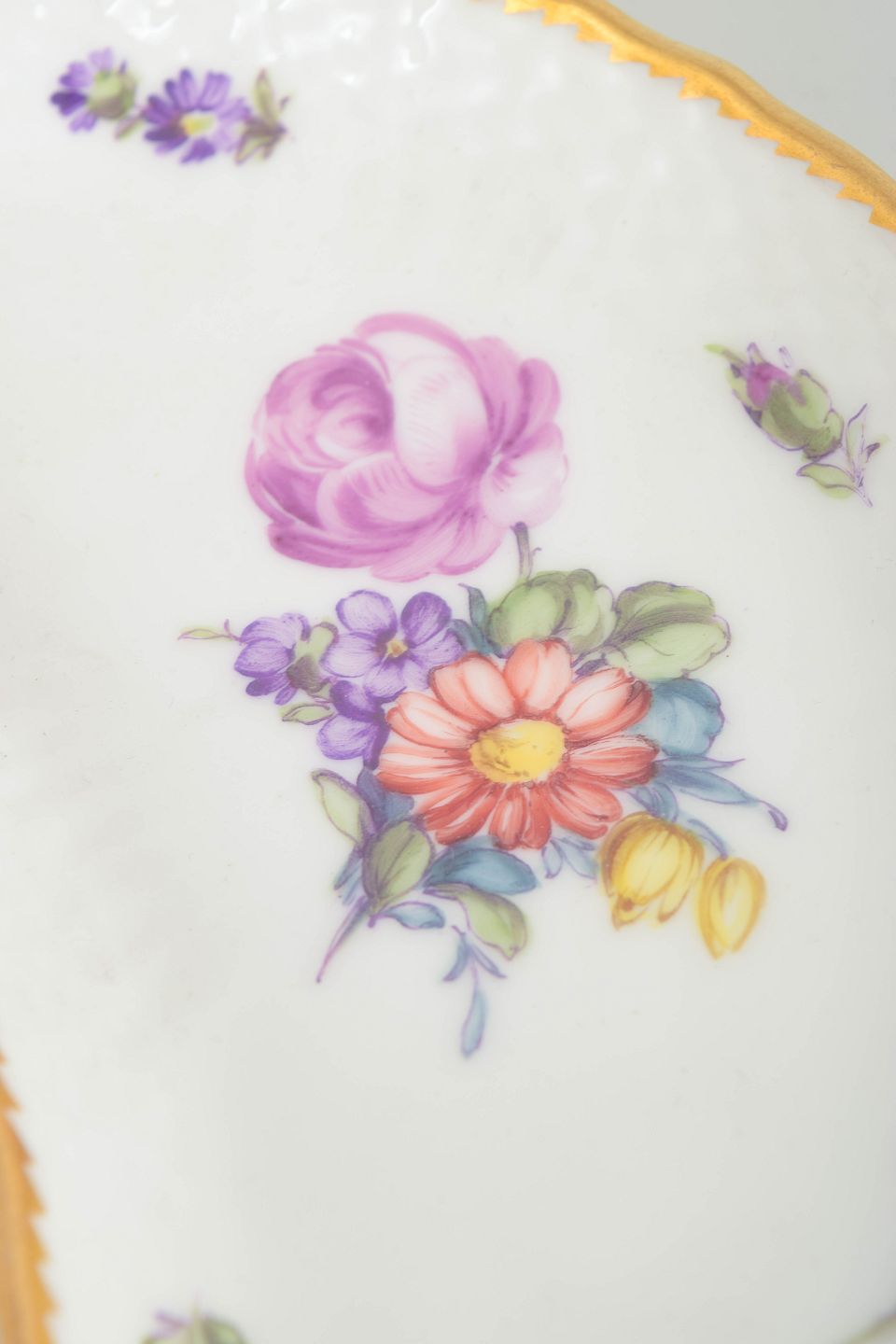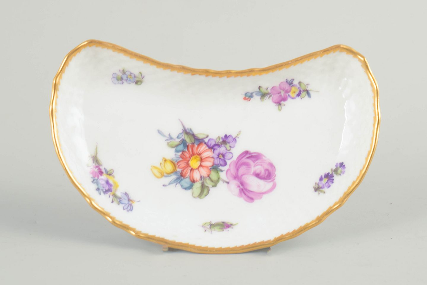 Royal Copenhagen, Saksisk Blomst fad.Buet fad i hvidglaseret porcelæn med håndmalet blomsterdekoration i serien Saksisk Blomst, indrammet af forgyldt kant; model 4/1466. 1. sortering, ca. 1910’erne.
