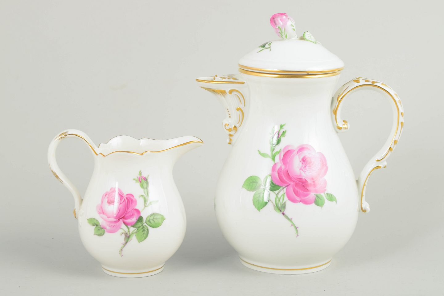 Meissen, lille kaffekande med låg og flødekande.Sæt bestående af lille kaffekande med låg og matchende flødekande i hvidt porcelæn med håndmalede lyserøde roser og forgyldte kanter. Elegante balusterformer med svungne hanke.