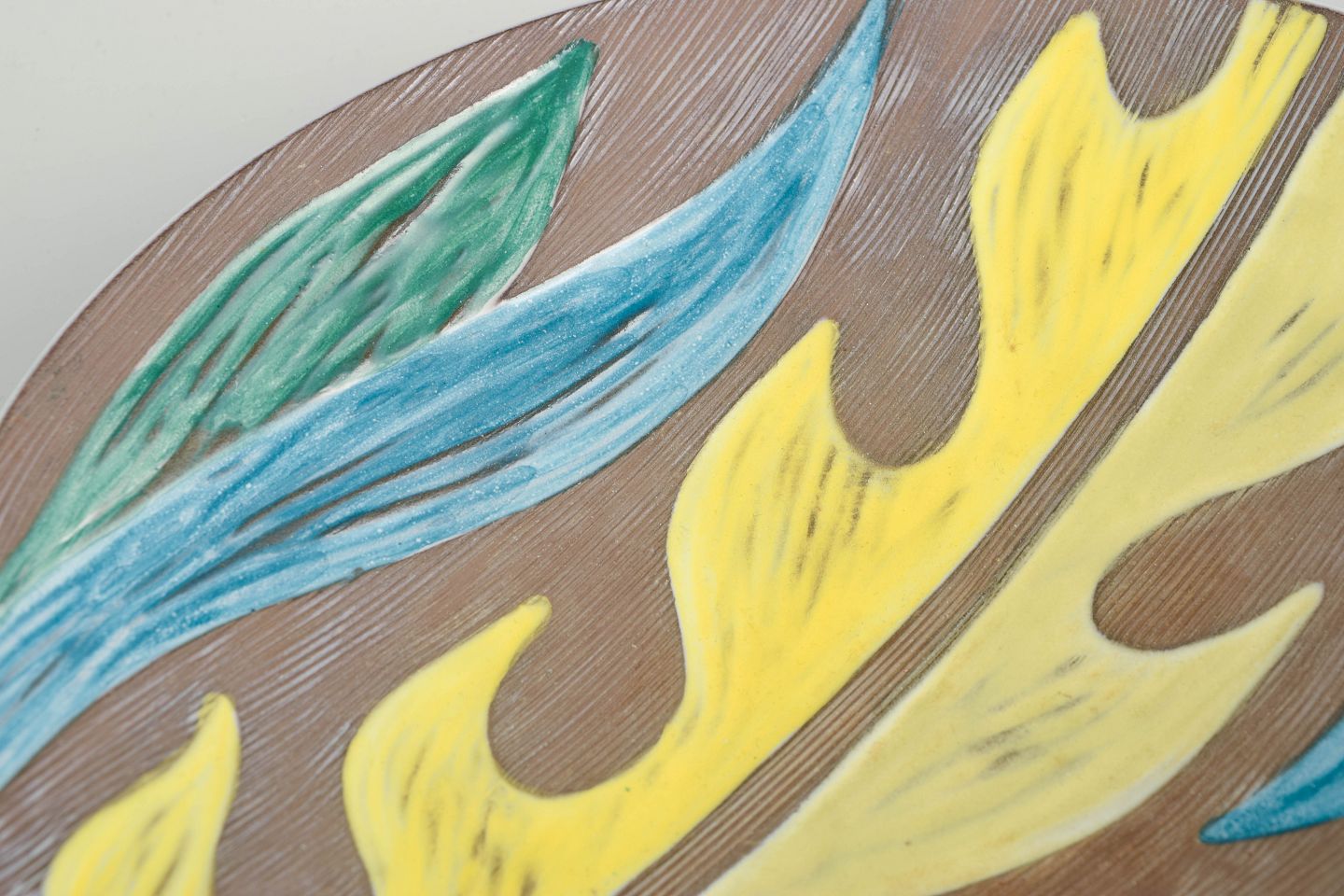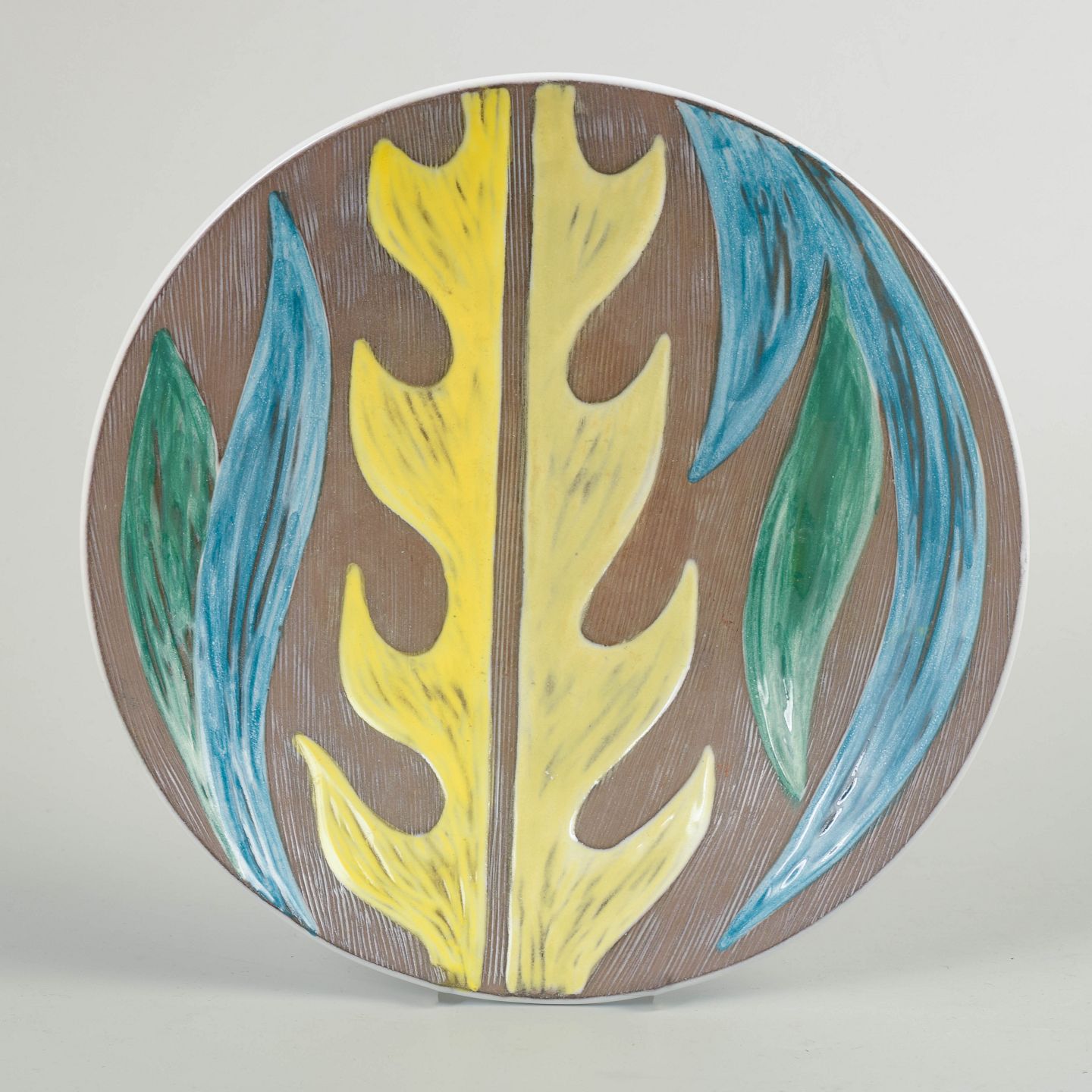 Mari Simmulson for Upsala Ekeby, skål “Agave”.Dekorativ rund skål i glaseret fajance med stiliseret agaveblad-motiv i gule, blå og grønne nuancer mod en rillet, brun baggrund. Reliefdekorationen er typisk for Mari Simmulsons grafiske og naturinspirerede formsprog fra begyndelsen af 1960’erne. Modellen er nummer 4445 og dateret 1961.