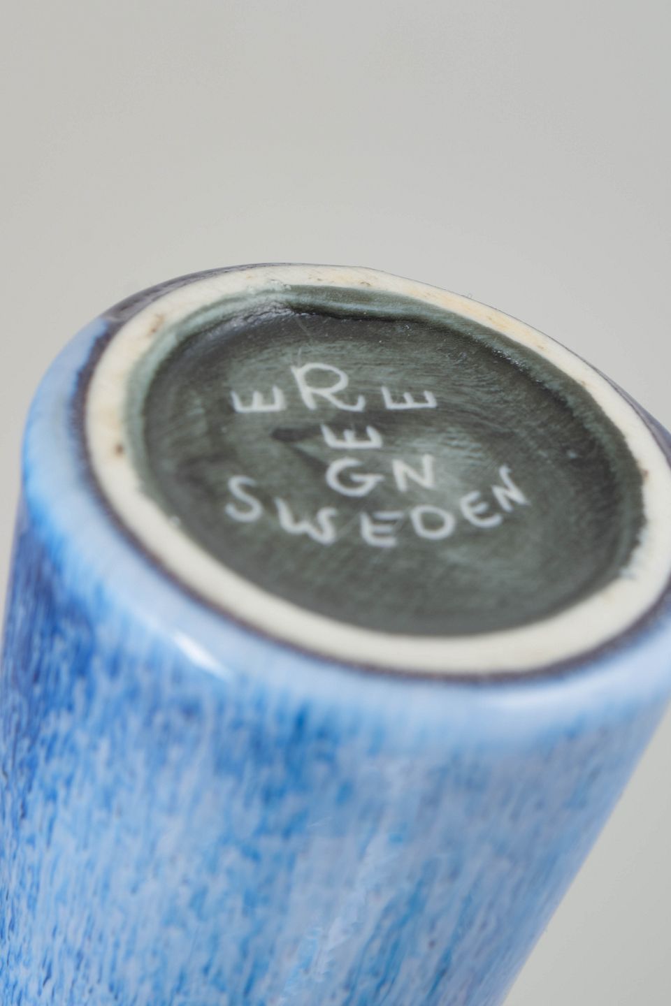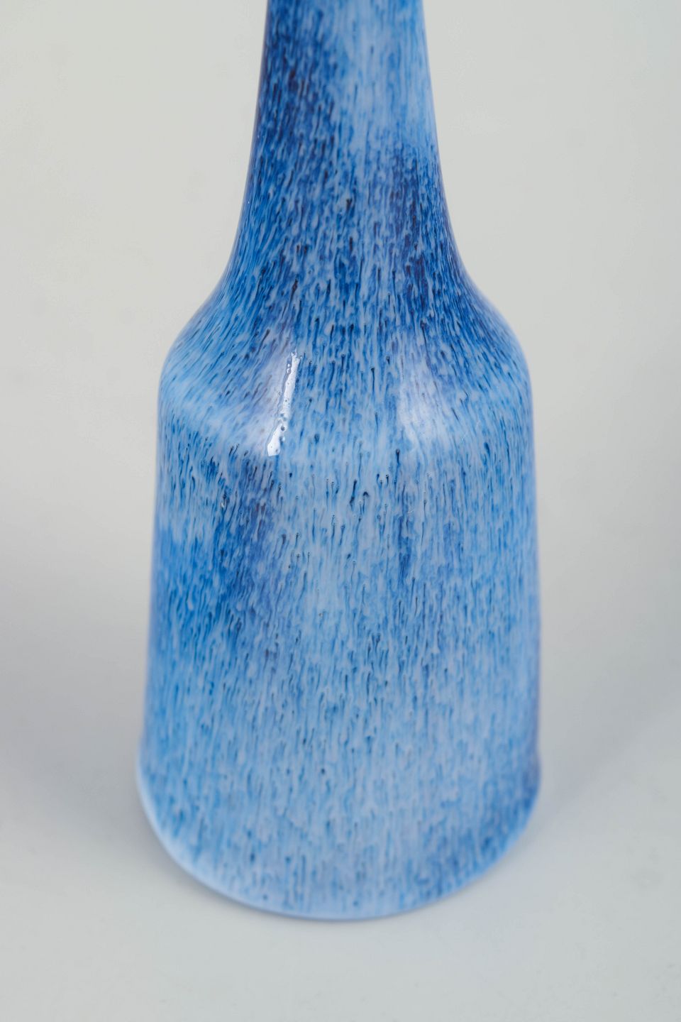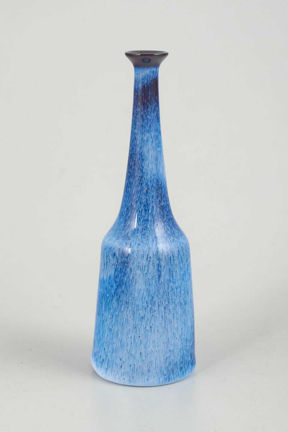 Gunnar Nylund for Rörstrand, vase.Slank vase i glaseret stentøj med lang, smal hals og let konisk krop. Overfladen er dækket af en levende blå glasur med fine lodrette spil og mørkere accent ved mundingen. Udført i første sortering og et fint eksempel på Gunnar Nylunds arbejde i mindre skala.