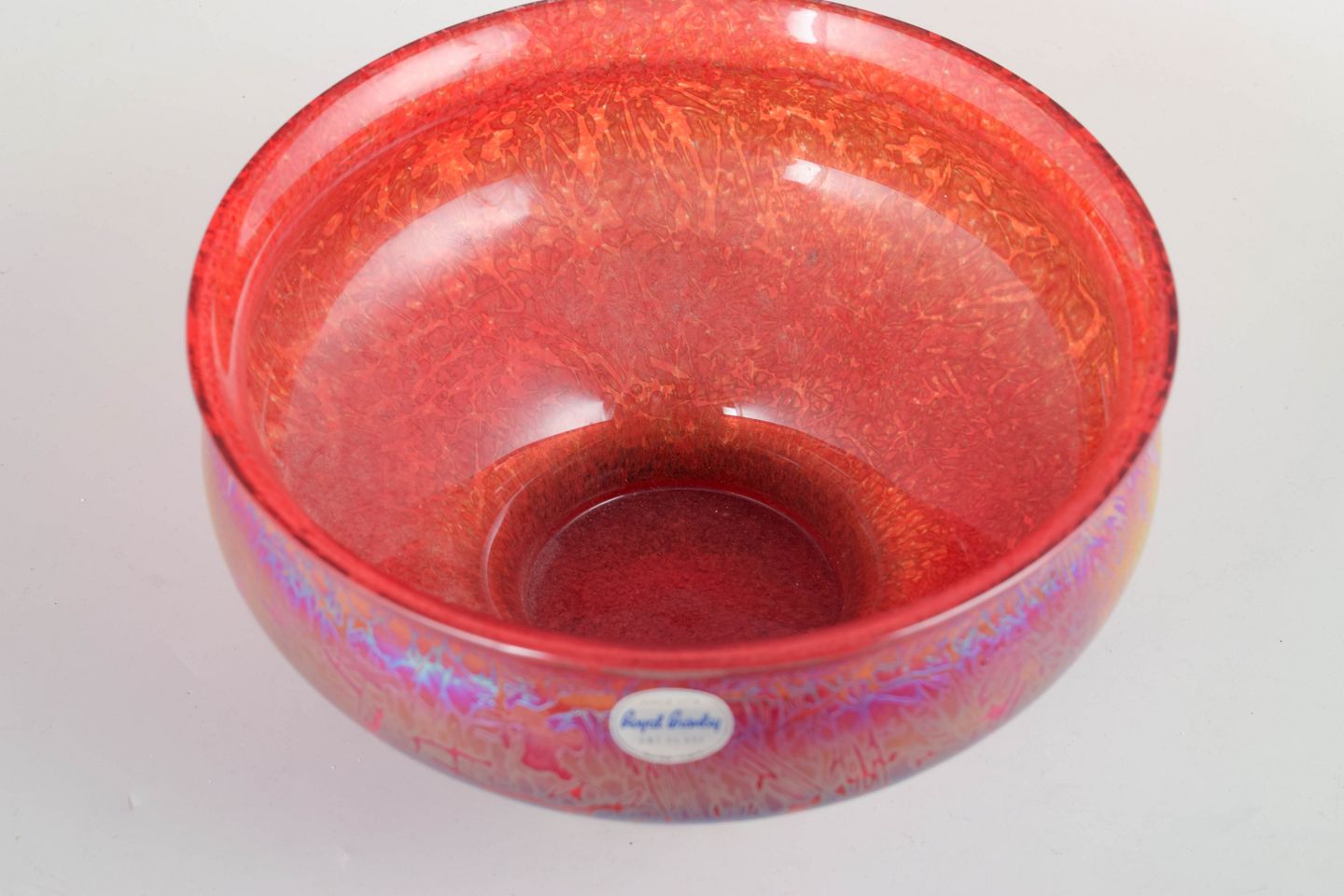 Royal Brierley iriserende kunstglas skål på fod – EnglandDekorativ Royal Brierley kunstglasskål fremstillet i England, slutningen af det 20. århundrede. Skålen har en elegant, vid åbning og står på rund fod.