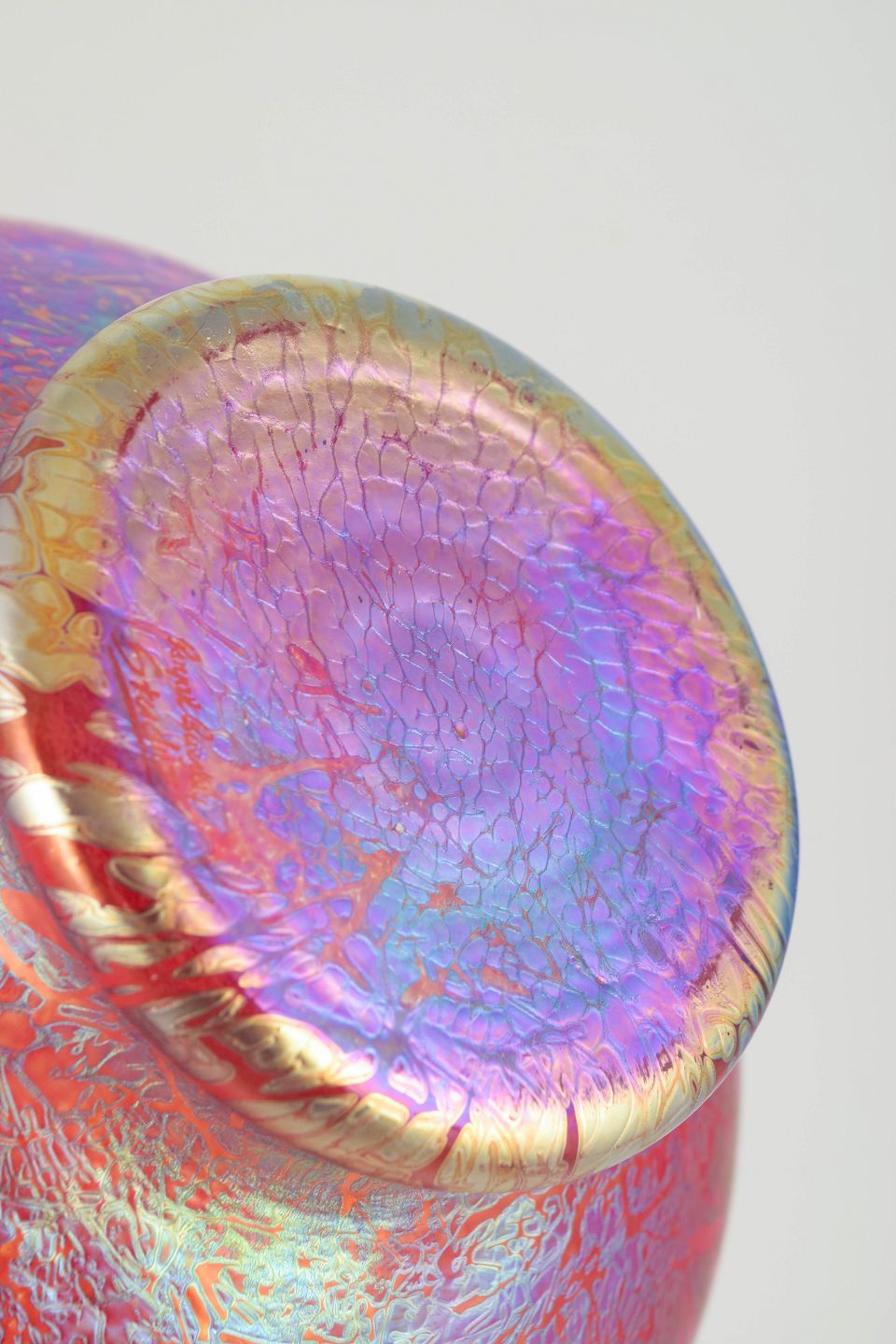 Overfladen fremstår med kraftig iriserende finish i nuancer af pink, guld, blå og violet. Under den metalliske glans ses en markant krakelé-effekt, som giver et levende og næsten olieskinnende udtryk. Et iøjnefaldende og dekorativt eksempel på Royal Brierleys senere kunstglasproduktion.