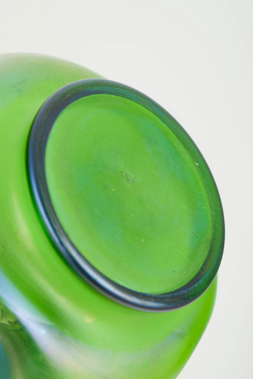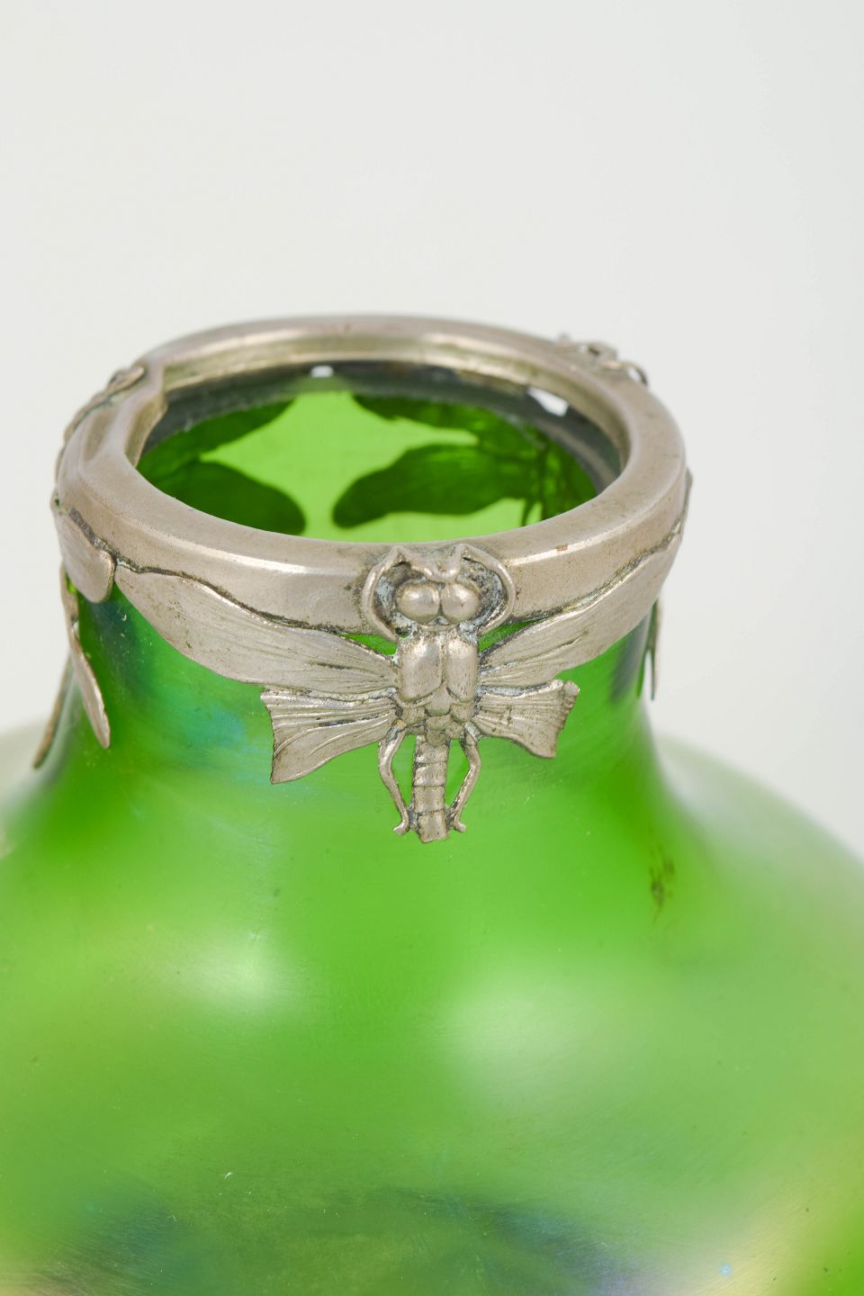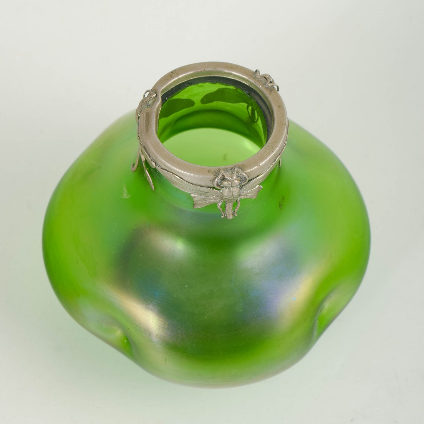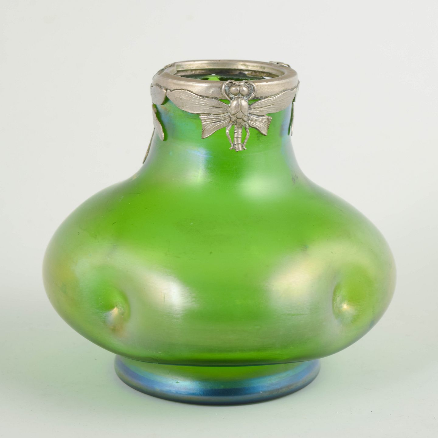 Lötz, Art Nouveau-vase med tinmontering.Art Nouveau-vase i iriserende kunstglas med klar grøn grundtone og blødt afrundede, organiske former. Lav og bred bug med let indtrukket hals, afsluttet med dekorativ tinmontering udført i et stiliseret, naturinspireret motiv. Overfladen viser et diskret farvespil med blålige nuancer mod foden, karakteristisk for perioden.