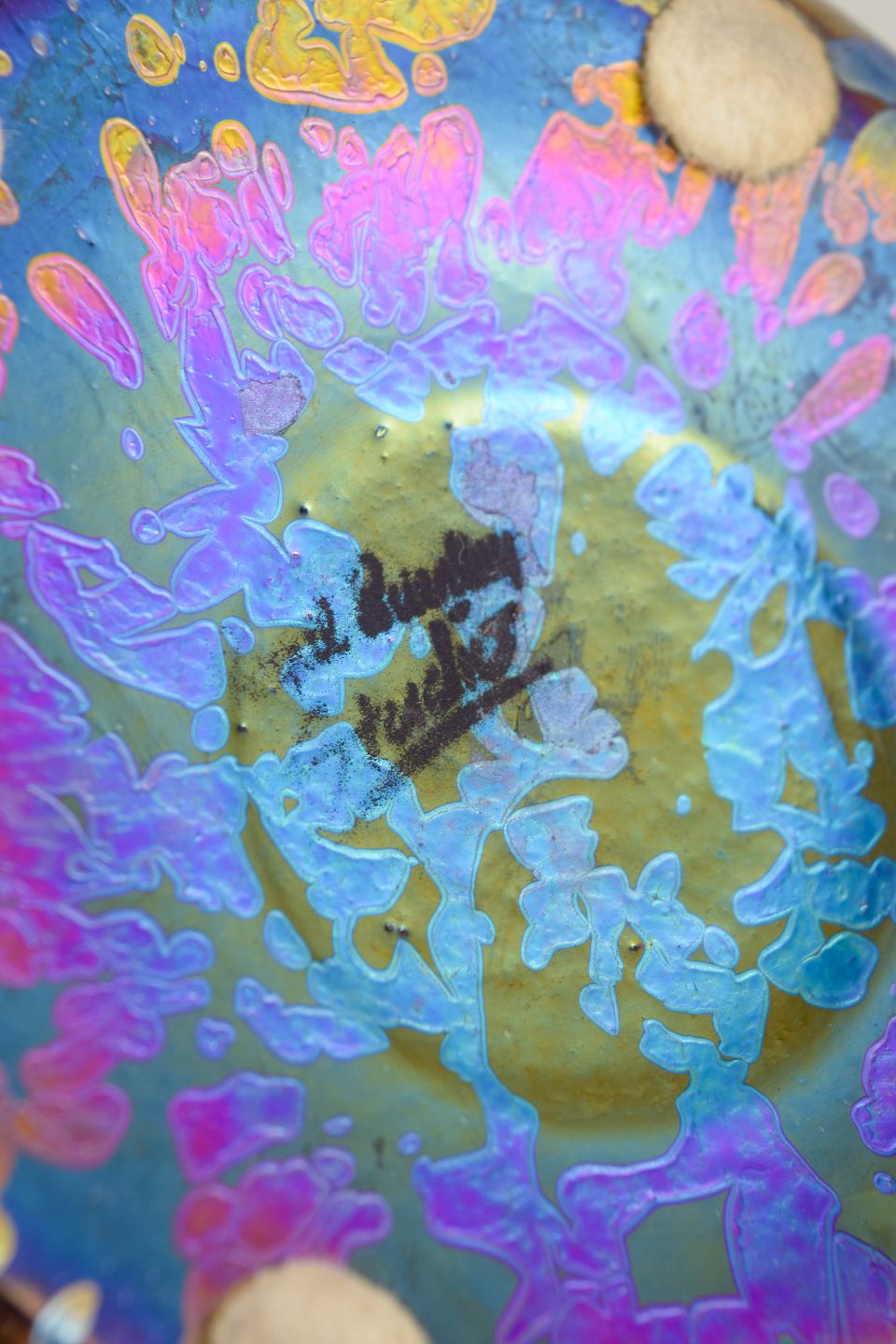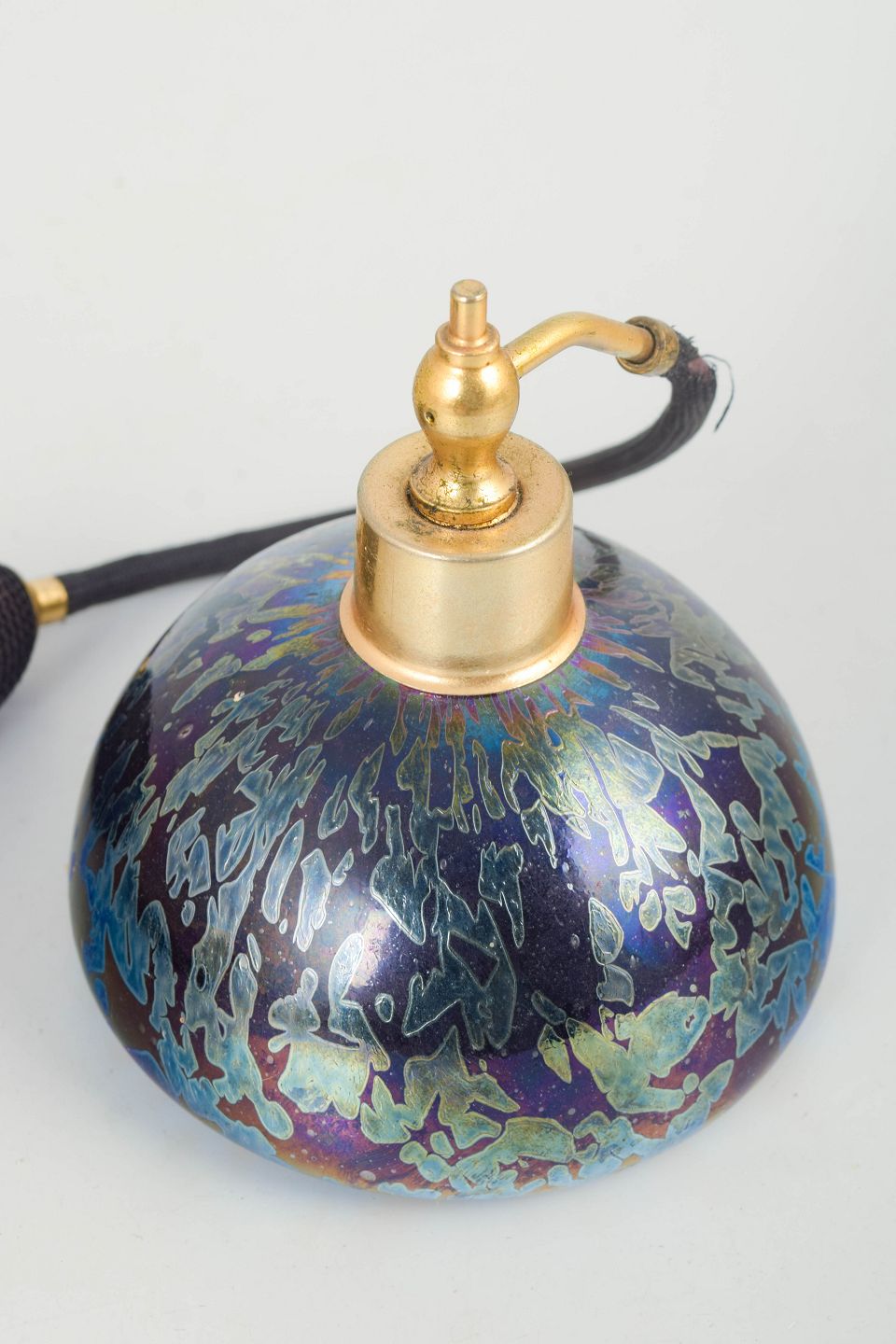 Art Nouveau parfume-forstøver.Art Nouveau parfume-forstøver i iriserende kunstglas med blåviolette og grønne nuancer samt organiske, flydende åremønstre. Kuppelformet krop med monteringer i metal og sort gummiballon med kvast. Modellen er udført som bordstående parfume-forstøver, hvor glassets farvespil og funktion forenes i et tidstypisk udtryk.
